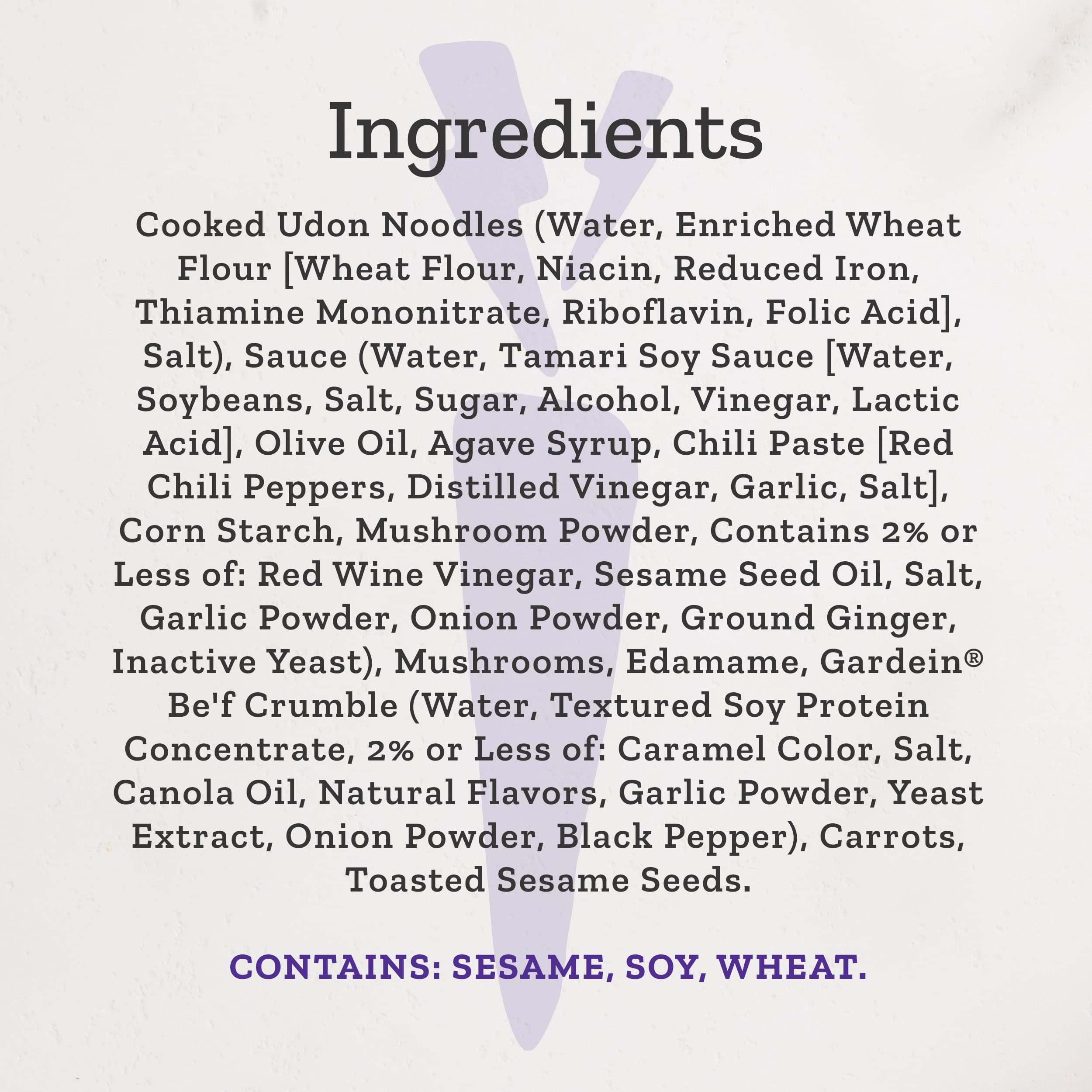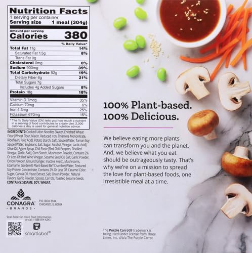 Make your taste buds happy and enjoy flavorful, delivery-service-quality vegan food anytime with this Purple Carrot Plant Based Be'f Udon Noodle Bowl. Savory and delicious, this frozen meal features plant based Be'f crumble and udon noodles with mushrooms, edamame, carrots and toasted sesame seeds in a stir-fry sauce. This microwave meal is non-GMO project verified, fits a plant based lifestyle and contains 18 grams of protein per serving. Follow the directions on the package for easy, outrageously tasty and satisfying plant based meals that are ready in minutes and perfect as frozen dinners and lunches whenever you want easy vegan meals. 100% plant based, 100% delicious. Pick up Purple Carrot frozen meals today, and enjoy gourmet goodness anytime.