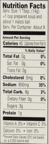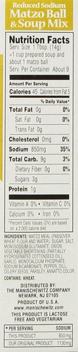 Reduced sodium: 25% Less than our original product. Kosher for Passover and all year round. Quality since 1888. Matzo Ball Soup is a delicious soup you can serve anytime. This product is lactose free and vegetarian.