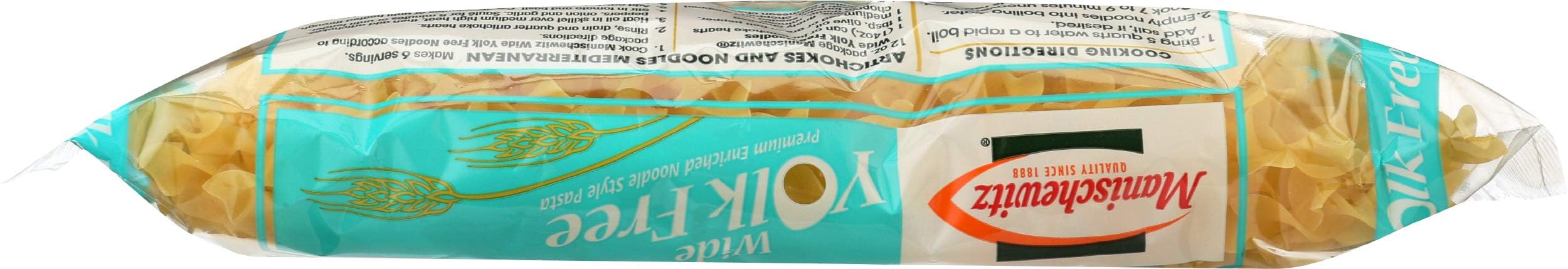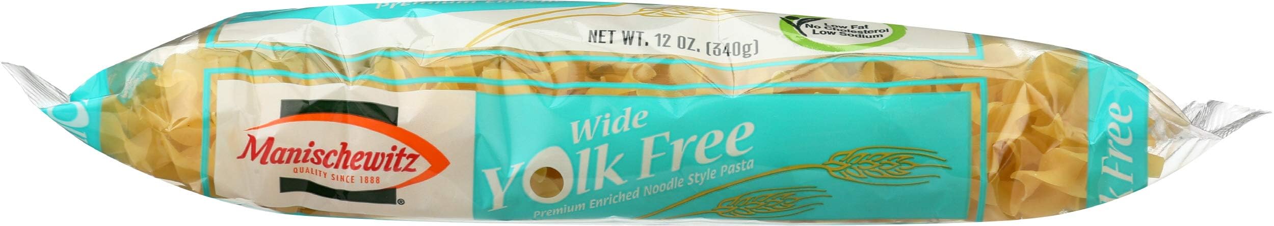 Manischewitz Yolk Free Wide Noodles comes in a 12 ounce bag. Our Noodles are slow cooked the old fashioned way for a fuller, richer flavor. No one ever thought we could do it but we even make egg, yolk-free, and whole grain noodles.