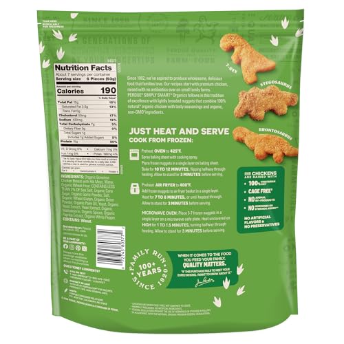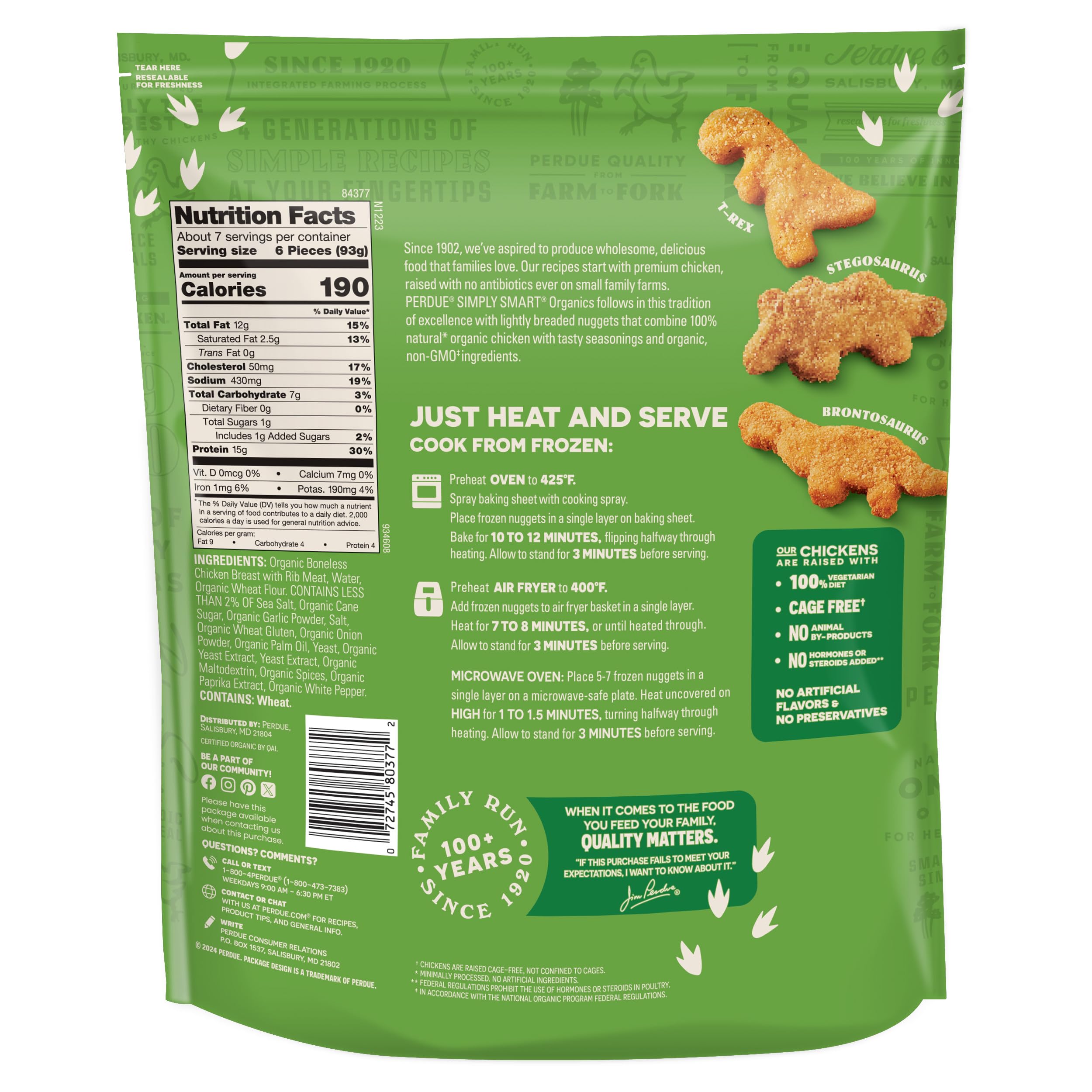 Keep it simple, smart and satisfying - PERDUE® SIMPLY SMART® Organics Lightly Breaded Dino-Shaped Chicken Nuggets are frozen and fully cooked for your convenience. Made with only organic, non-GMO ingredients you can recognize, they’re sure to make mealtime worth “roaring” about! Serve these kid-approved nuggets with your favorite dip, or even as a pasta topping! At PERDUE, we are hungry for better chicken and that means paying attention to all of the details, no matter how big or small. We believe our practices - like providing healthy feed and a happy environment for our chickens - lead to better-tasting chicken. And we think you will agree: take one bite and taste the difference that comes from our relentless pursuit of better-tasting chicken.