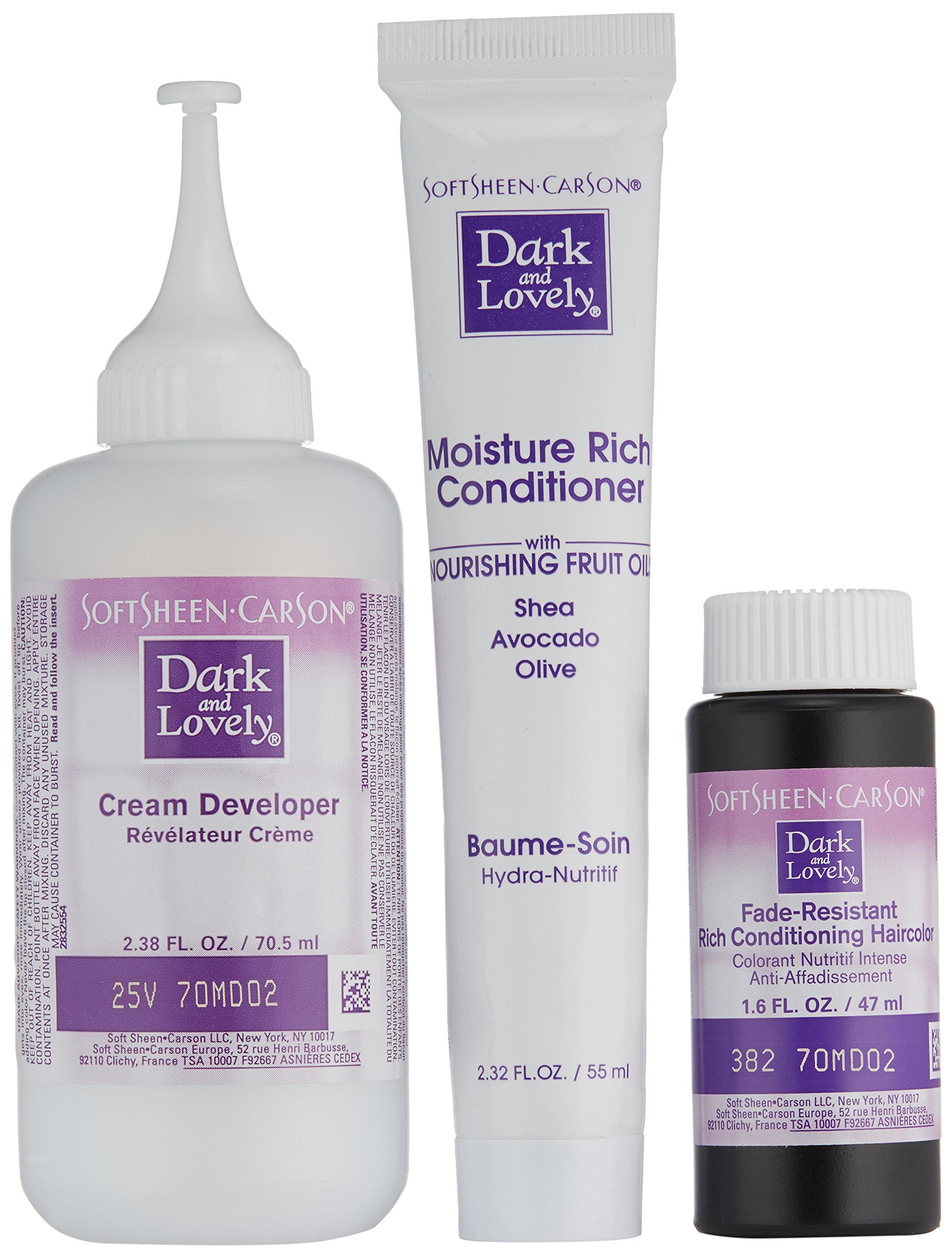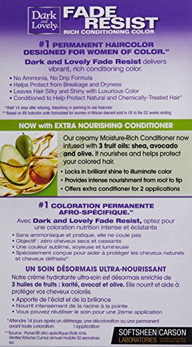 Fade-Resistant Rich Conditioning Color is an innovative formula that delivers vibrant, fade-resistant color and shine. This formula contains Dark and Lovely's exclusive Moisture Seal technology for double the conditioning power —especially designed to help protect relaxed and natural hair while coloring. The result is silky, shiny hair and luxurious, rich color. • Color so rich, so ultra-conditioning it lasts for up to 8 weeks • Helps protect relaxed and natural hair while coloring • Permanent non-drip hair color with 100 percent gray coverage • With extra nourishing conditioner infused with 3 fruit oils - shea, avocado and olive - to provide intense nourishment Always read all product labeling and instructions completely prior to use. Important: Haircolor can cause an allergic reaction. Do not use if you’ve already had a reaction to a haircolor product or if scalp is sensitive, itchy or damaged. Tattoos may increase risk of an allergic reaction. Do skin allergy test 48 hours before each use of this product. Don’t use over compound henna or progressive color. Wait at least 14 days after bleach, relaxing or perm before use. Don’t use on children. This is a safety summary. Read all labeling and instructions completely.