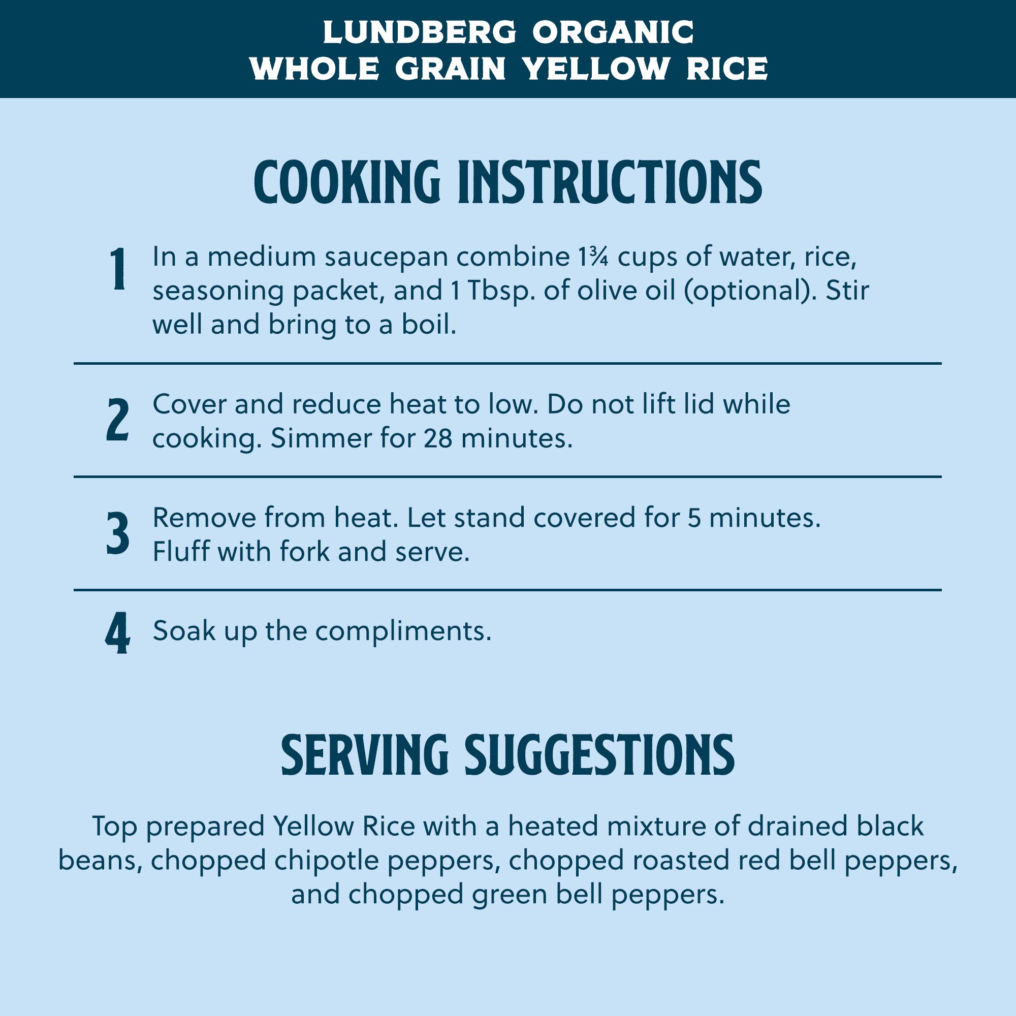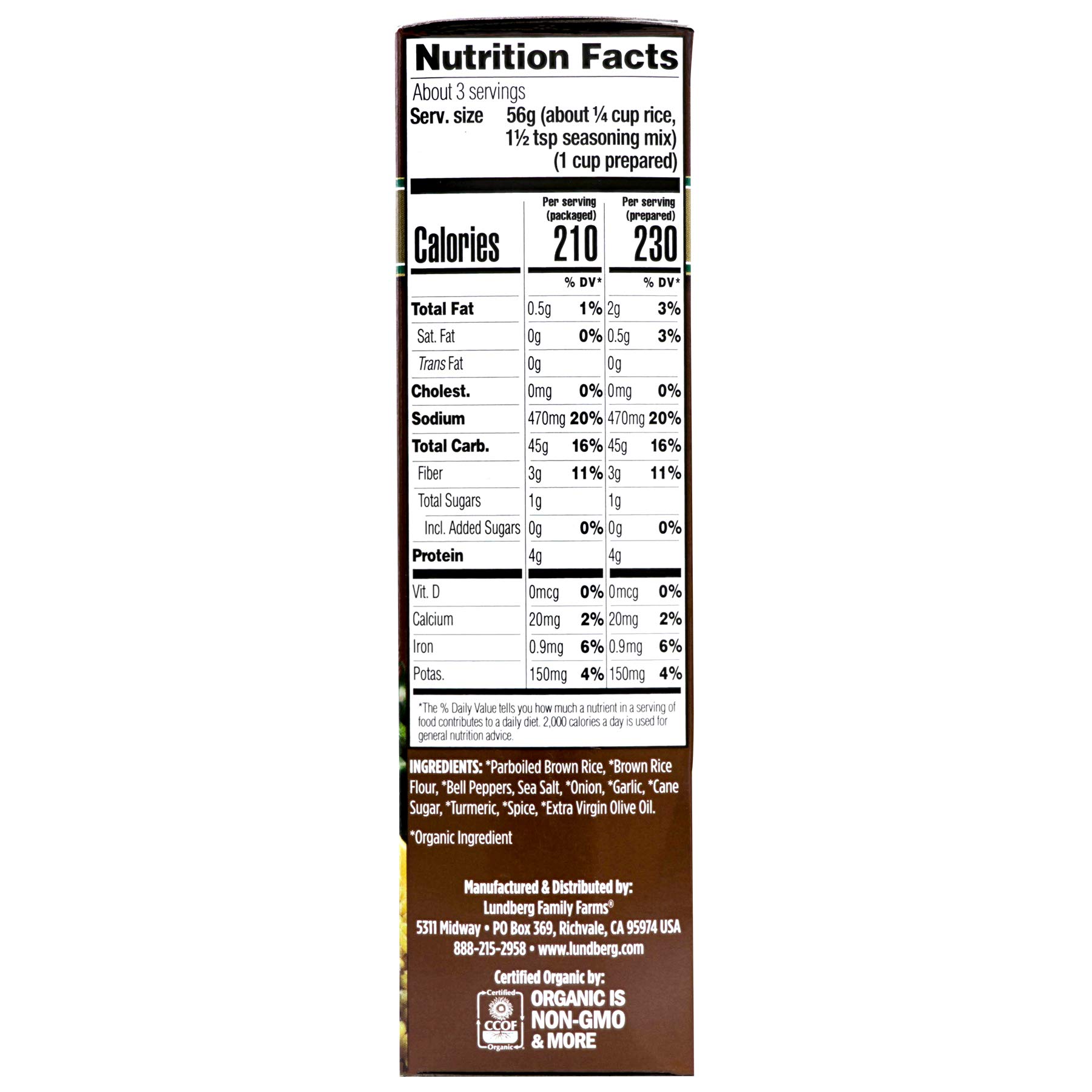 Since 1937, Lundberg Family Farms has been growing wholesome, great-tasting rice while tending to soil, air, water, and wildlife as carefully as our crops. Some people say we're a bit unconventional. But doing things our way—sustainably at every step—allows us to make better food for your table while leaving a better world for the next generation. Grown with earth-preserving practices, our 20+ rice and quinoa varieties are cultivated to maximize the flavor of each tiny grain. Long, short, black, brown, white, red, and blended. Each variety brings something different to the table so you can get creative in the kitchen. Enjoy the whole-grain goodness of our Lundberg Organic Whole Grain Yellow Rice. Famed for its vivid yellow hue and savory flavor, Yellow Rice is a tasty dish that pairs well with any meal. You’ll love the spicy aroma and colorful flair of turmeric blended with bell peppers and brown rice. Create an exciting dining experience with convenient, versatile Organic Whole Grain Yellow Rice. Made with delicious organic brown rice and flavorful ingredients, it’s easy to serve up a healthful side dish. Hungry for more? Look for other great-tasting side dishes, entrees, snacks, and packaged rice and quinoa varieties from Lundberg Family Farms. Good from the grain up!
