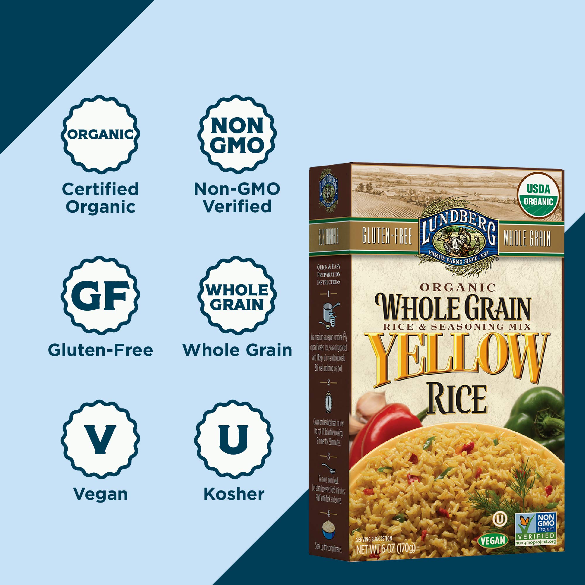 Lundberg Family Farms - Organic Whole Grain Yellow Rice, Savory Blend, Side Dish, Pantry Staple, 100% Whole Grain, Non-GMO, Gluten-Free, USDA Certified Organic, Vegan, Kosher (6 oz, 6-Pack)