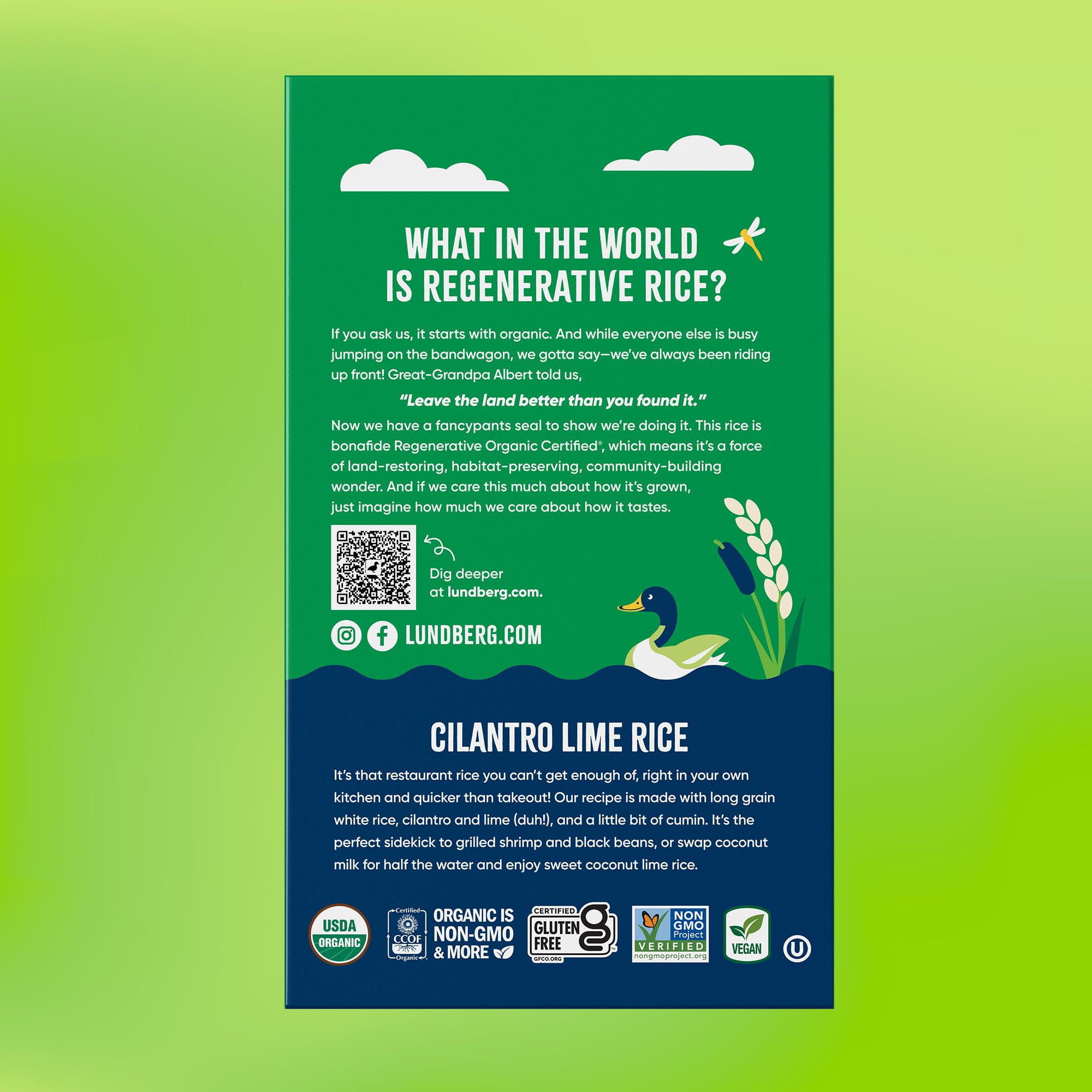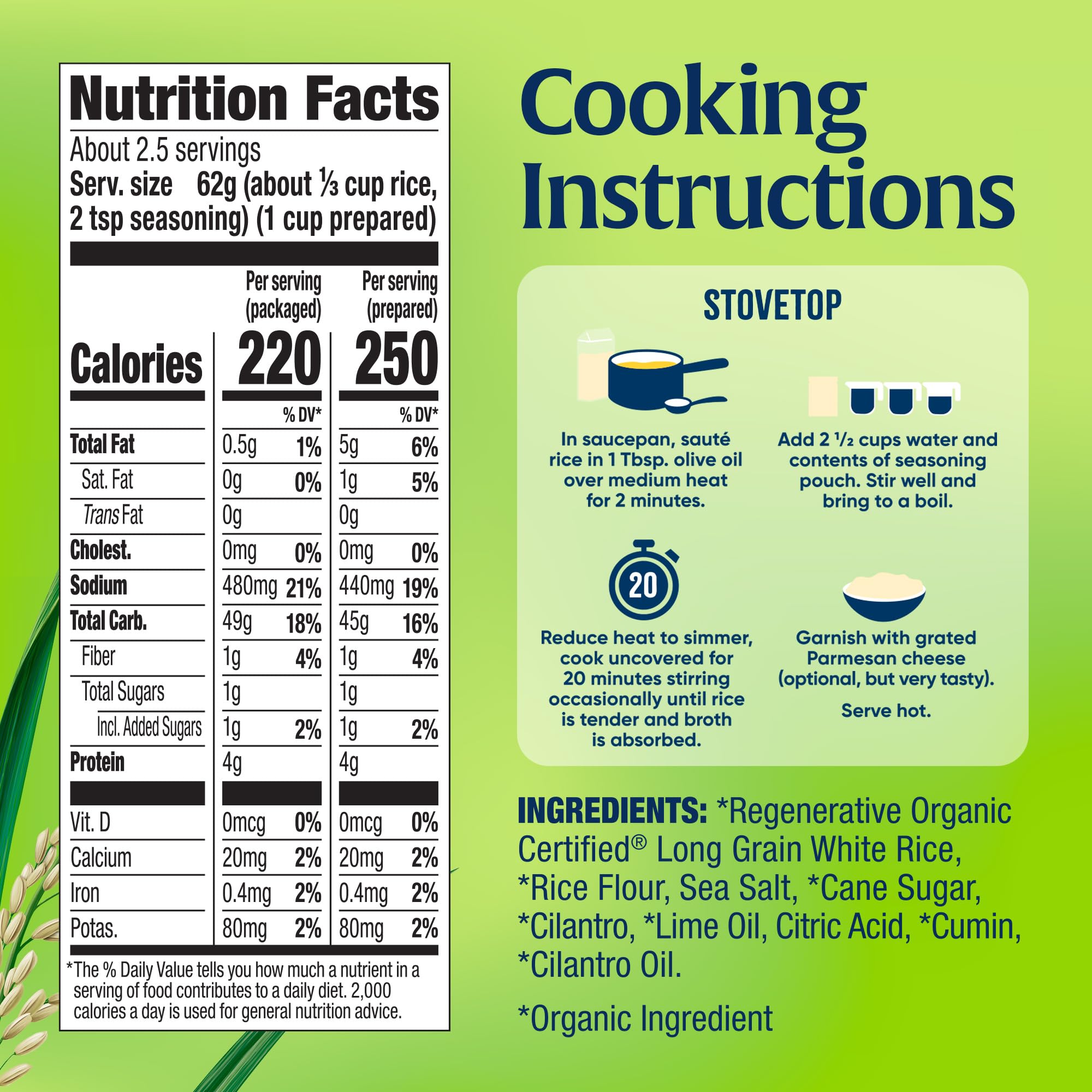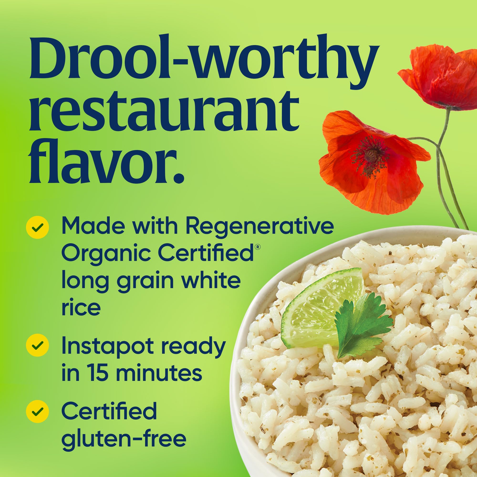 t's that restaurant rice you can't get enough of, right in your own kitchen and quicker than takeout! Our recipe is made with Regenerative Organic Certified® long grain white rice, cilantro and lime (duh!), and a little bit of cumin. It’s the perfect sidekick to grilled shrimp, black beans, and pico de gallo, if we do say so ourselves.