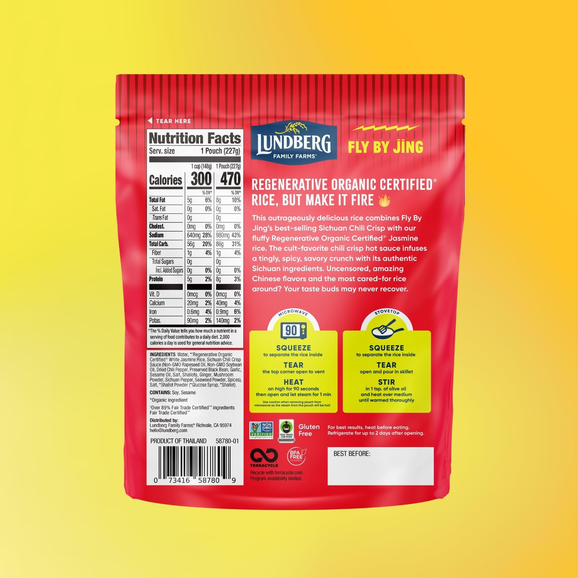 Lundberg X Fly By Jing Chili Crisp Rice – Microwave Ready in 90 Seconds, Regenerative Organic Jasmine Rice with Chili Crisp Seasoning, Gluten-Free, 8oz Pouch
