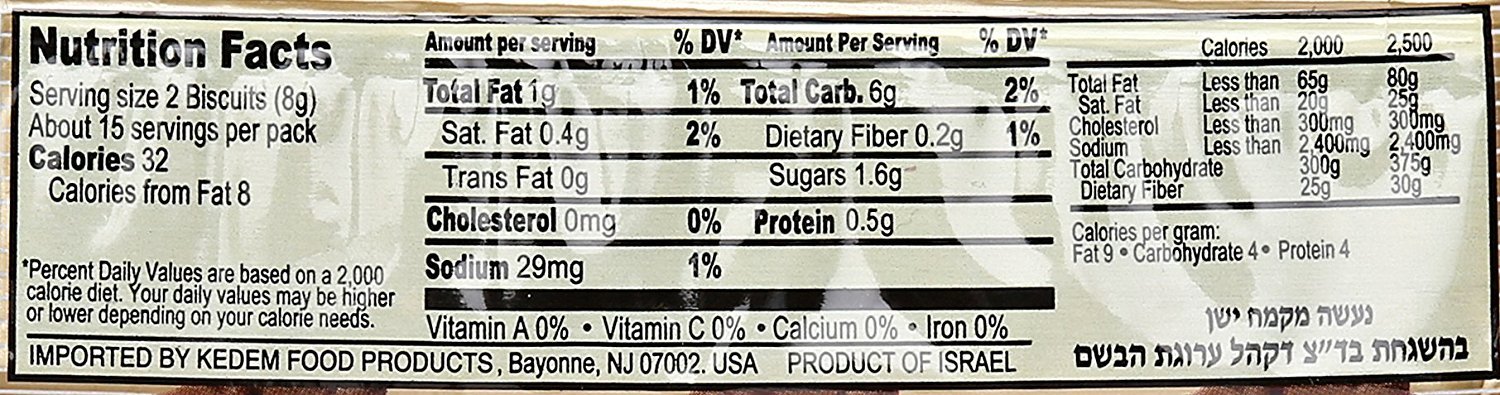 Kedem's Chocolate flavored Tea Biscuits, 4.2 ounce package is the most basic and essential chocolate flavored tea biscuit snack for snackers of all ages. These delicious cookies are a great treat for the entire family and can be enjoyed with tea, coffee, cold milk, orange juice, apple juice or on their own. The handy package size allows you to pack it along as a snack for work, the playground, a movie and anywhere you may go. Each bag contains approximately 30 cookies enough to keep you munching. Crush them and use as pie crusts or toppings on pies or ice cream. These tasty treats are good for a tea party, lunch, movies or an after school snack. Each package contains 4.2 ounces.They are free of food coloring, cholesterol and trans fats so you can enjoy them worry free. Certified kosher by the OU and Arugath Habosem. Kemach Yoshon. Ingredients: wheat flour, sugars, vegetable shortening (contains one or more of the following oils: soybean, palm, canola sunflower), corn starch, food coloring (caramel), cocoa powder, baking powder (sodium bicarbonate and ammonium bicarbonate), lecithin (soy based), sodium metabisulfite, salt, artificial flavors, sodium acid pyrophophate, natural antioxidant (rosemary oil). Contains wheat and soy. Processed on equipment where sesame is used. Produced on a nut free production line.
