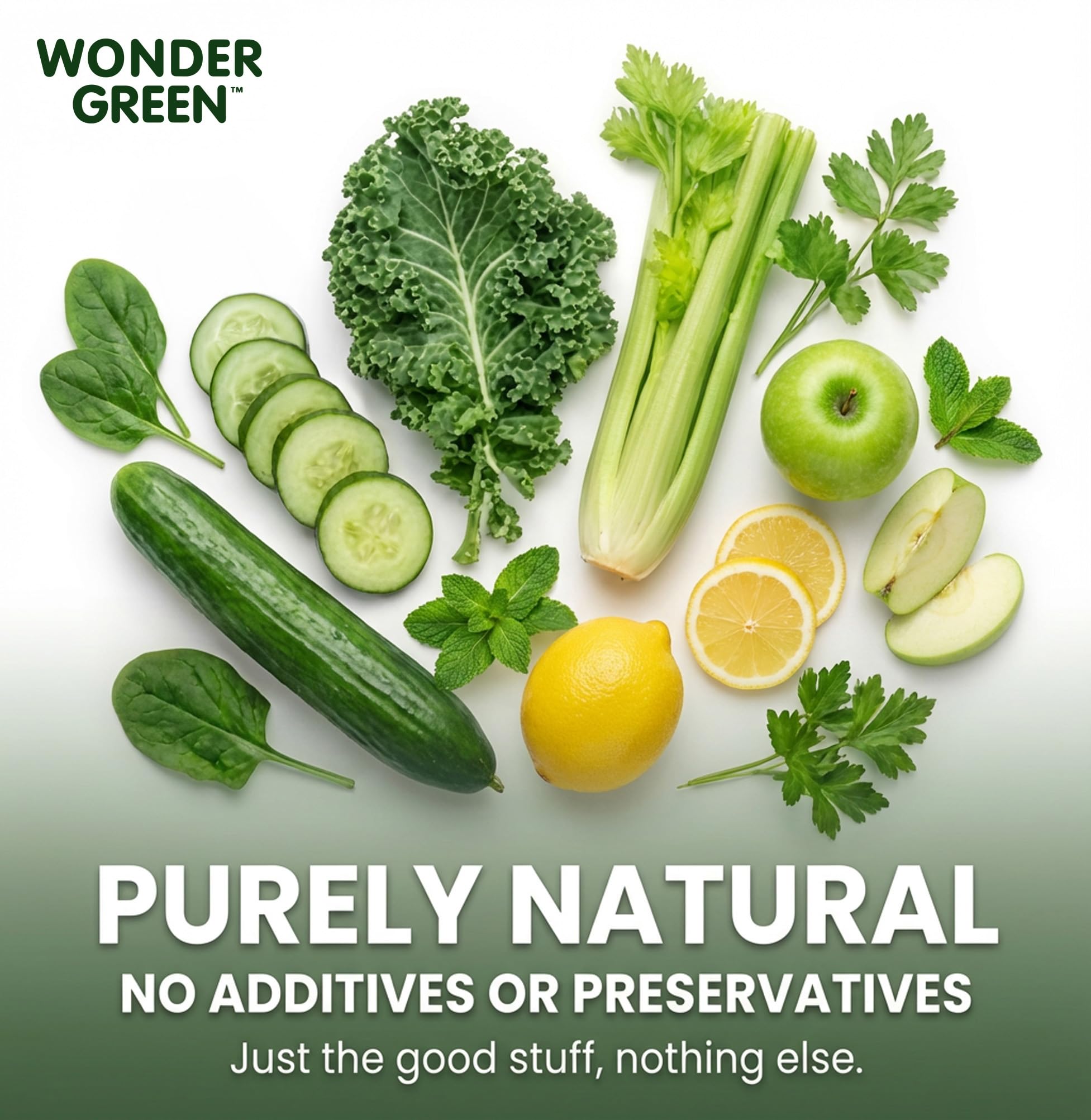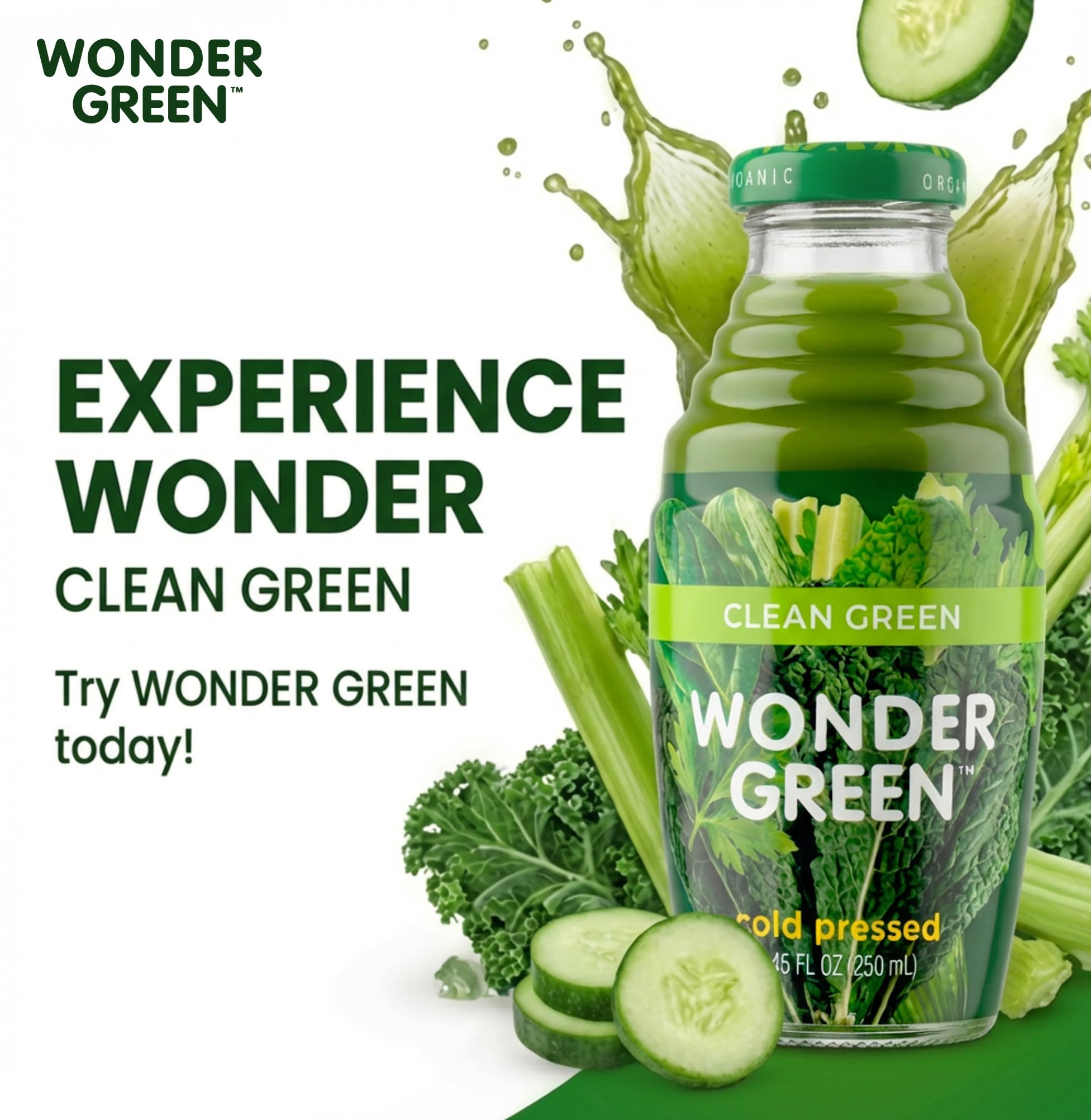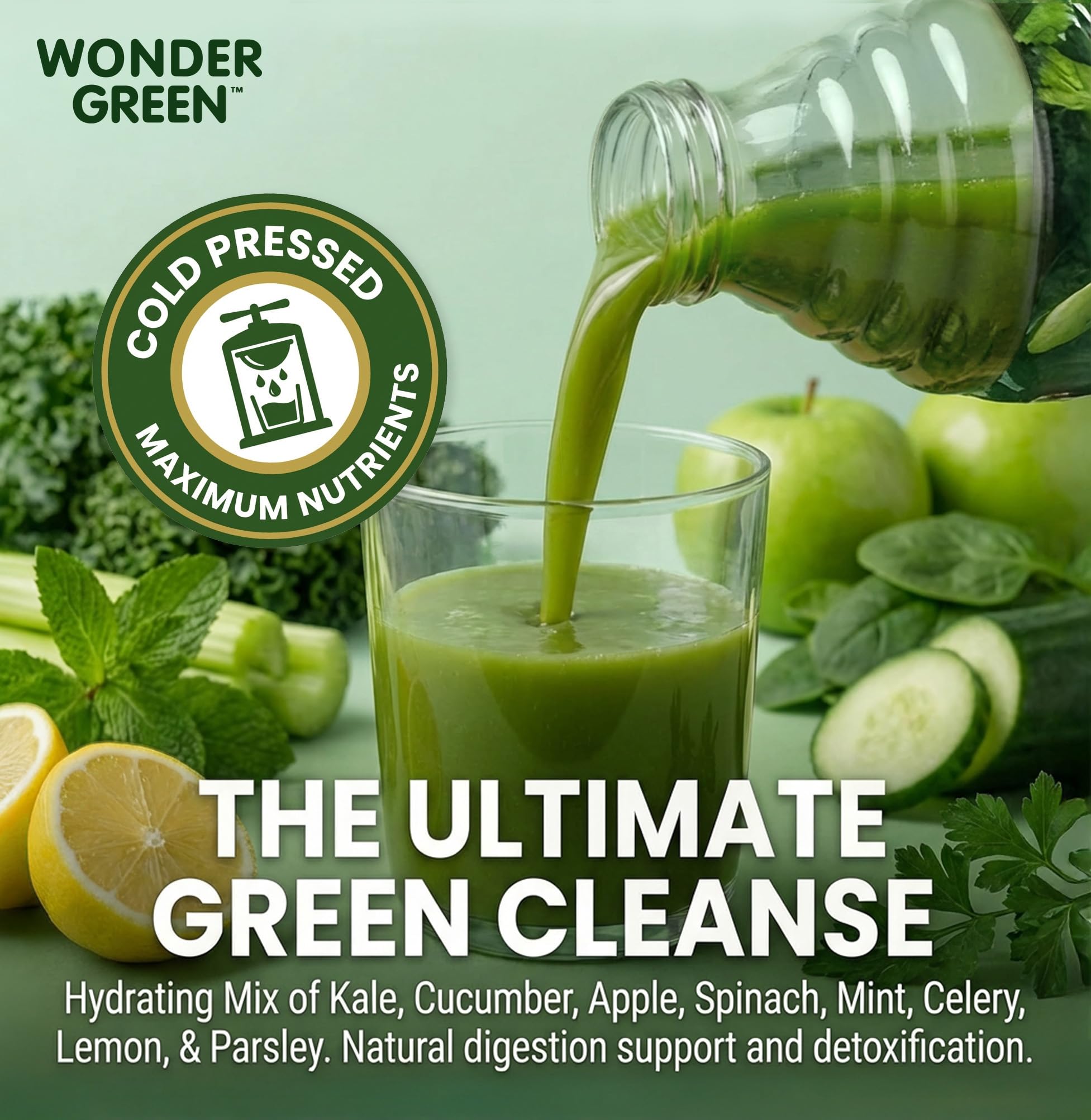 Elevate your daily routine with the crisp, rejuvenating taste of Wonder Green Clean Green. This expertly crafted, cold-pressed blend is a vibrant mix of nature's best greens, highlighted by the hydrating freshness of cucumber and a touch of sweetness from apple. Every sip delivers the powerful nutrients of kale, spinach, celery, and parsley, perfectly balanced by a refreshing hint of mint and a squeeze of lemon. Itβs the ultimate way to get your daily dose of green goodness.