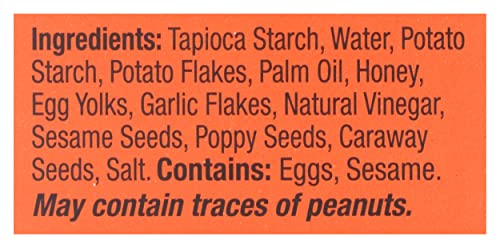 Nibble away on healthy, gluten-free flatbreads for every occasion. These crackers are light, easy to digest, and tasty. We start with all natural wholesome ingredients such as tapioca, potatoes, and eggs. For added taste, we blend in honey, salt, and vinegar. Our delicious gluten free crackers are crispy and irresistible. They are uniquely make from potatoes instead of soy, corn, or rice, and they are absolutely, positively 100% gluten free! Please note: Absolutely Crackers and Flatbreads are NOT Kosher for Passover. Ingredients include: Tapioca starch, water, potato starch, potato flour, palm oil, natural vinegar, honey, egg yolks, salt, garlic flakes, caraway seeds, poppy seeds, sesame seeds. Contains Eggs.