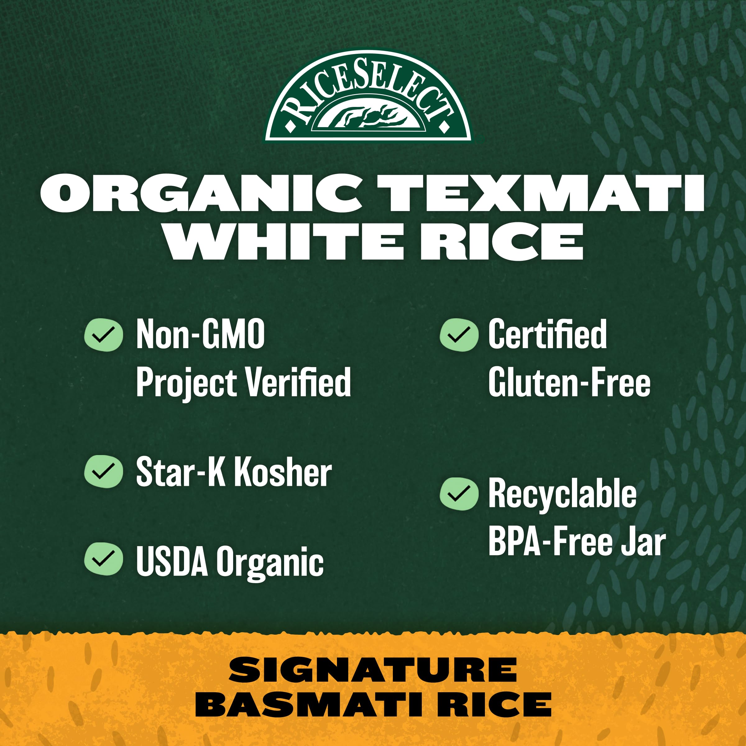 RiceSelect Organic Texmati White Basmati Rice, Premium Non-GMO Gluten-Free Long-Grain White Rice, 32-Ounce Jar