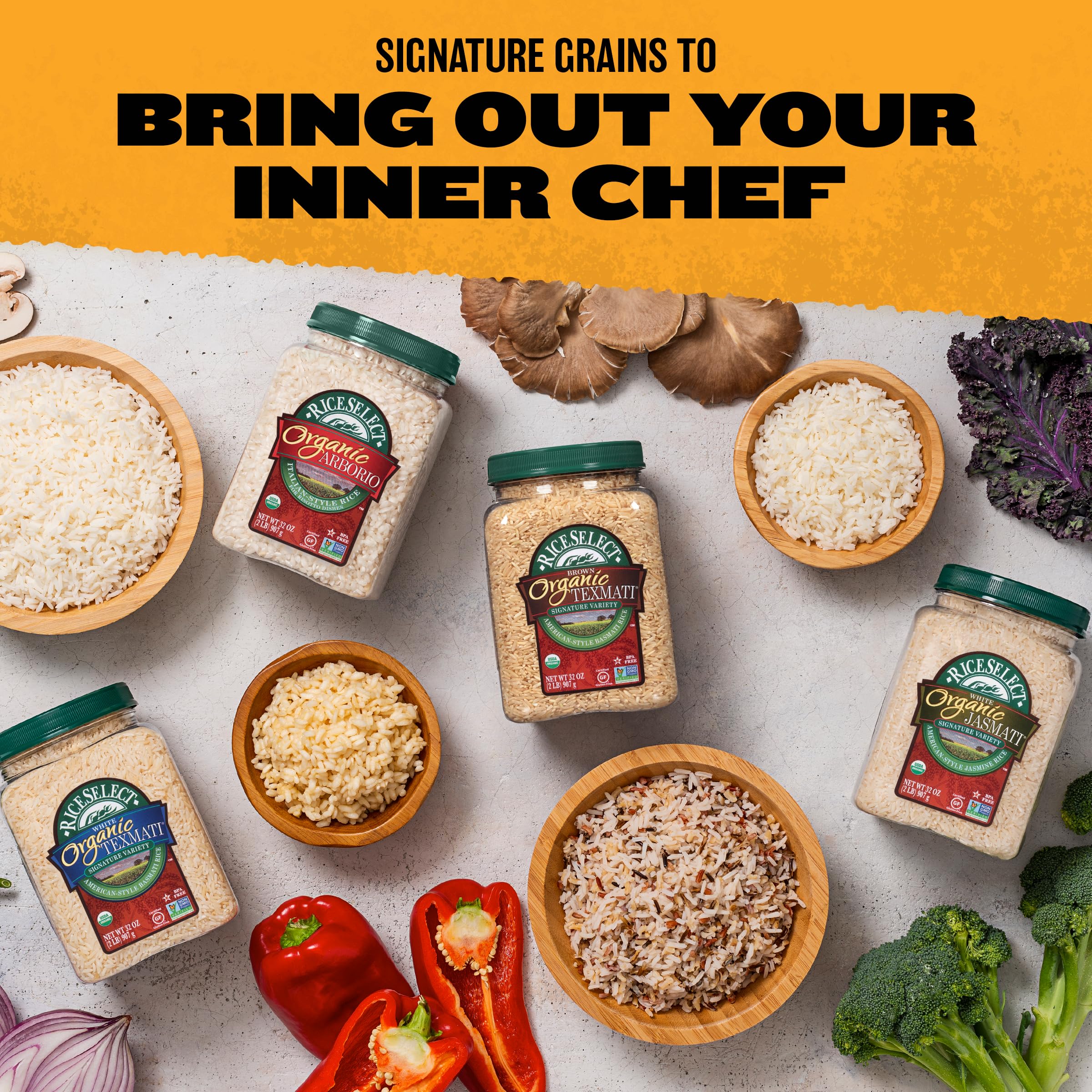 Our Signature line of organic rice products features unforgettable aromas, textures, and tastes, so every creation lives up to your signature culinary standard. RiceSelect organic Texmati rice is made from an agricultural hybridization of long-grain white rice and basmati rice for an American-style rice variety. This unique hybrid grain features a captivating aroma (many compare the smell to that of freshly popped popcorn), an unexpected texture, and a welcoming nutty flavor, making it the right rice for reinventing familiar flavors in exciting ways. Served in our iconic transparent jar, our organic Texmati rice offers an impressive, eclectic array of culinary possibilities.