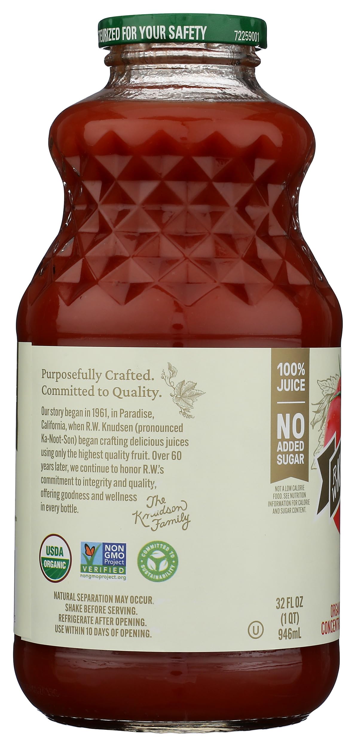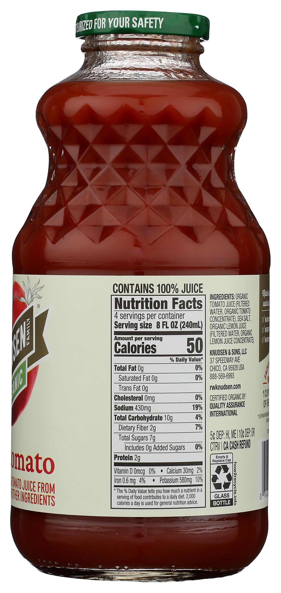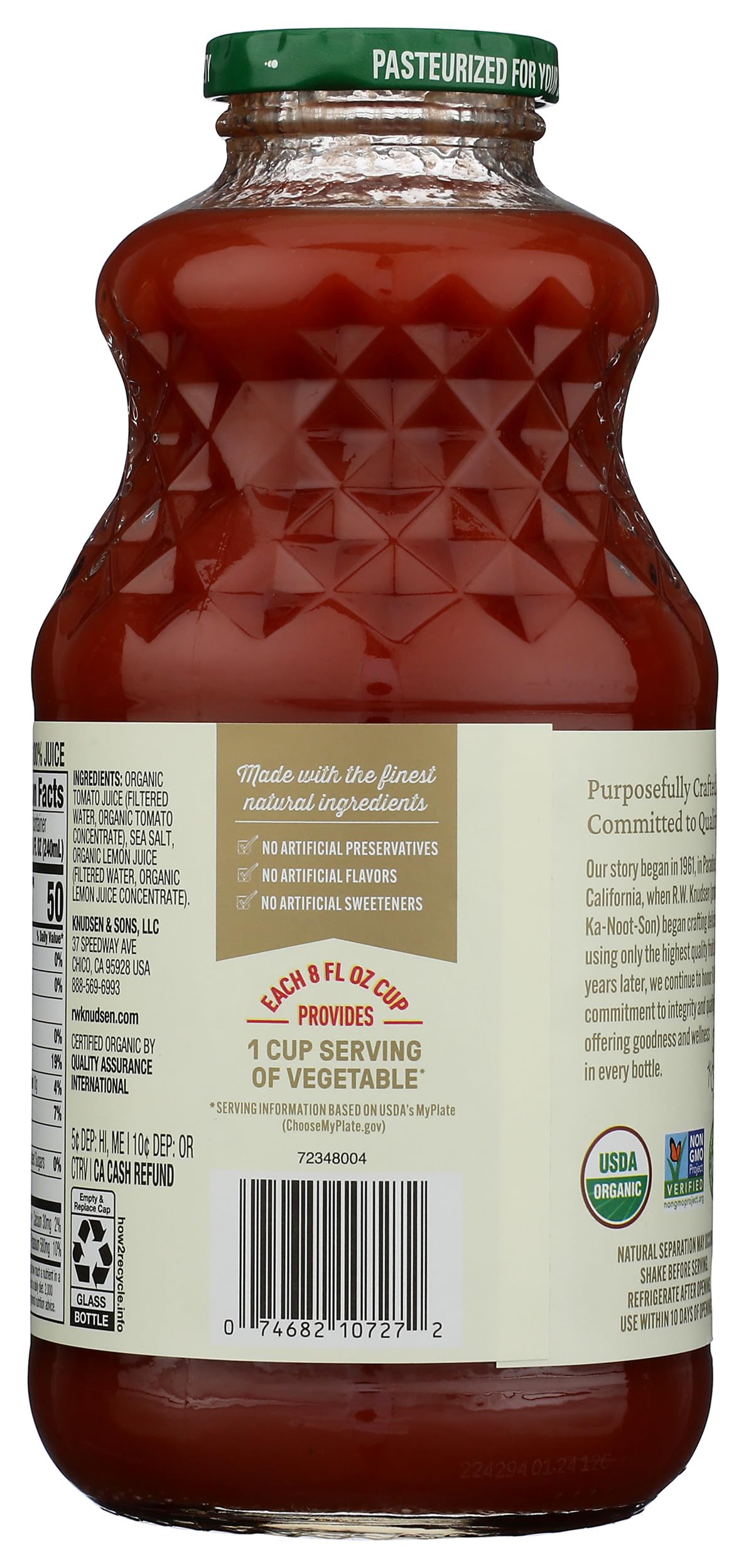 R.W. Knudsen Family puts a savory spin on the typical juice with their vibrant veggie beverages. R.W. Knudsen Family Organic Tomato Juice has a balanced tomato flavor. This 100% juice is Non-GMO Project Verified and Certified USDA Organic. R.W. Knudsen Family Organic Tomato Juice is the perfect way to start your morning, but it's also a flavorful addition to your favorite soups, sauces, and Bloody Mary recipes.
