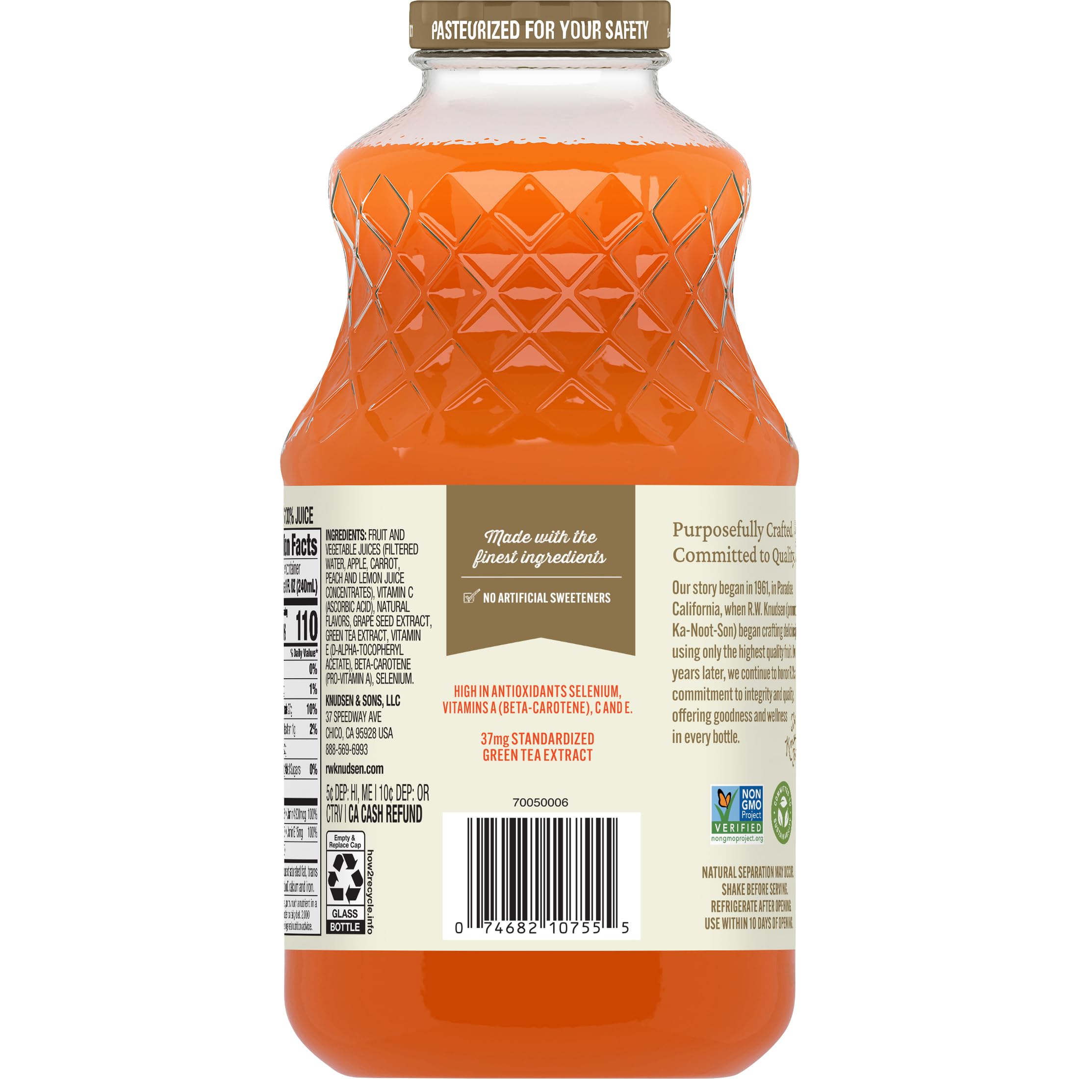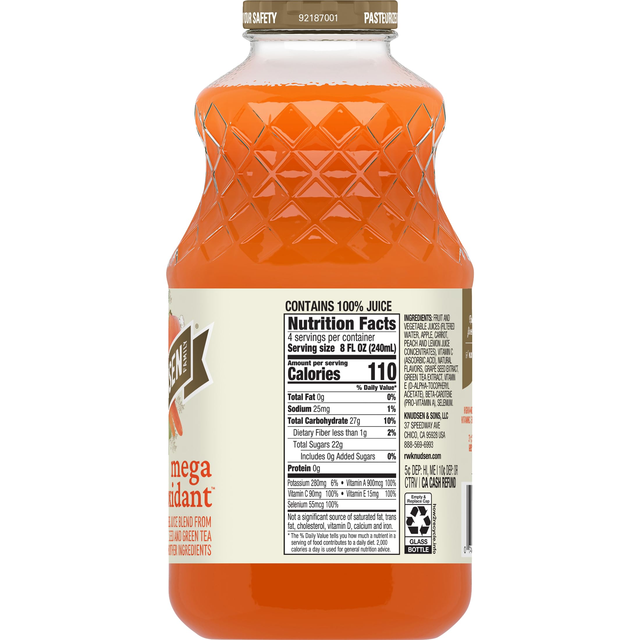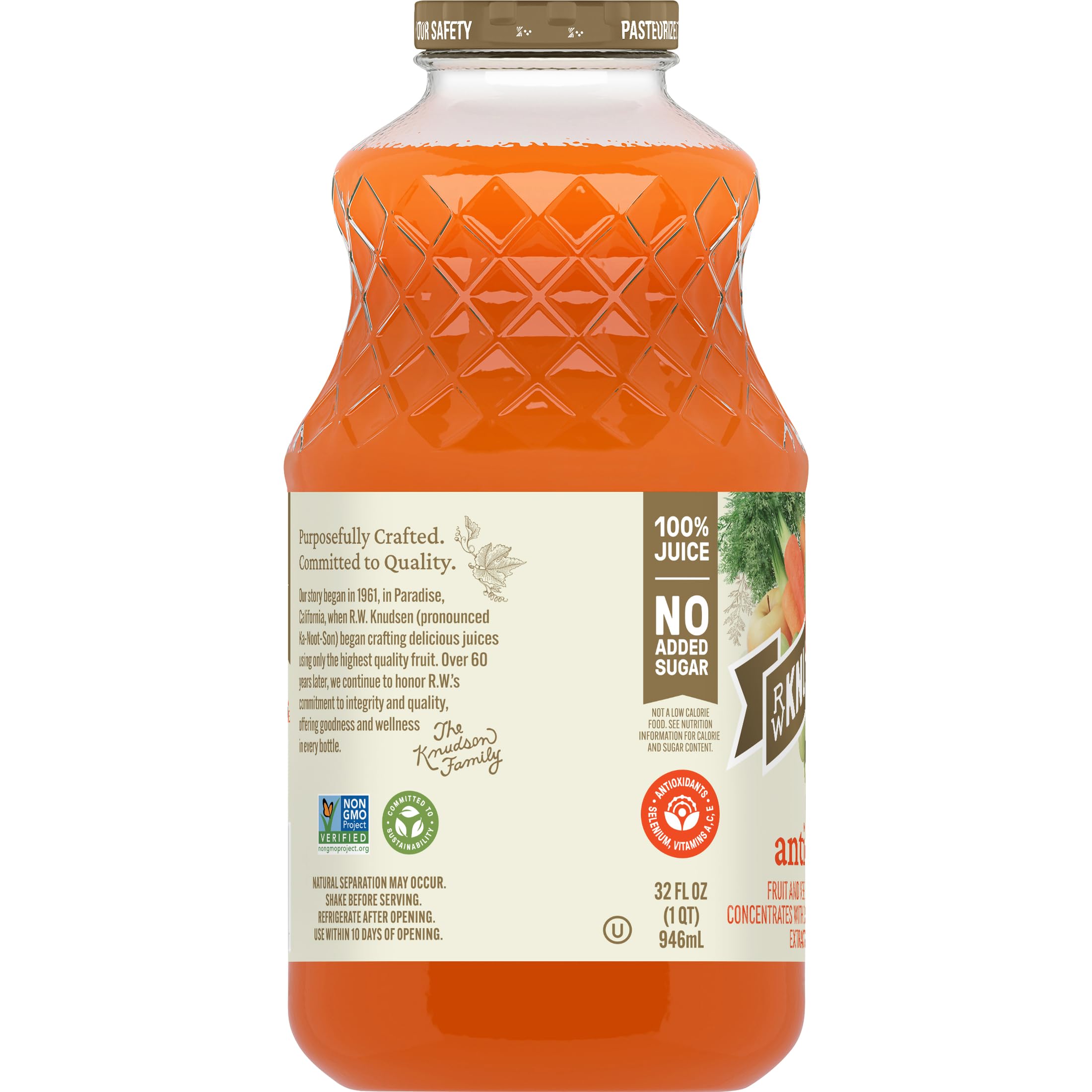 R.W. Knudsen Family Simply Nutritious Mega Antioxidant Beverage unites the finest ingredients to provide you with the ultimate pick-me-up. Apple, carrot, peach, and lemon ingredients combine with grape seed extract, green tea extract and other ingredients to create a deliciously complex flavor profile. Plus, this 100% juice has no sugar added (Not a low calorie food. See nutrition information for calorie and sugar content), is Non-GMO Project Verified, and high in antioxidants selenium, vitamins A (Beta Carotene), C and E. Add R.W. Knudsen Family Simply Nutritious Mega Antioxidant Juice Blend to your morning routine for a rejuvenating way to start your day.