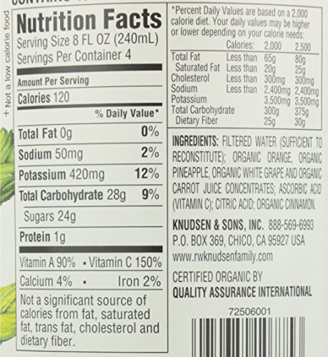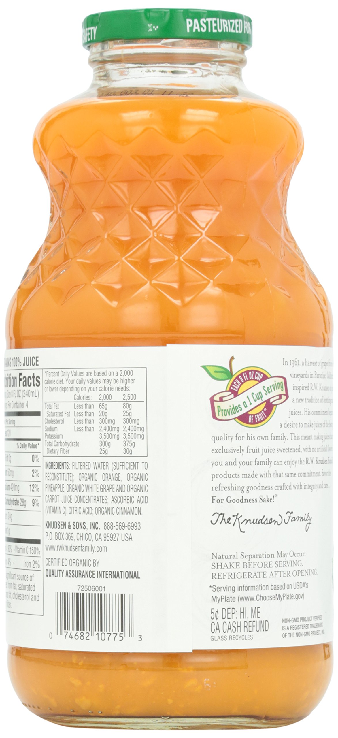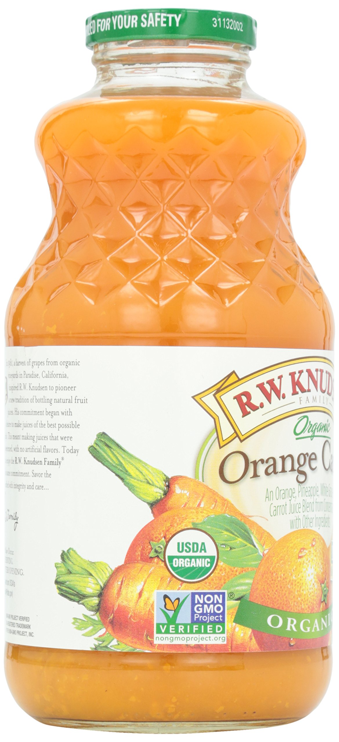 When R W. Knudsen Family decided to create a blend of orange and carrot juices, they created a beverage that not only has the benefits of vegetables, but also with the familiar, sweet taste of oranges. That's why every sip of R.W. Knudsen Family Organic Orange Carrot Juice Blend bursts with orange and carrot flavors. These flavors combine to create a delicious blend that is Certified USDA Organic Non-GMO Project Verified, and has no sugar added (*Not a low-calorie food. See nutrition information for calorie and sugar content). Whether you're drinking it with breakfast, blending it into a smoothie or cocktail, or freezing it to create a refreshing ice pop, R.W. Knudsen Family Organic Orange Carrot Juice Blend delivers the delicious taste your family craves.