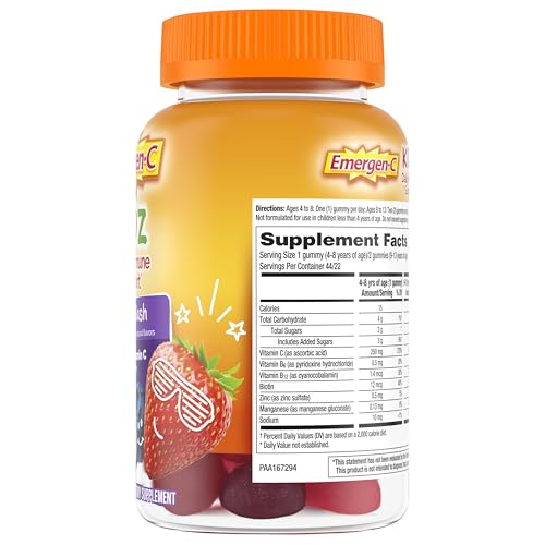 Emergen-C Kidz Daily Immune Support (1) Dietary Supplements for kids are an easy and delicious way to support your child's immune system and energy (1). Emergen-C Kidz gummies offer everything you love about original Emergen-C gummies, but formulated especially for children. These gummies contain a variety of essential nutrients, including 250 mg of high potency vitamin C per gummy for immune system support and B vitamins to enhance energy naturally (1). These gummies come in fun, kid-approved berry flavors, plus they're gluten free, caffeine free and vegetarian. Give your child these dietary supplement gummies under adult supervision as directed. Emergen-C Kidz supplements come in a bottle of 44 gummies. Transform every day with vitamin C from Emergen-C. (1) This statement has not been evaluated by the Food and Drug Administration. This product is not intended to diagnose, treat, cure, or prevent any disease.