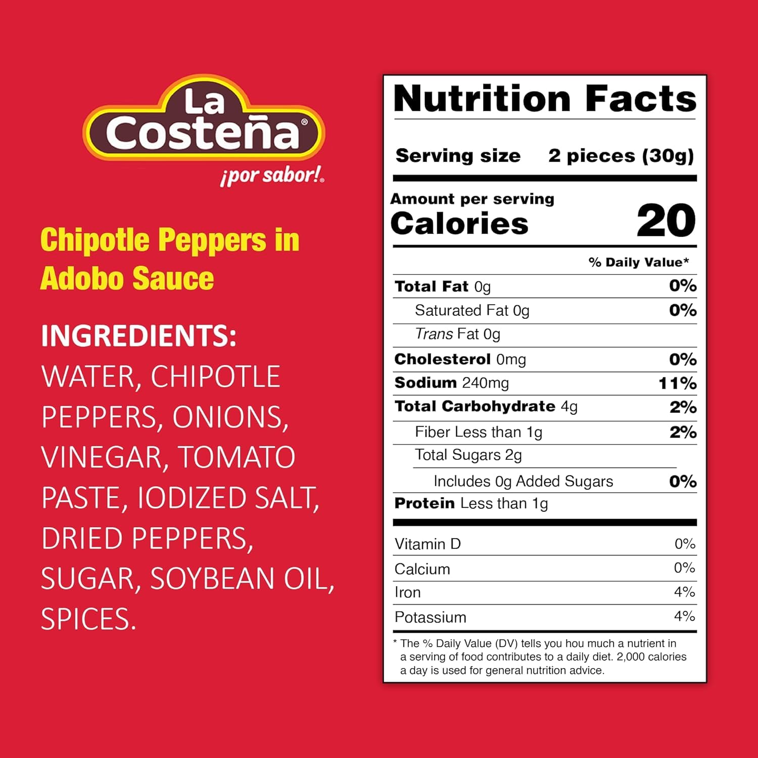 La Costeña Chipotle Peppers in Adobo Sauce - Smoked Spicy Peppers Chipotle in Adobo Sauce - Mexican Food, Taco, Enchiladas & Salsa - Hot Pickled Vegetables - 12oz, 12 Pack Canned Vegetables