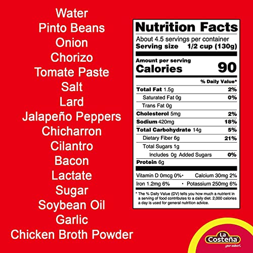 La Costeña Charro Beans - Ready-to-Eat Canned Pinto Beans with Chorizo, Bacon & Chicharrones - Mexican Food, Tex Mex, Chili Ingredients, Bean Dip, Bean Burger & Burrito - 19.75oz, 12 Pack Canned Food