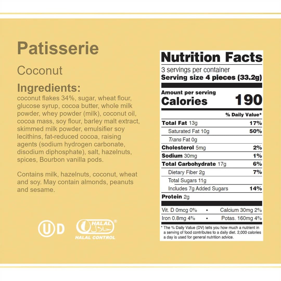 Loacker Patisserie Coconut 99.5g/3.51oz combines crispy wafers, velvety coconut cream, delicious milk chocolate with fine aromatic coconut flakes. The coconuts are sourced from areas of true excellence. The bag contains 12 individually wrapped bite-sized chocolate covered premium wafer fingers filled with finest coconut cream. Loacker Patisserie surprises you with a delicate combination of different layers and are perfect little gifts or ideal for your perfect moment of indulgence.