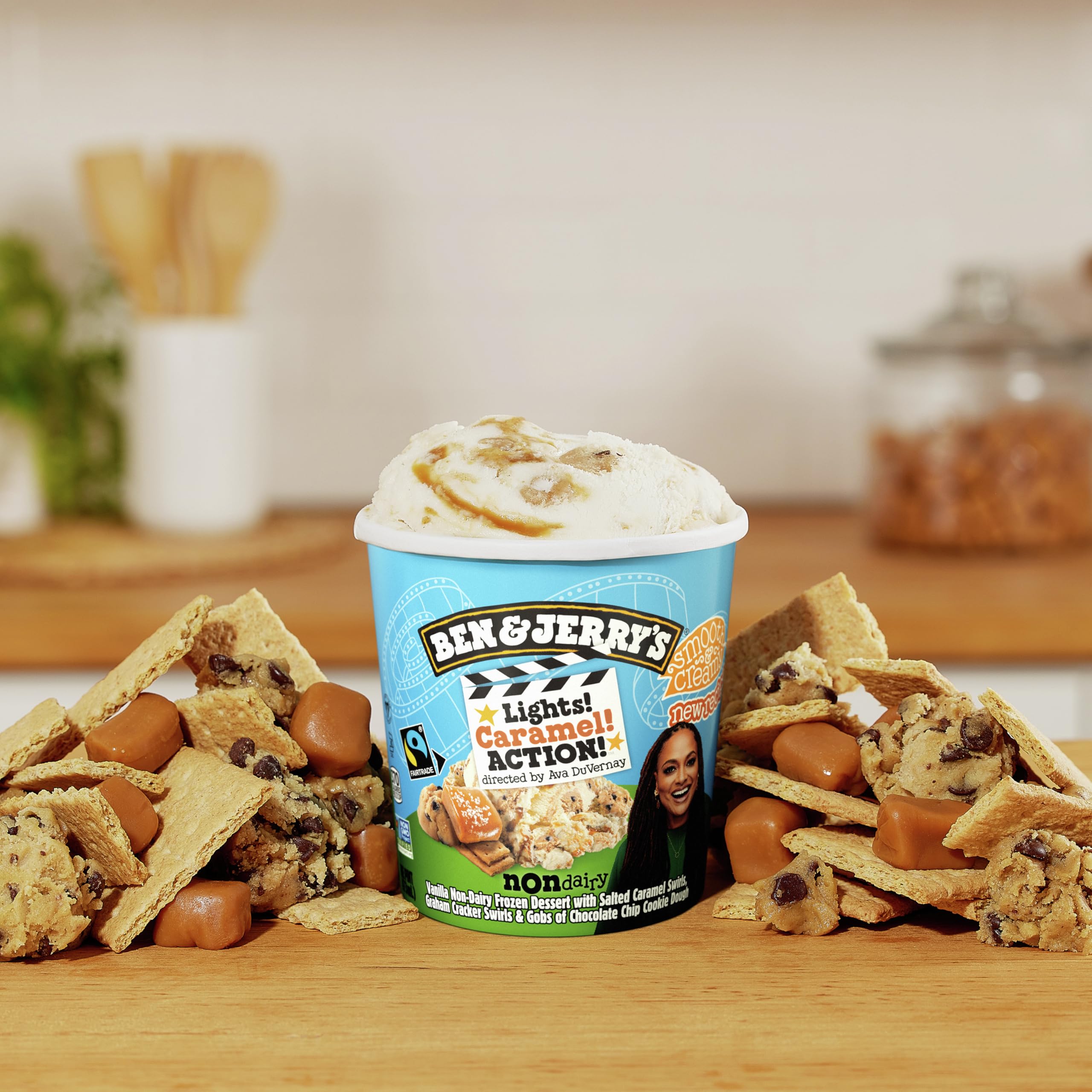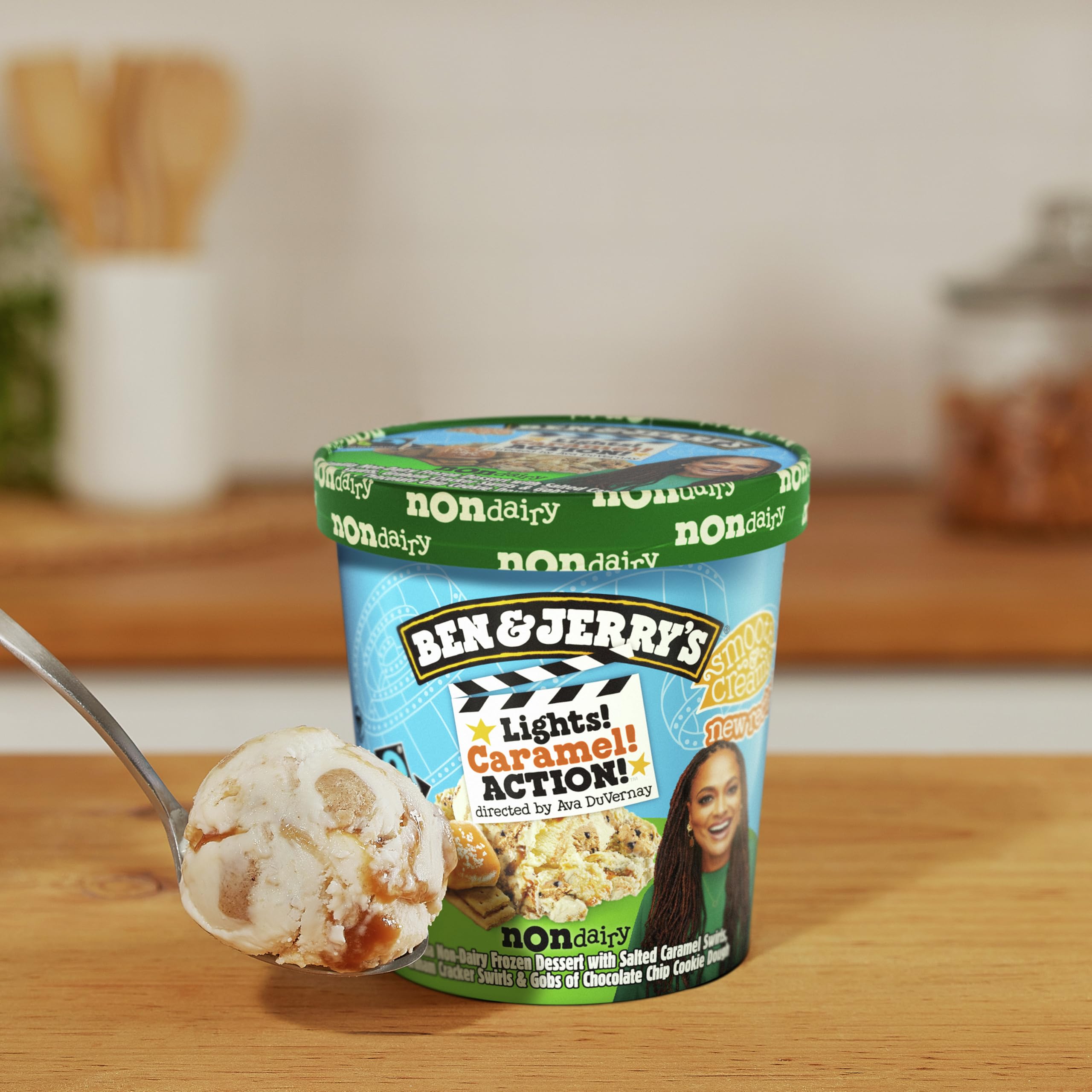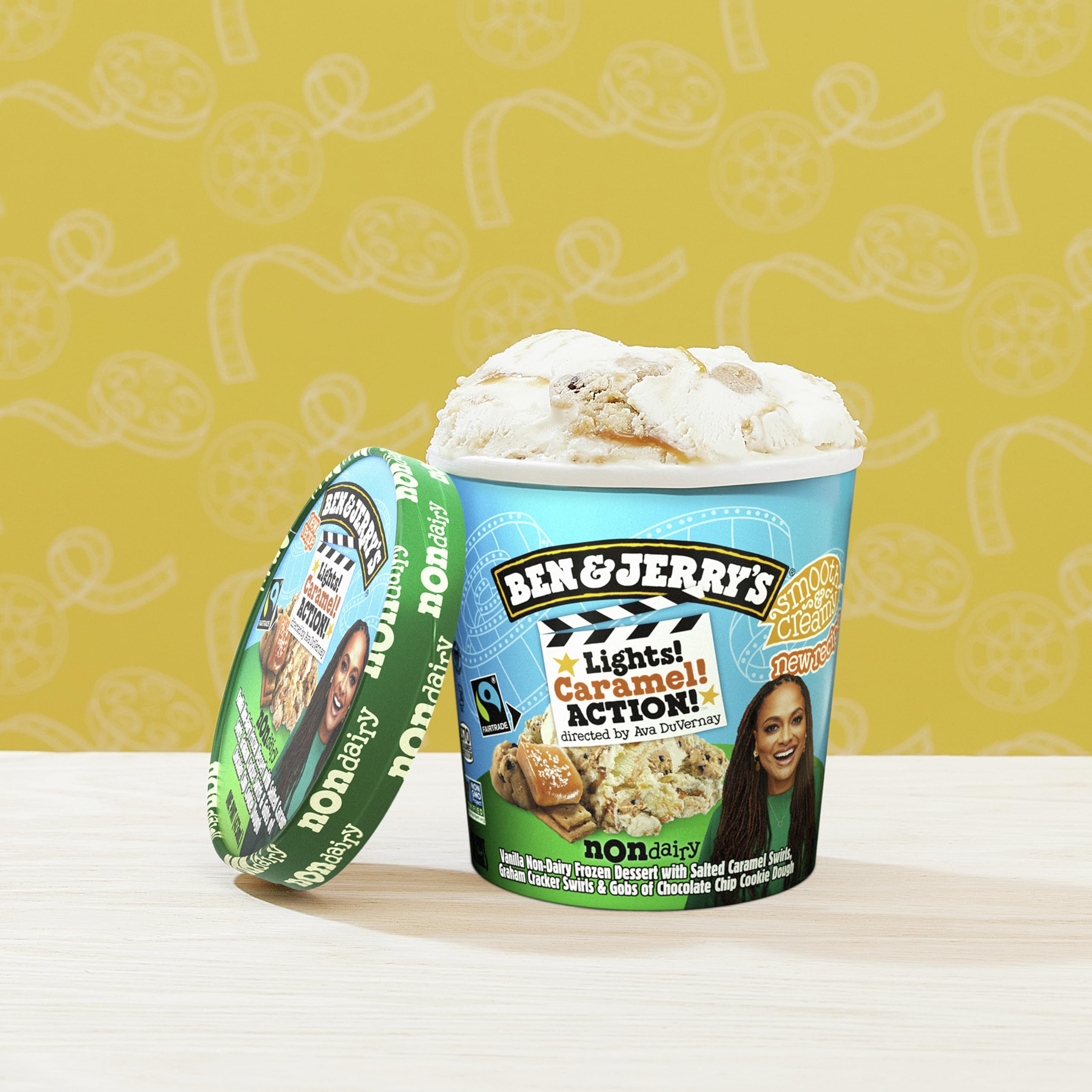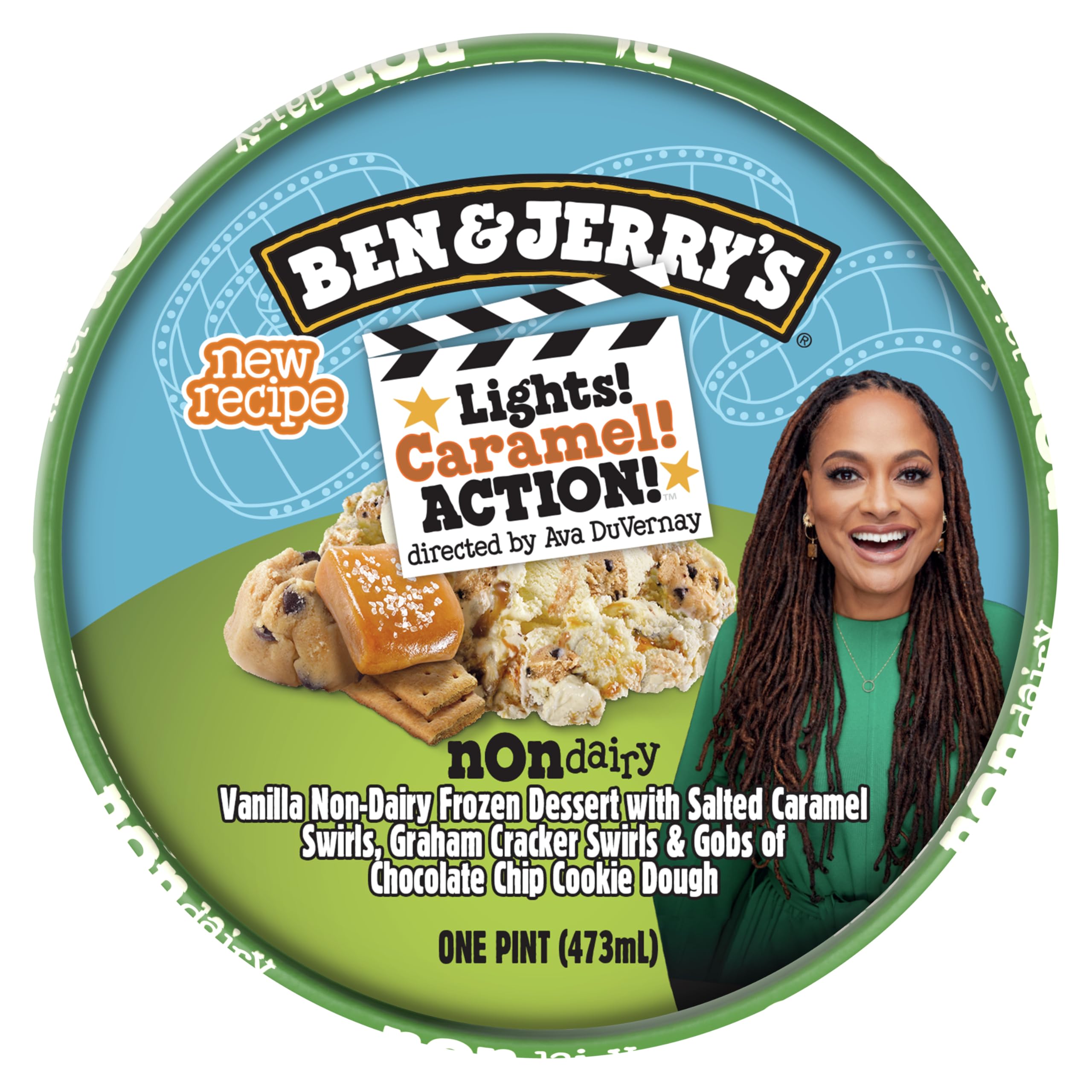 Ben & Jerry's Non-Dairy Vanilla Lights! Caramel! Action! frozen dessert certified vegan pint features vanilla Non-Dairy dessert with salted caramel swirls, graham cracker swirls, and gobs of chocolate chip cookie dough. We’re excited to partner with the critically-acclaimed writer, director, and producer Ava DuVernay on this 100% vegan flavor that’s packed with as much excitement and wonder as Ava’s iconic films. Skip the popcorn and grab a bowl! Ava Duvernay picked up her first camera at the age of 32, quickly making history with shorts and films that were instant film festival favorites. She was the first Black woman to win Best Director at the Sundance Film Festival, be nominated for a Best Director Golden Globe, direct a film nominated for a Best Picture Oscar, and direct a film with a budget over $100 million. Her latest film project, “When They See Us,” was nominated for 16 Emmy Awards, making her one of the first Black women to receive multiple nominations for directing. From “I Will Follow” (2010) and “Middle of Nowhere” (2012) to “Selma” (2014) and “A Wrinkle in Time” (2018), Ava continues to entertain and challenge audiences with her provocative filmmaking. Ava’s proceeds from sales of Lights, Caramel, Action! go to ARRAY Alliance, a woman-led non-profit organization that’s advancing social justice through art. ARRAY Alliance works to remove the roadblocks that keep women and people of color from leveraging film as a tool of social change, mobilize the film industry to hire and retain diverse talent, and transform audiences into agents of social change.