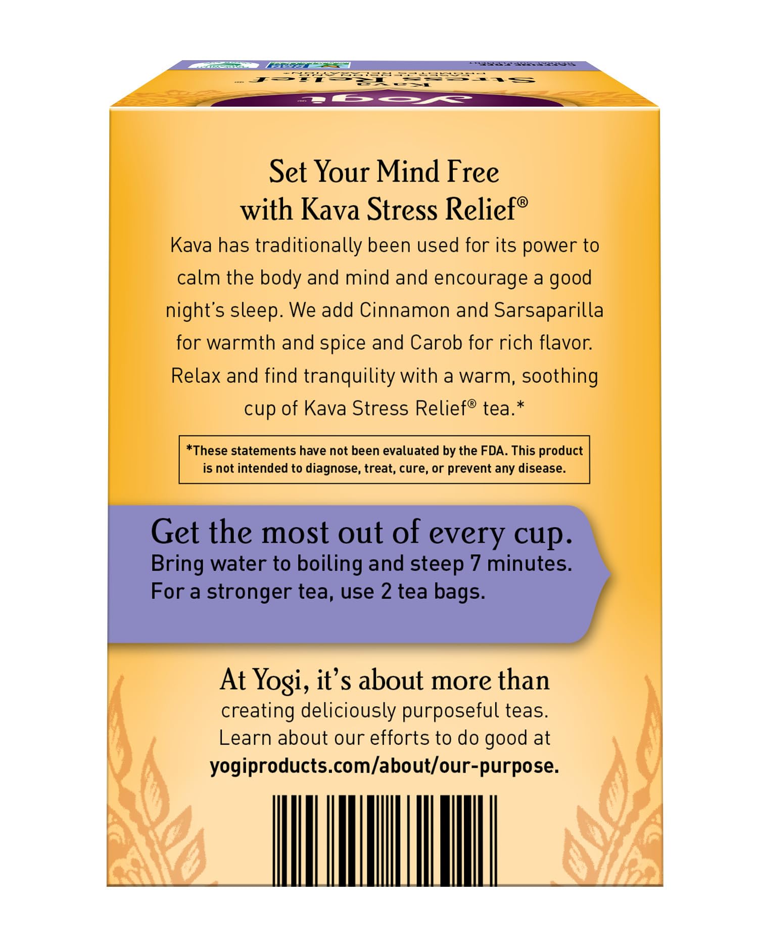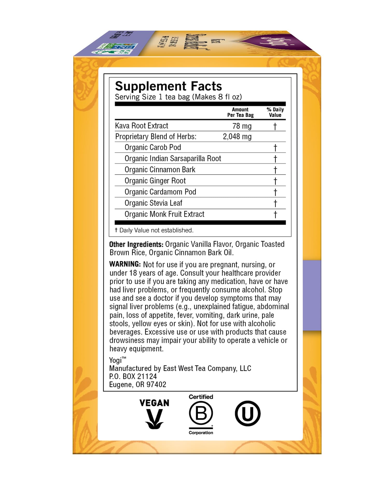 Yogi Kava Stress Relief® tea is purposefully blended with Kava, a root traditionally used for its power to calm the body and mind and encourage a good night’s sleep. Cinnamon and Sarsaparilla add warmth and spice to this relaxing blend, while Carob Pod imparts rich flavor. Relax and find tranquility with a warm, soothing cup of Yogi Kava Stress Relief® tea.*