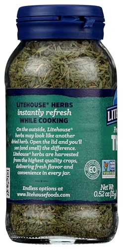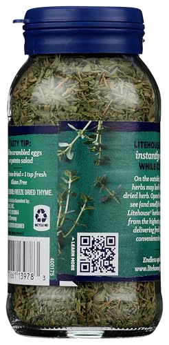 Litehouse Instantly Fresh Thyme is a popular spice in many Mediterranean dishes. This herb is slightly sweet and highly aromatic, giving a great flavor to cheese, bread or meat. One jar of Litehouse Instantly Fresh Thyme is equal to 5 bunches fresh. When cooking with our herbs, we recommend substituting one tablespoon of freeze-dried herb for one tablespoon fresh. All measurements are approximate. Made with delicious, quality ingredients and gluten free.