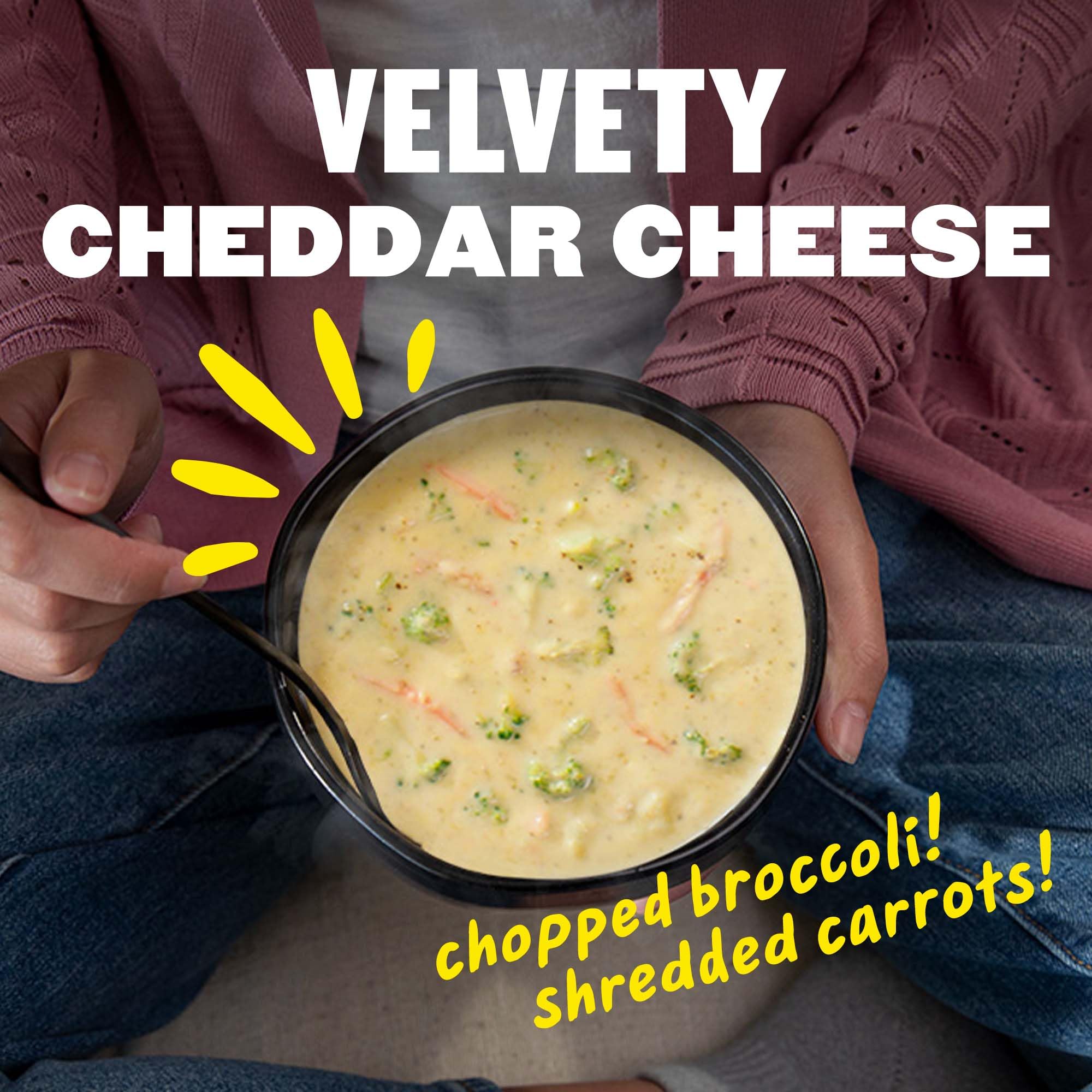 Panera Broccoli Cheddar Soup delivers a bakery-cafe inspired favorite in a microwavable cup that you can take with you on-the-go. This thick soup features chopped broccoli and shredded carrots simmered with select seasonings in a velvety smooth cheese sauce, and is made with no artificial preservatives, sweeteners or flavors. Whether you have a busy schedule and need a quick meal or you just want to enjoy a warm cup of soup, this Panera soup is perfect any time of day. To cook this packaged soup, remove the lid and film and place in the microwave, covering loosely. Heat this microwave soup cup on high for five to six minutes and stir halfway through. You can also cook this soup on the stove top to 165 degrees F, but do not boil. Store the Panera Broccoli Cheddar Soup cup in the refrigerator or freezer until you are ready to prepare. Make easy, craveable meals with help from Panera Bread at home.