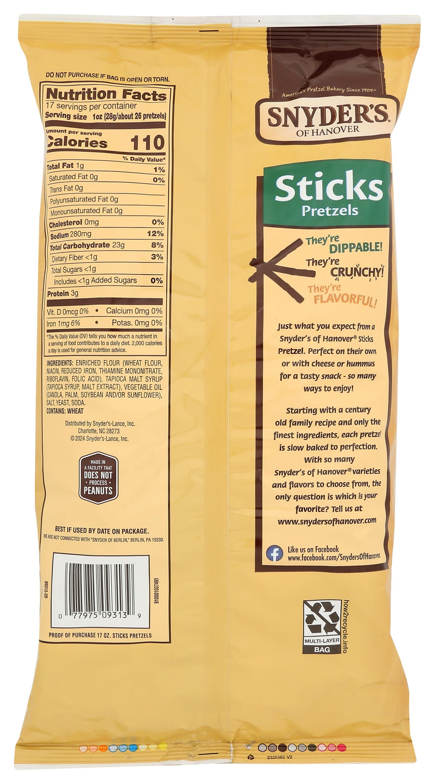 0 g trans fat per serving. Low fat. Low fat (see nutrition information for sodium content). Non-GMO Project verified. nongmoproject.org. America's Pretzel bakery since 1909. 17 oz value! We are not connected with Snyder of Berlin, Berlin, PA 15530. They're dippable! They're crunchy! They're flavorful! Just what you expect from a Snyder's of Hanover Mini Pretzel. Perfect on their own or with cheese or hummus for a tasty snack - so many ways to enjoy! Starting with a century old family recipe and only the finest ingredients, each pretzel is slow baked to perfection. With so many Snyder's of Hanover varieties and flavors to choose from, the only question is which is your favorite? Tell us at www.snydersofhanover.com. America's favorite pretzel brand. www.snydersofhanover.com. how2recycle.info. Facebook. Like us on Facebook www.facebook.com/SnydersOfHanover. Tell us at www.snydersofhanover.com. Baked in USA.