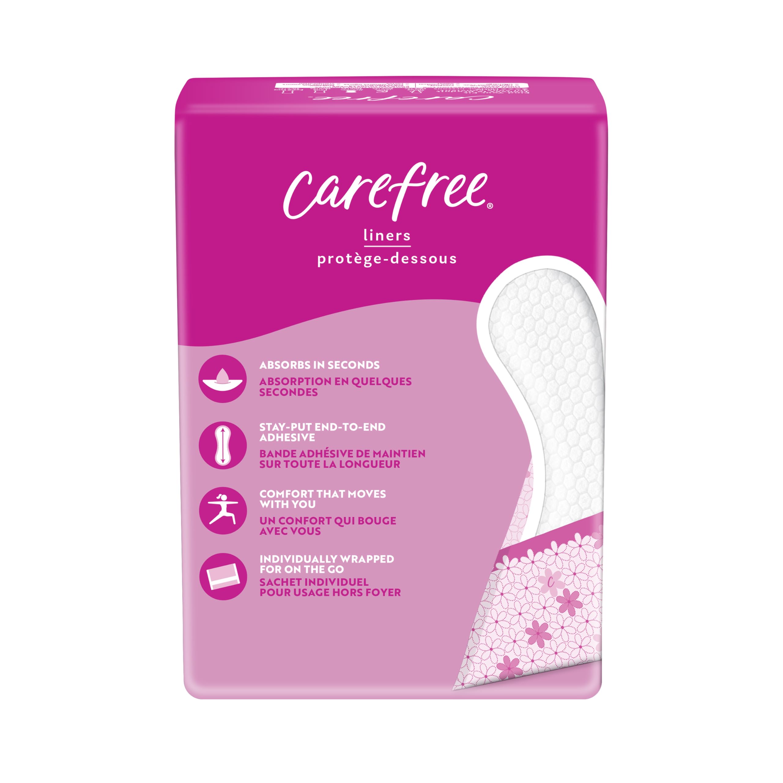 Introducing a whole new look for the Carefree brand you know and love. Carefree panty liners are designed to deliver comfort and multi-fluid protection against leaks, periods, odors, and everything in between. These liners feature a soft, quilted design that molds to your body for comfortable daily protection. Stay fresh all day, every day with our built-in odor neutralizer and a core that is 2x more absorbent.* Carefree pantiliners are available both individually wrapped for when you're on-the-go, and unwrapped to be ready to use at home. Find your fit with 5 different Carefree liner lengths and absorbencies to suit your unique feminine care needs. These panty liners for women can be used for every day freshness, odor control, sweat, unexpected periods, light days, tampon backup, bladder leaks, and discharge. Note: Same great product with a new look and updated name! Formerly packaged as Carefree Acti-Fresh Panty Liners. *vs. Carefree Original liners