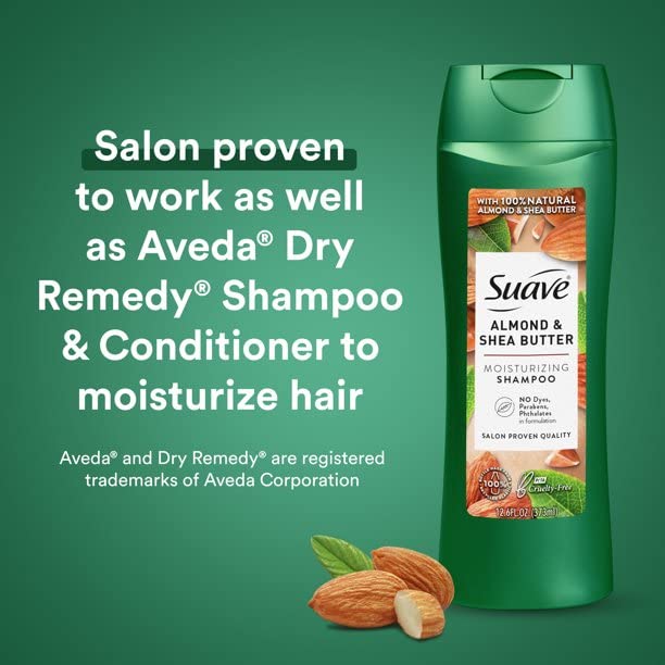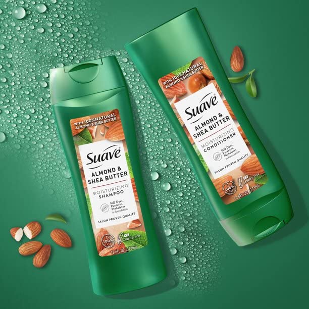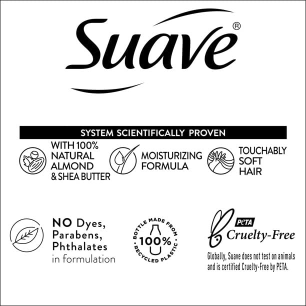 Suave Professionals Almond and Shea Butter Moisturizing Shampoo in a 12.6 oz bottle is designed to cleanse hair while providing a smooth, manageable feel. The formula includes almond and shea butter as listed ingredients, contributing to a rich, creamy lather suitable for everyday use. It spreads easily through the hair and rinses cleanly as part of a regular grooming routine. This 2 pack offers added convenience for stocking multiple bathrooms or extending supply. Each bottle features a flip-top cap for simple and controlled dispensing.