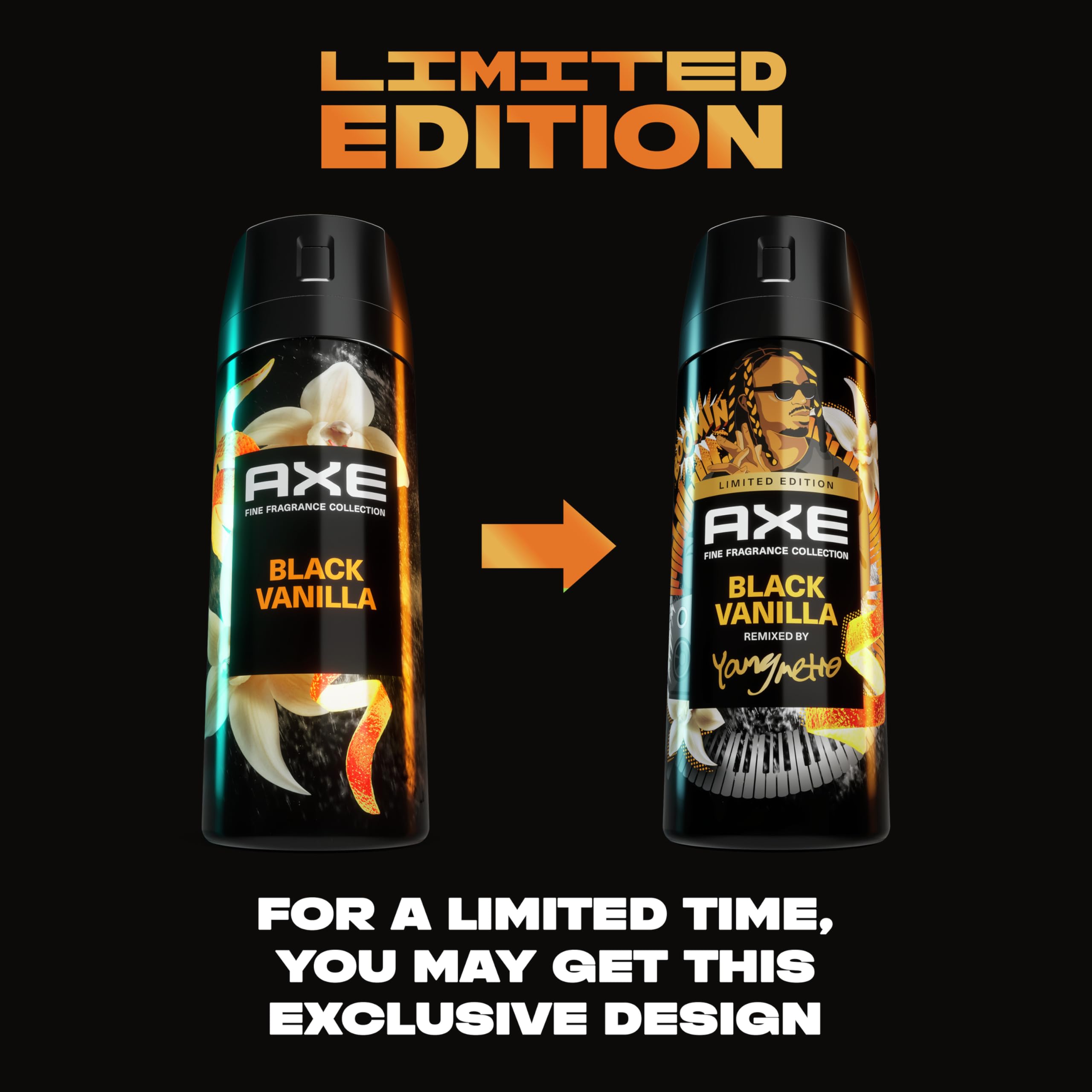Smell finer than fine fragrances with the NEW AXE Fine Fragrance Collection. In a blind study, 70% of guys said they’d replace their fine fragrances with their favorite scent from the AXE Fine Fragrance Collection. Surprised? We’re not. Our world-renowned perfumers have crafted the Black Vanilla premium body spray with an indulgent, delicious fragrance infused with orange essential oil. Everyone deserves a hype man, so we made one in fragrance form. In just a few spritzes of this spray, you’ll get freshness and unbeatable confidence. AXE Fine Fragrance premium body sprays are formulated with 2x zinc zap technology (compared to our other body sprays), neutralizing odor and keeping you smelling fresh for 72 hours. Yep—that’s right. We’re out here working smarter, not harder. This body spray is formulated with an aluminum-free formula that hits different, is easy on the skin, tough on odor, and is instantly refreshing. We know, we know—we really thought of everything. That's the AXE effect. IYK, YK. How to use: Apply your favorite AXE deodorant to your underarms in the morning, and touch up with AXE Fine Fragrance body spray as needed throughout the day. Twist the top to reveal the nozzle. Hold the can six inches from your body and spray to neck and chest.
