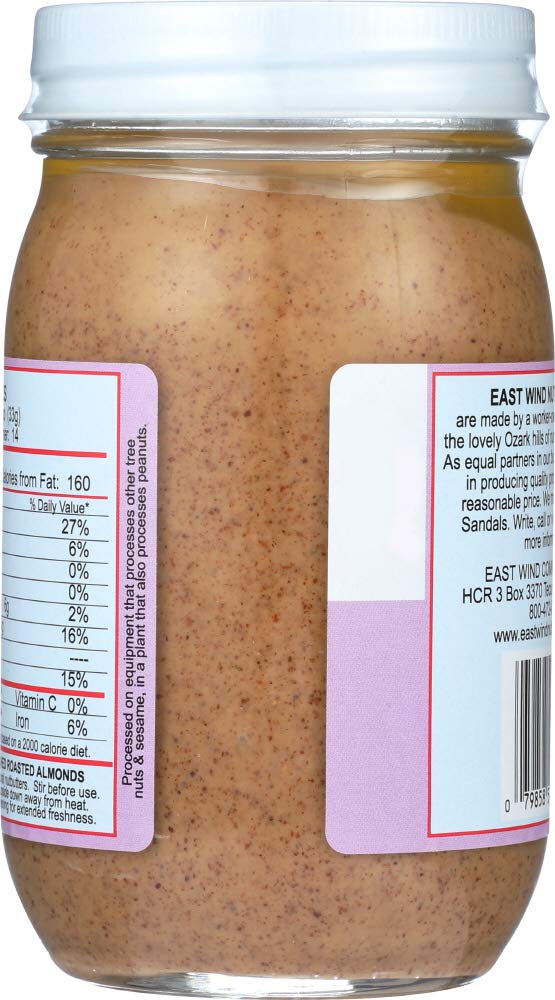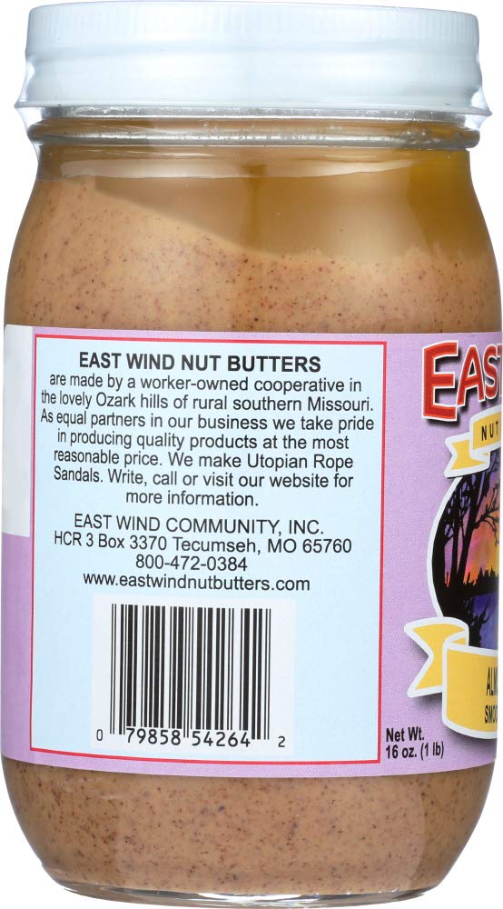 East wind nut butters' almond butter contains just one ingredient - roasted almonds - so you know it's all-natural. Each 16 oz. Jar of almond butter is crafted by our worker-owned cooperative in the lovely ozark hills of rural southern missouri. Our almond butter is certified as kosher by the vaad hoeir of st. Louis. See nutrition facts panel for allergens.country of origin : united statesis kosher : yessize : 16 ozpack of : 6selling unit : caseingredients : unblanched roasted almondskeywords : alternative;kosher;natural;parve;protein