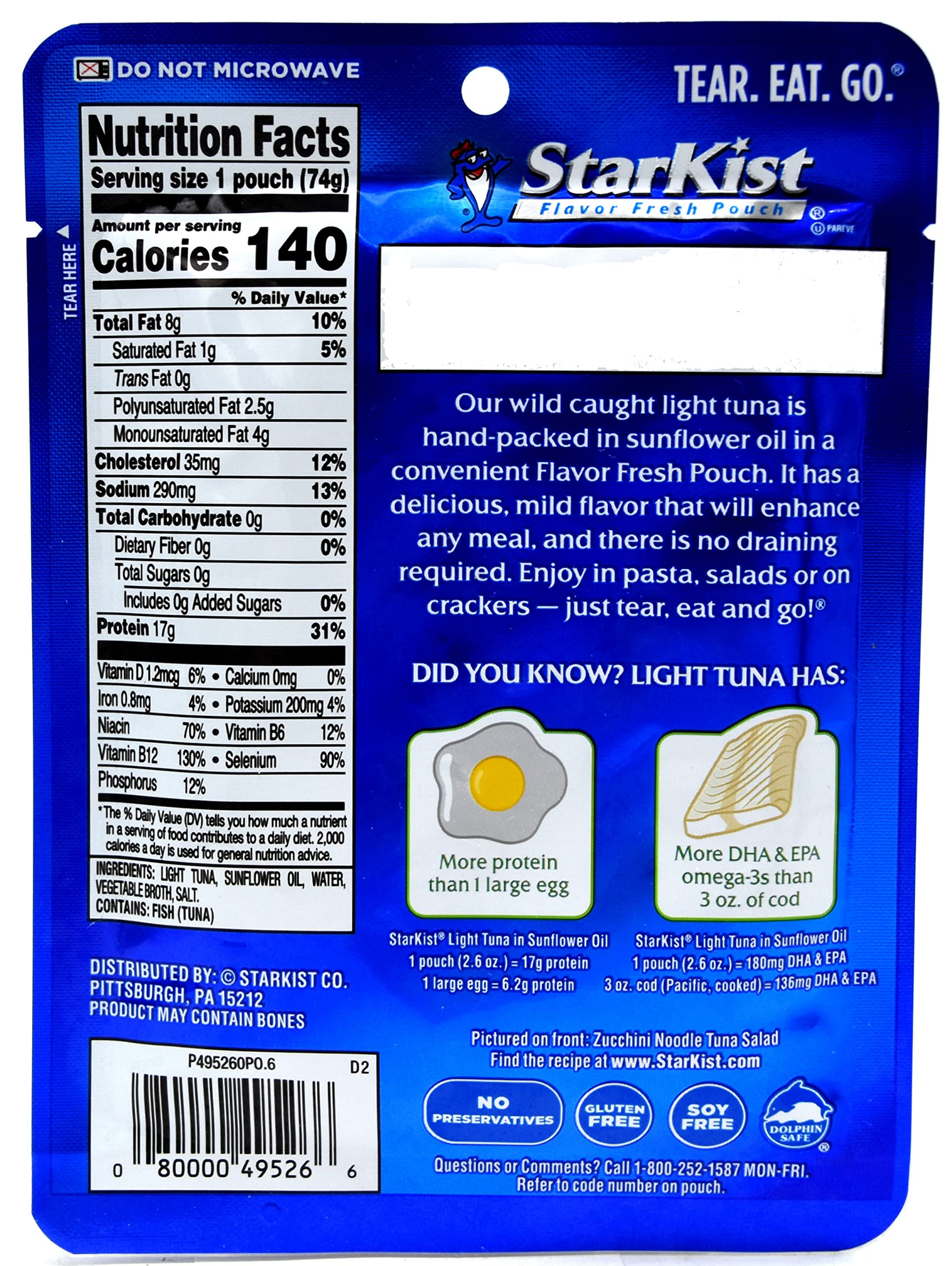 Hand packed with delicately flavored Sunflower oil. These select cuts of tuna in the StarKist Flavor Fresh Pouch are an excellent choice for people who prefer tuna packed in oil, but are concerned about their health. It has the same premium tuna as our Chunk Light Tuna in Water. It is tuna you can really tear into because itβs no drain. Perfect on a salad, in a sandwich, right out of the pouch or used as a substitute for beef or chicken in your favorite recipes. This StarKist Chunk Light Tuna in Sunflower Oil contains 250mg per serving of EPA and DHA combined, which is 156% of the 160mg Daily Value for a combination of EPA and DHA.