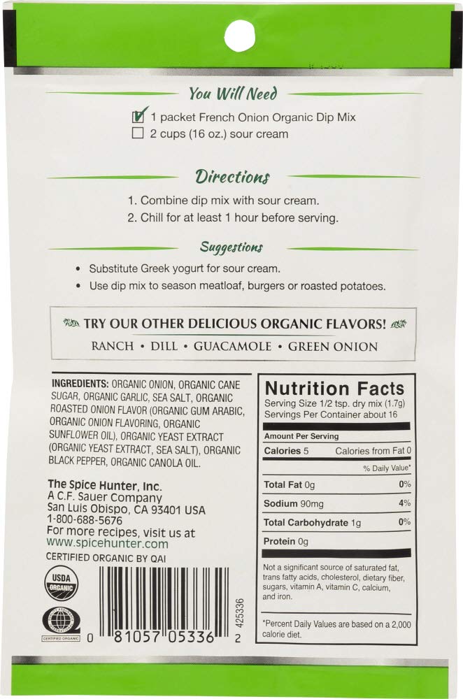 Spice Hunter Mix Dip French Onion. No Artificial Flavors, Preservatives. The product temperature is Ambient Room Temperature.