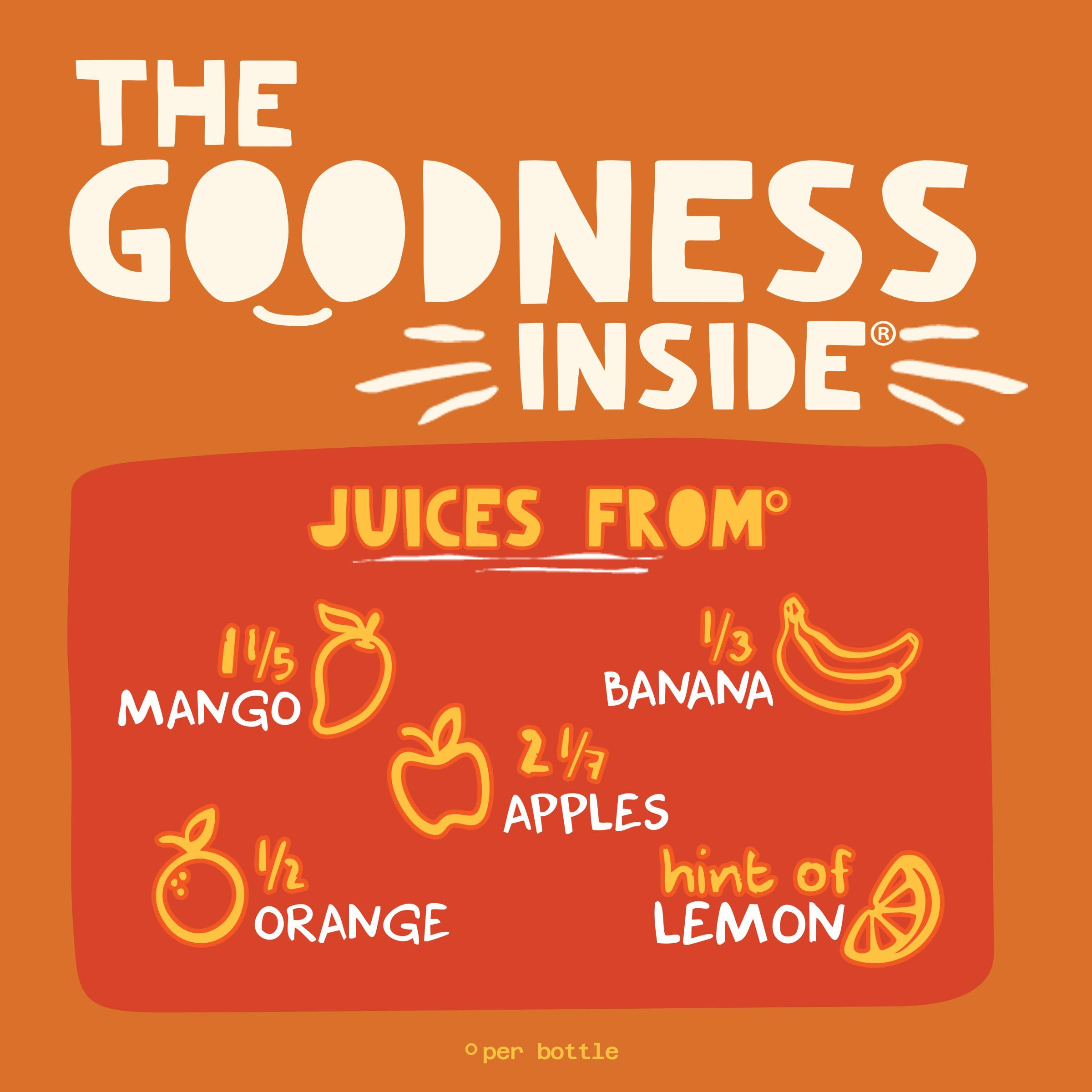 The mango, also known as the king of fruits, really is mighty. Give yourself the royal treatment with an amazingly exotic, incredibly yummy multitude of mango, blended with oranges, apples and more. Simply put, mango rules. The Fruit Inside: 3/4 mango 1/3 orange 1 apple 1/4 banana A hint of lemon