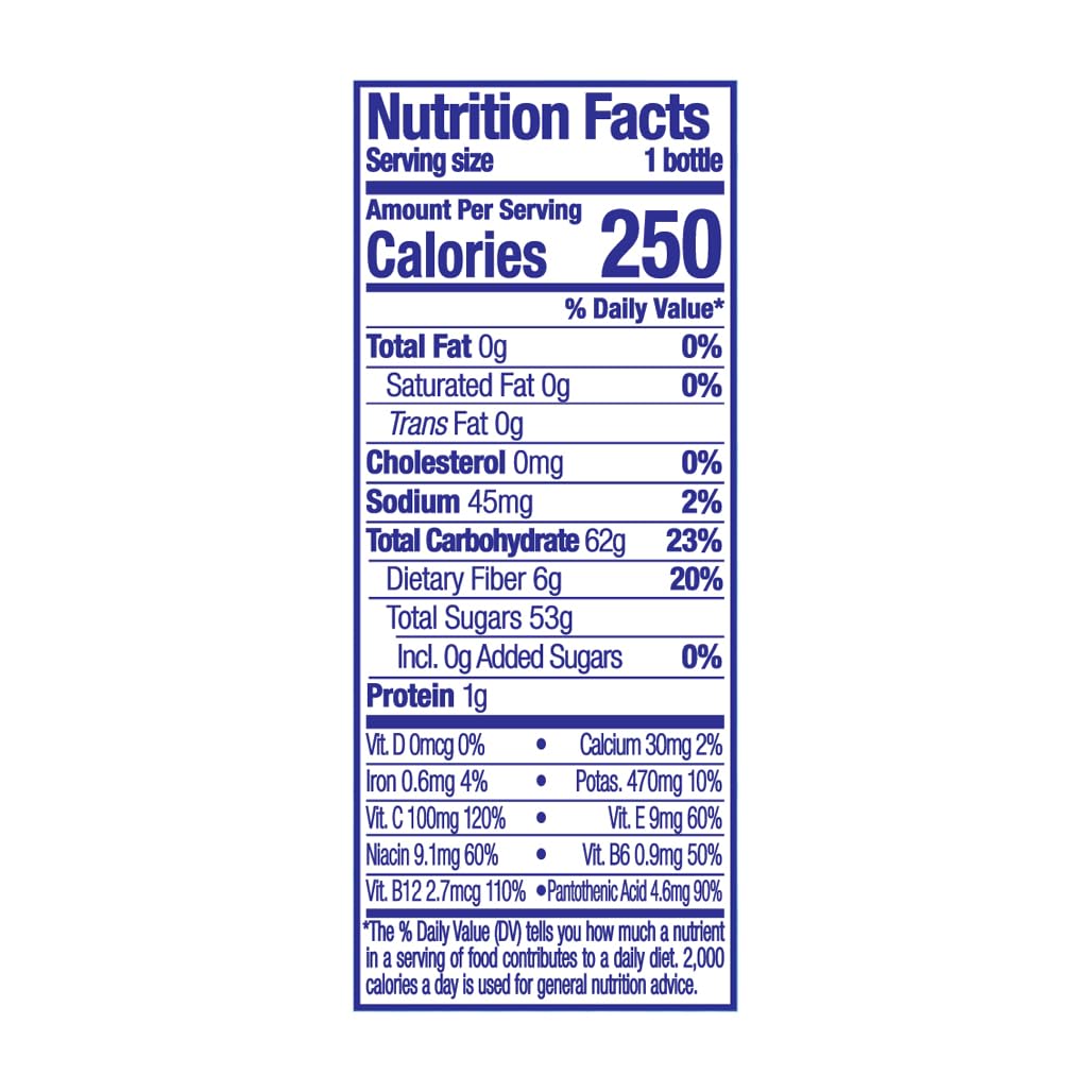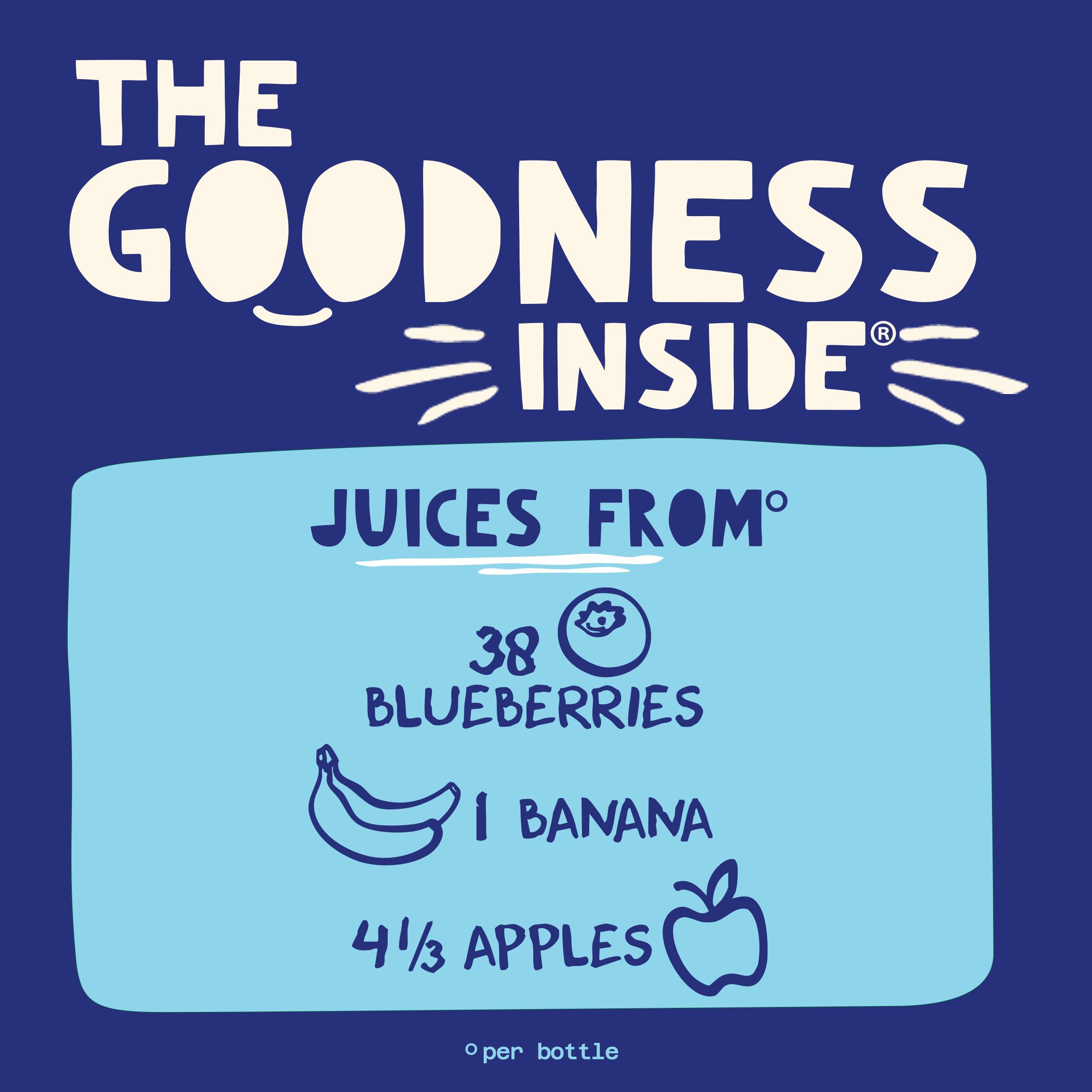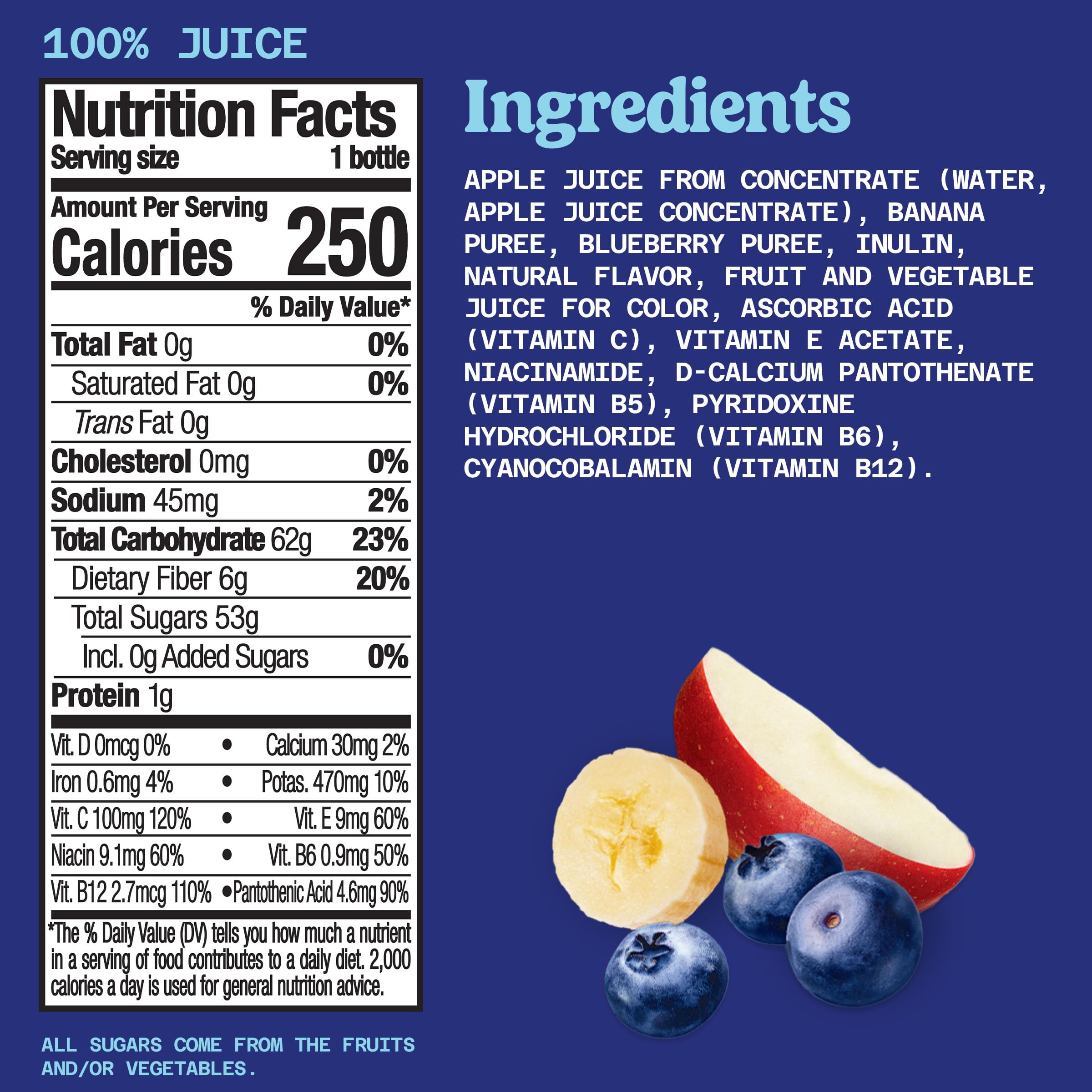 Got the blues? Kick 'em to the curb with a swig of this fiber-full flavor machine of blueberry-blackberry goodness then strut down the street with some pep in your step. There’s some good old-fashioned mood-shine in every bottle, along with bare-naked fruits and B-vitamin boosts. The Fruit Inside: 27 blueberries 3 blackberries 3 1/4 apples 1 banana