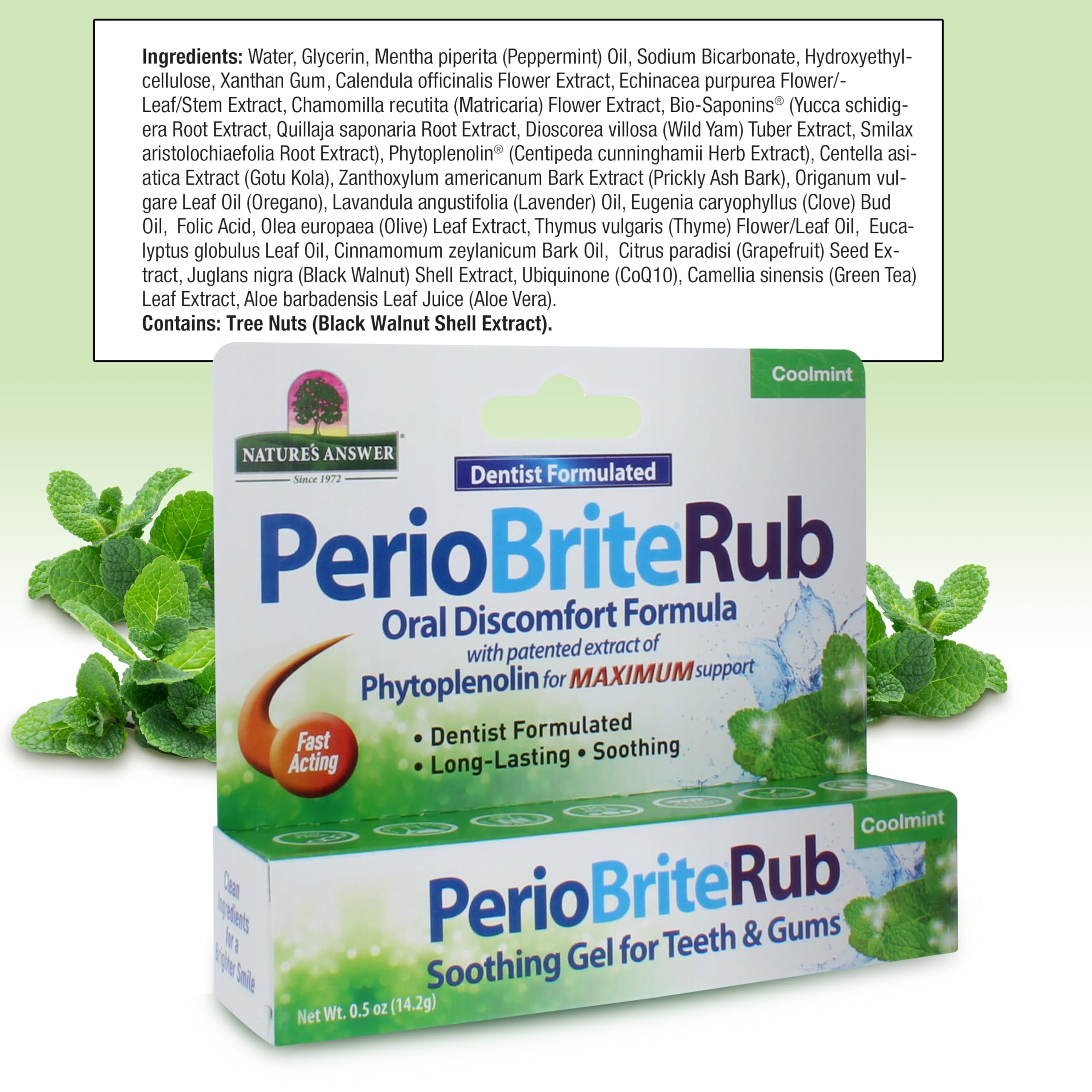 PerioRub for Periodontal Health is a natural gel that offers fast, effective, long-lasting relief from tooth and gum discomfort. Our proprietary vegetarian formula contains soothing organic and responsibly wildcrafted herbs plus essential oils. These ingredients work together to calm tooth and gum distress. PerioRub also freshens breath while promoting healthy gum tissue. It is further enhanced with Phytoplenolin, a Holistically Balanced patented herbal extract that has been shown in independent laboratory studies to promote cell vitality.