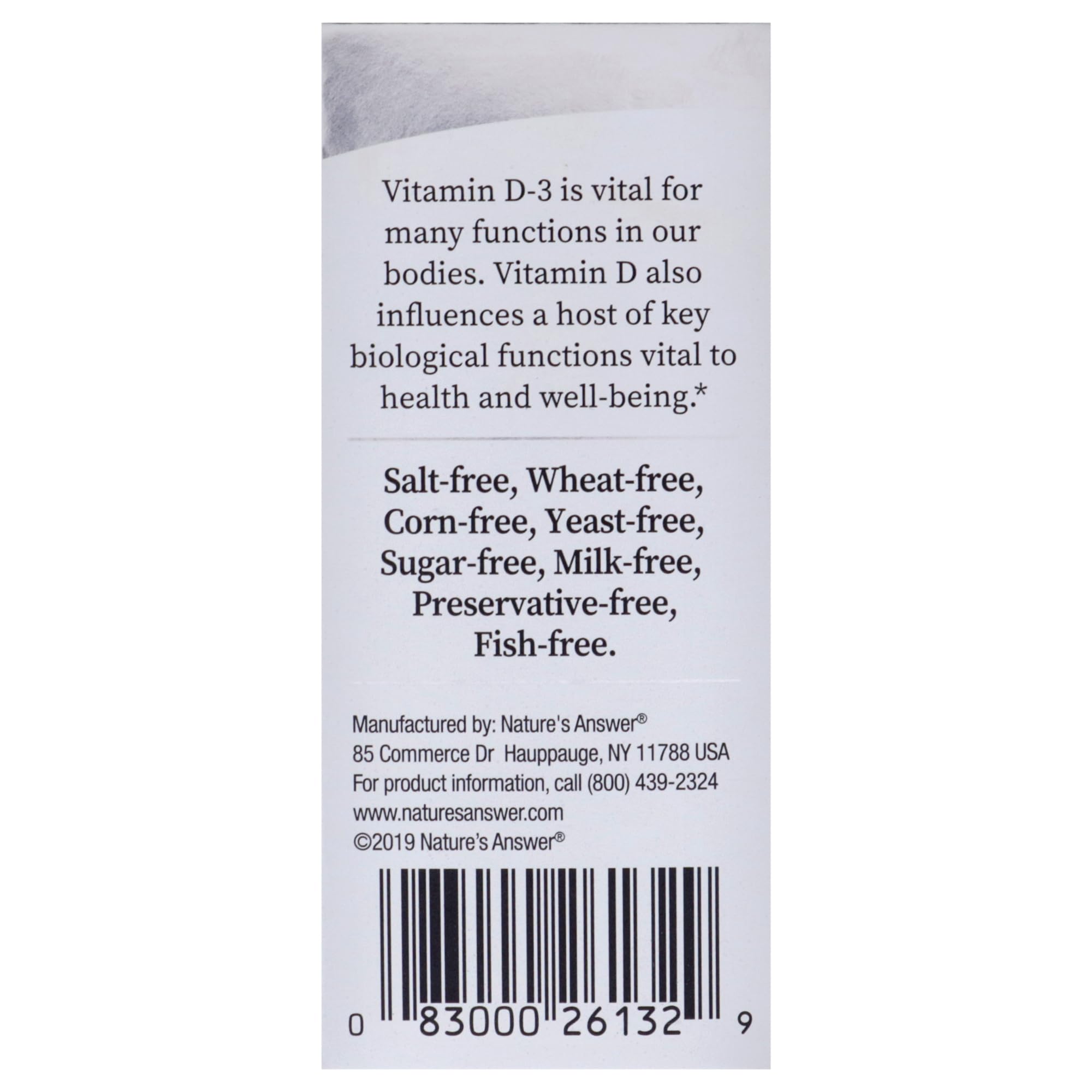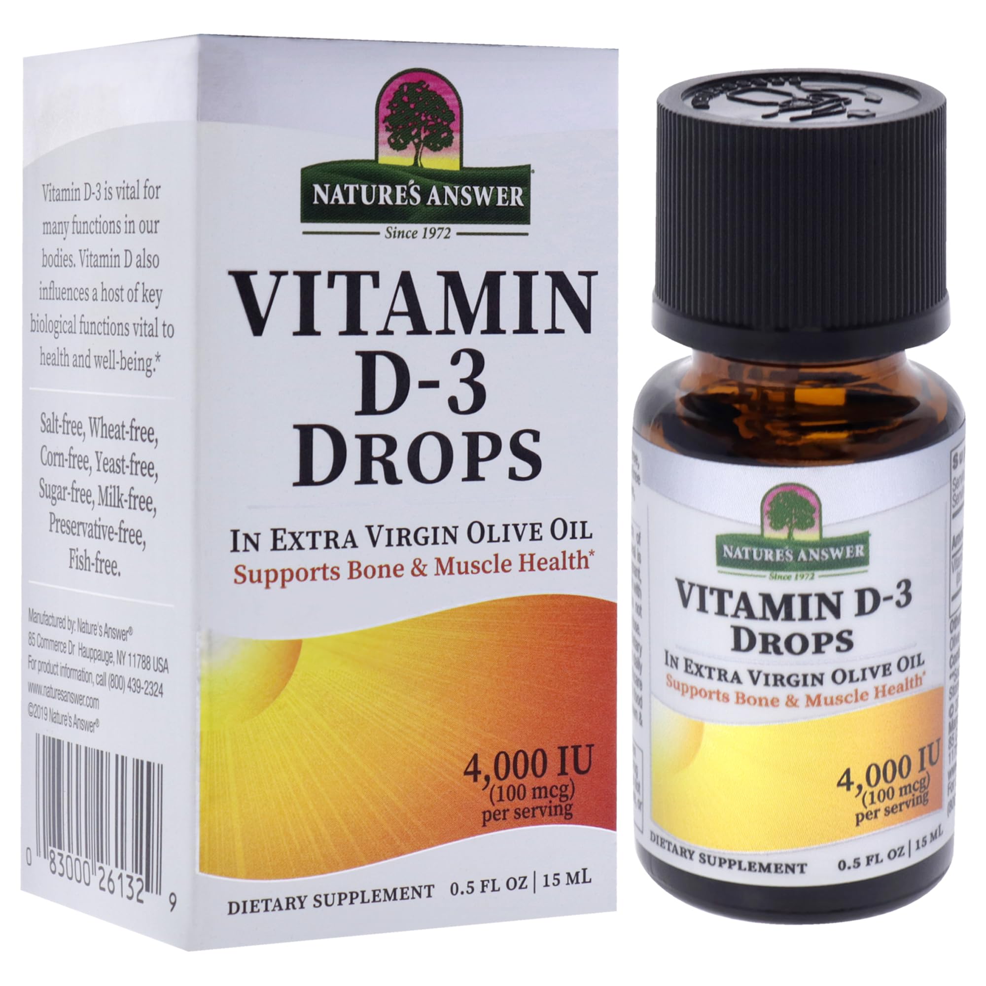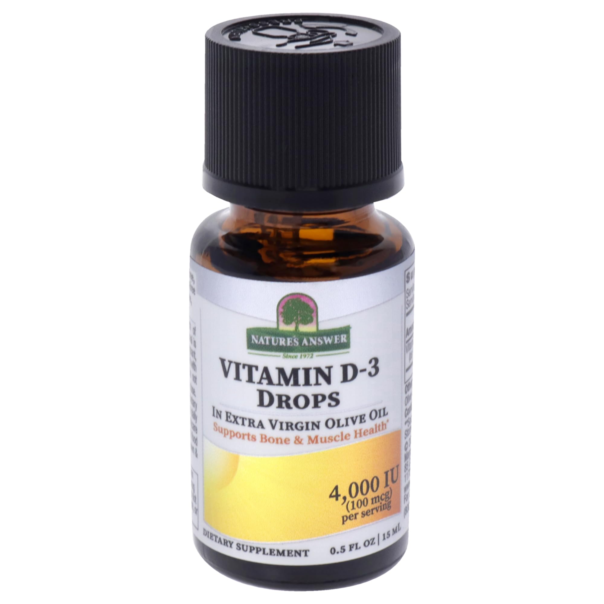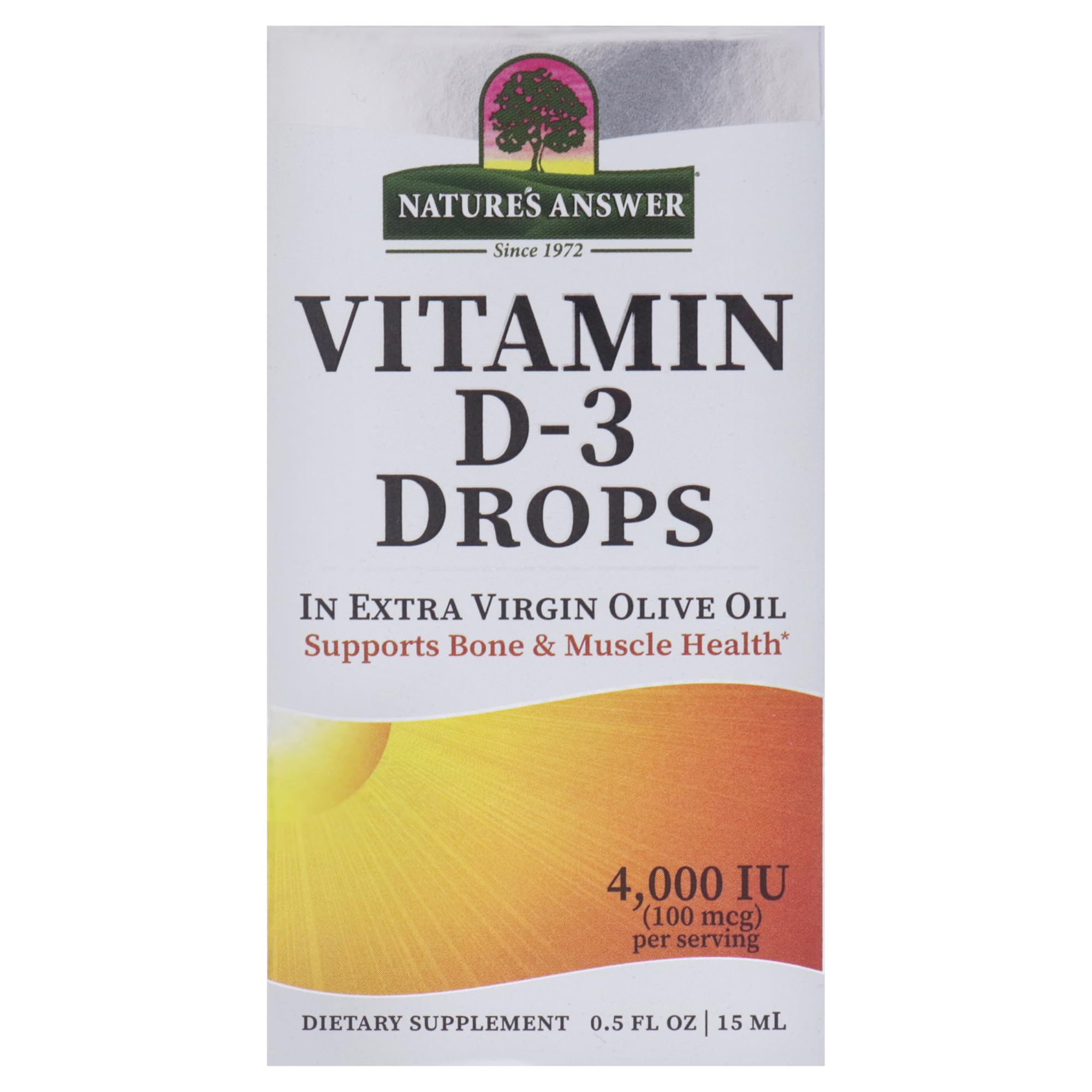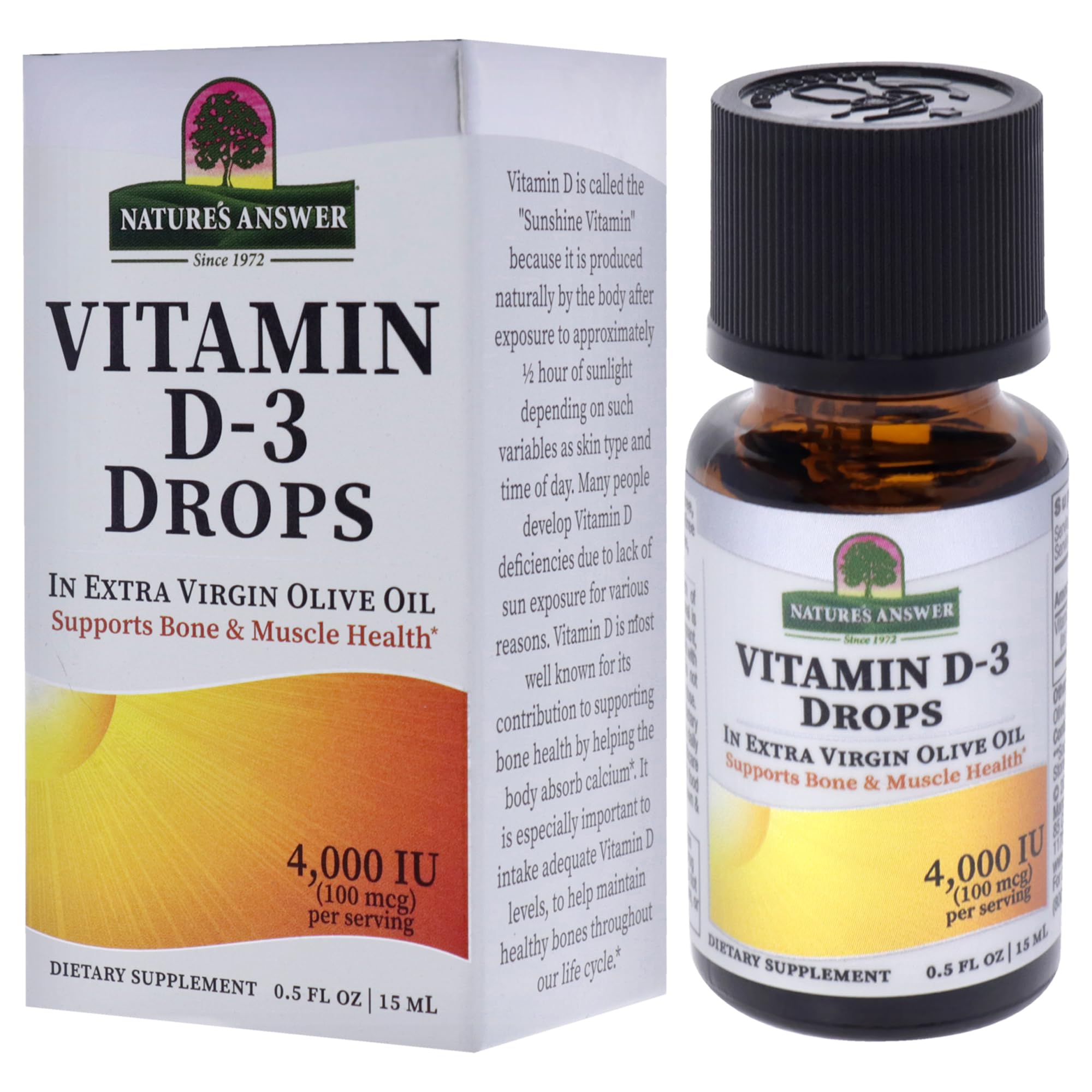 Vitamin D is called the “”Sunshine Vitamin”” because it is produced naturally by the body after exposure to approximately 1/2 hour of sunlight. The amount of Vitamin D produced is dependent on such variables as skin type and time of day. Many people develop Vitamin D deficiencies due to a lack of sun exposure and other reasons. Vitamin D is most well known for It's contribution to supporting bone health by helping the body absorb calcium. Adequate Vitamin D levels help maintain healthy bones throughout our life cycle. Vitamin D also influences key biological functions vital to health and well-being. Vitamin D3 is used to help support a healthy immune system and support bone health. Nature’s Answer Liquid Vitamin D3 Drops delivers 4,000 IU per 2 drops serving in extra virgin gold olive oil, contributing to joint and bone health by helping the body absorb calcium. Nature’s Answer vitamin D-3 drops have no fillers, tableting agents, or other additives You'll find in other brands, Just Vitamin D3 and Olive Oil.