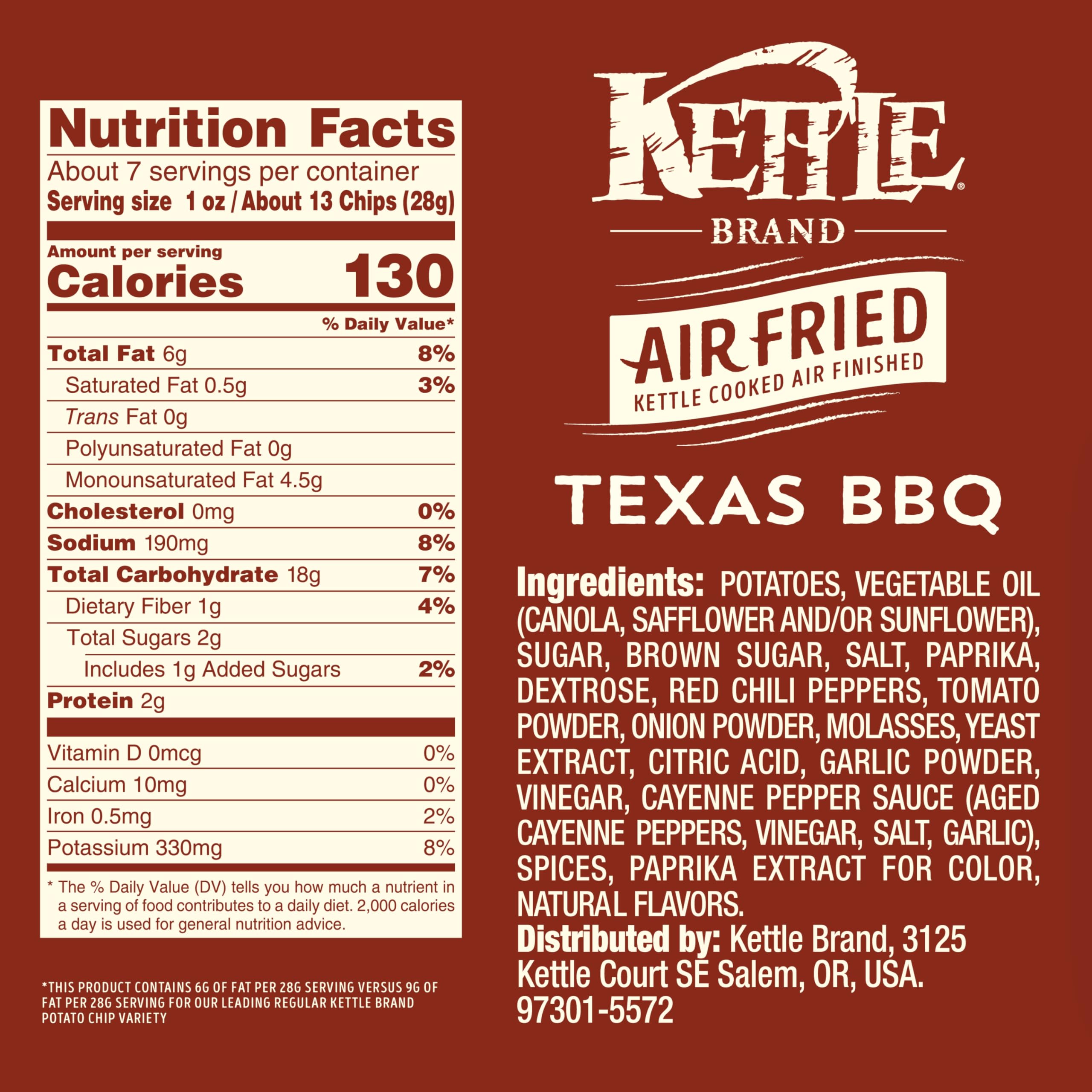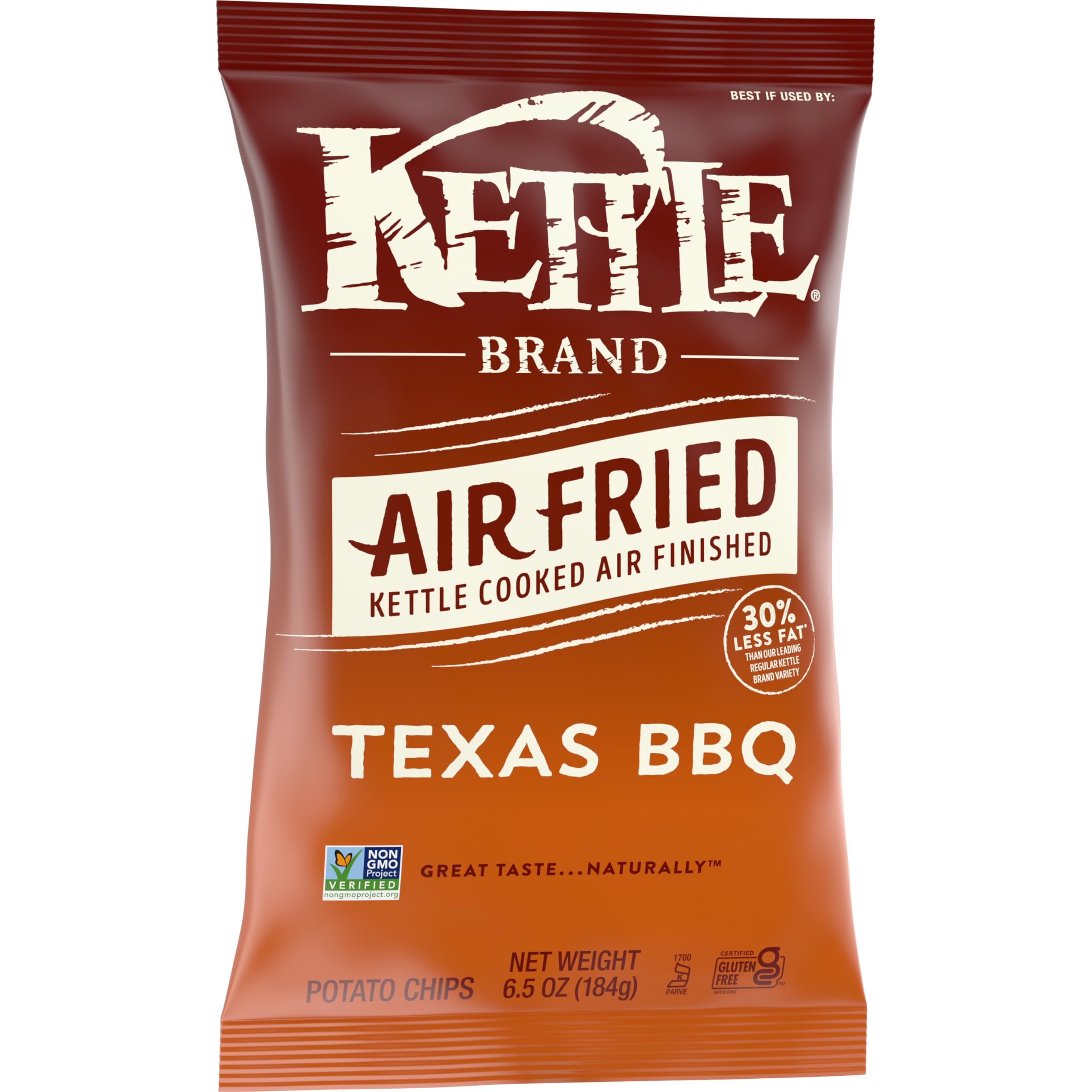 Kettle Brand Air Fried Texas BBQ Kettle Chips are kettle cooked, air-fried chips that deliver a light, crispy crunch. Tangy with sweet heat and a smoky finish, these barbecue chips have 100% bold Kettle Brand flavor with 30% less fat than the leading regular Kettle Brand variety. When you open a bag of Kettle Brand potato chips, you know you're getting incredible tasting potato chips made with quality ingredients. Kettle Brand had about as humble a start as can be had. Our founder sold natural foods from a van way back in 1978. His original vision of great tasting foods has been our driving ambition ever since. Kettle Brand has always been about real people who care about what we do. The time and attention each Kettle Brand worker puts into our products, as each one makes its way from farms to our kitchens and then to your home, is care you can trust.