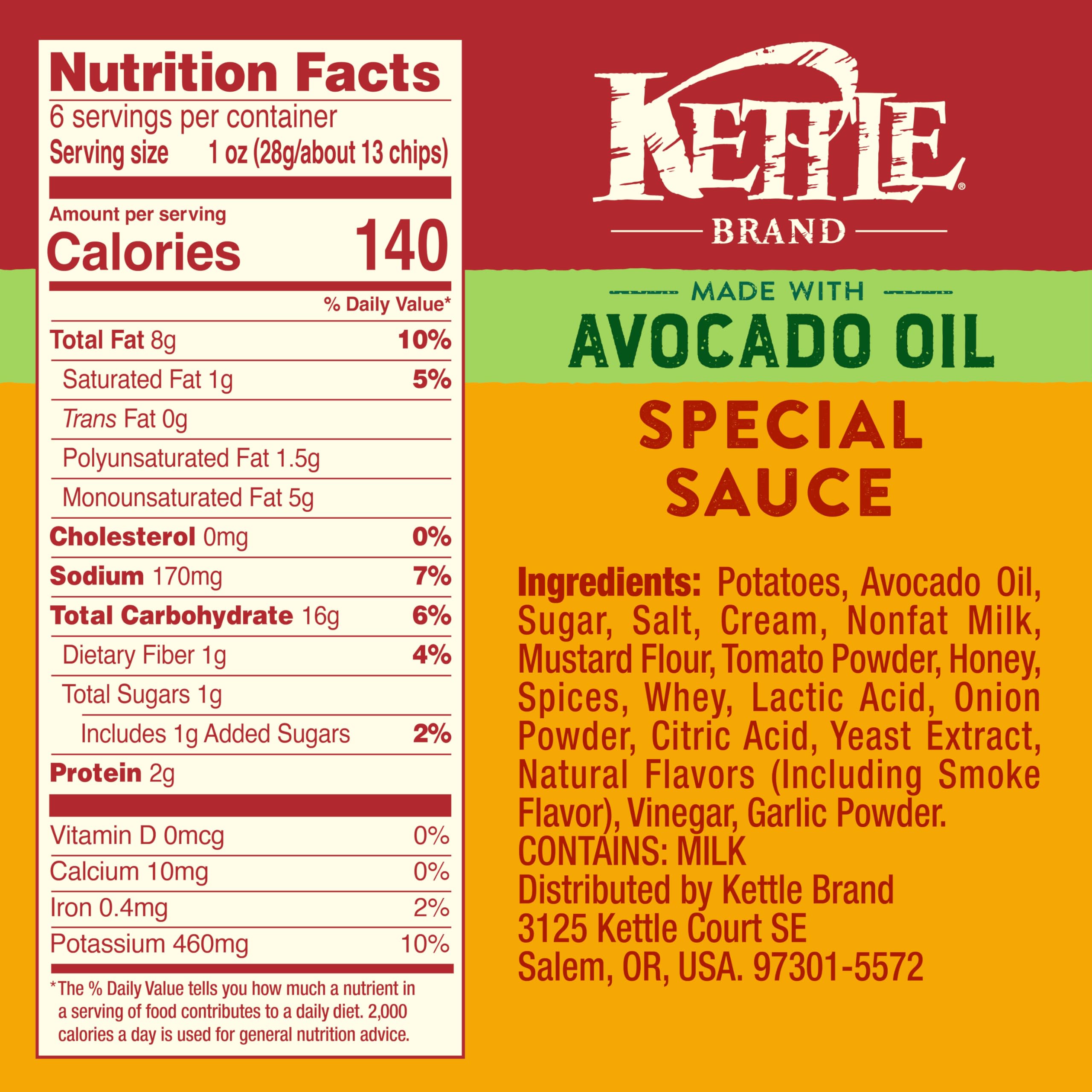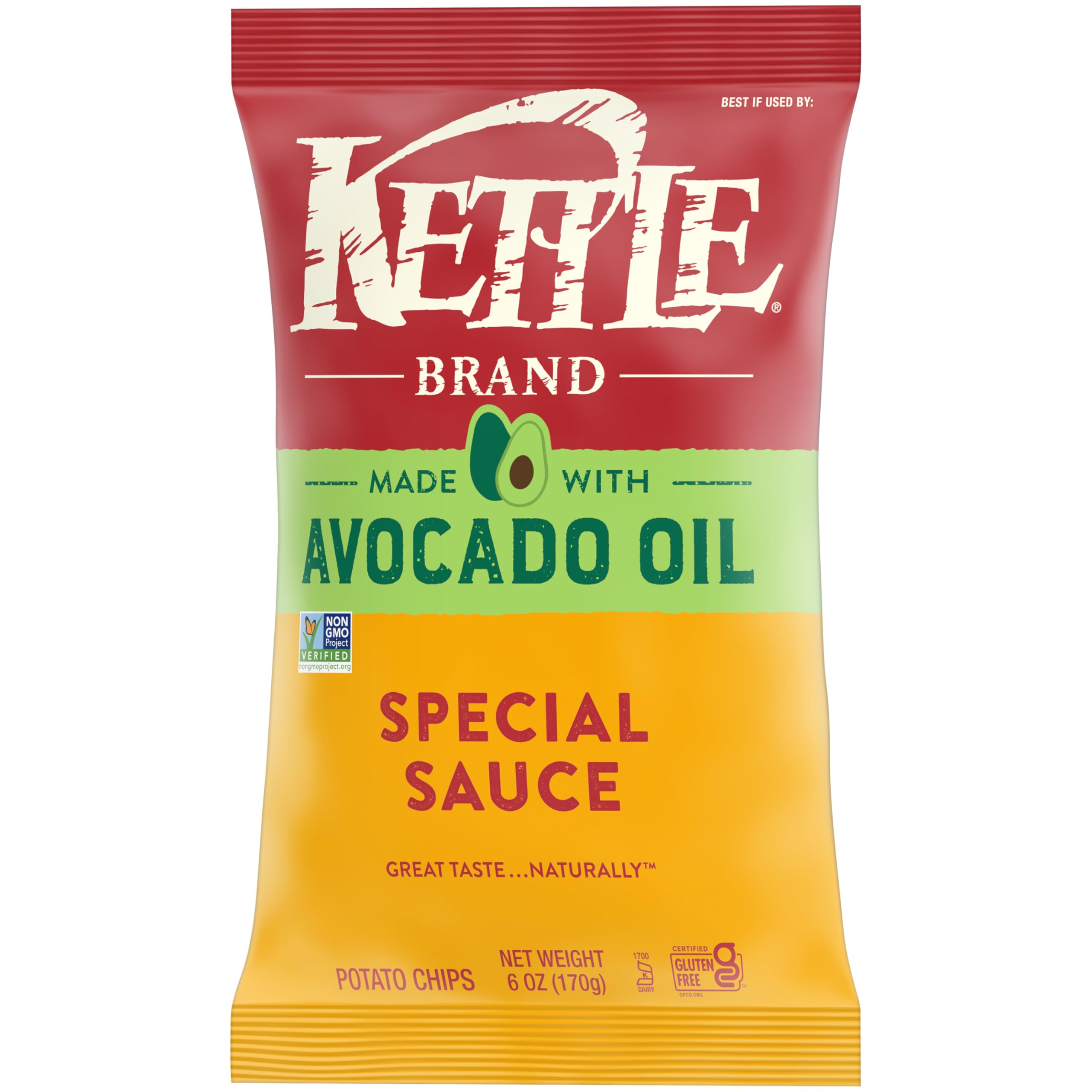 Open a bag of Kettle Brand Made with Avocado Oil Special Sauce Chips and get a burst of flavor in every bite. A unique blend of ingredients and spices create a Special Sauce flavor that's hard to describe and impossible to resist. Boldly flavorful with a hearty crunch, these kettle chips use the whole potato, peel and all. Gluten free and made with non-GMO ingredients. Great taste...naturally