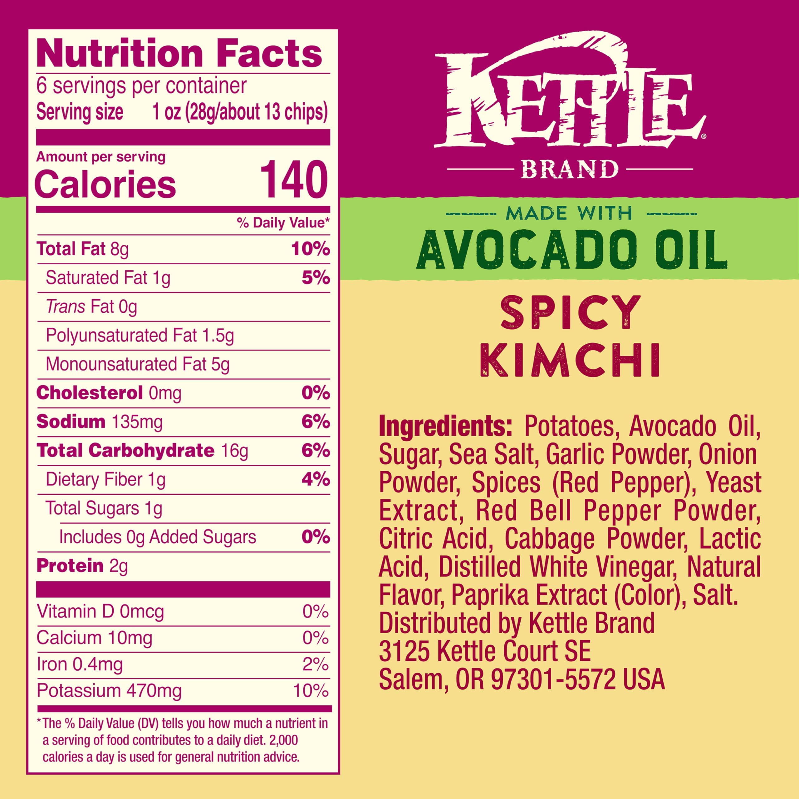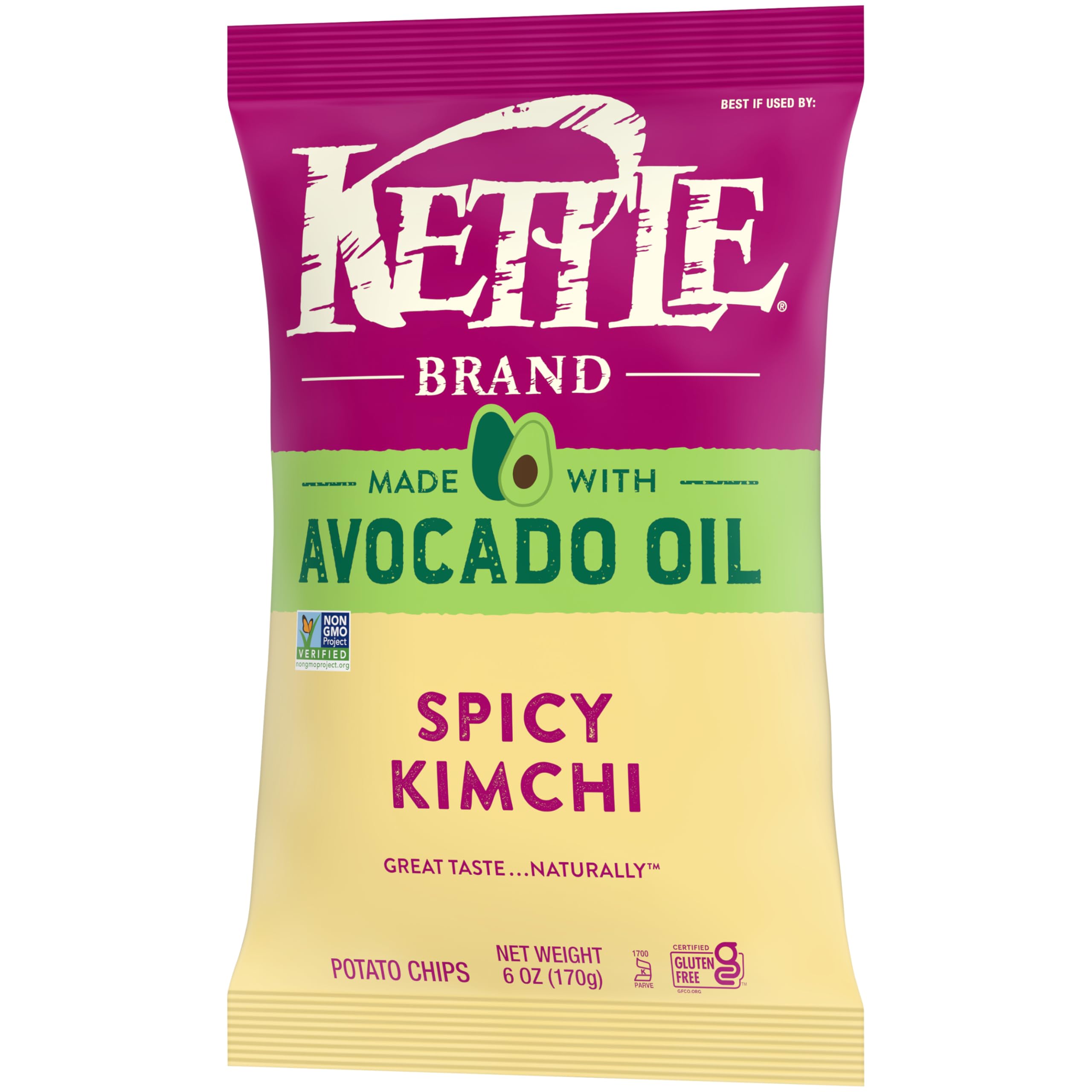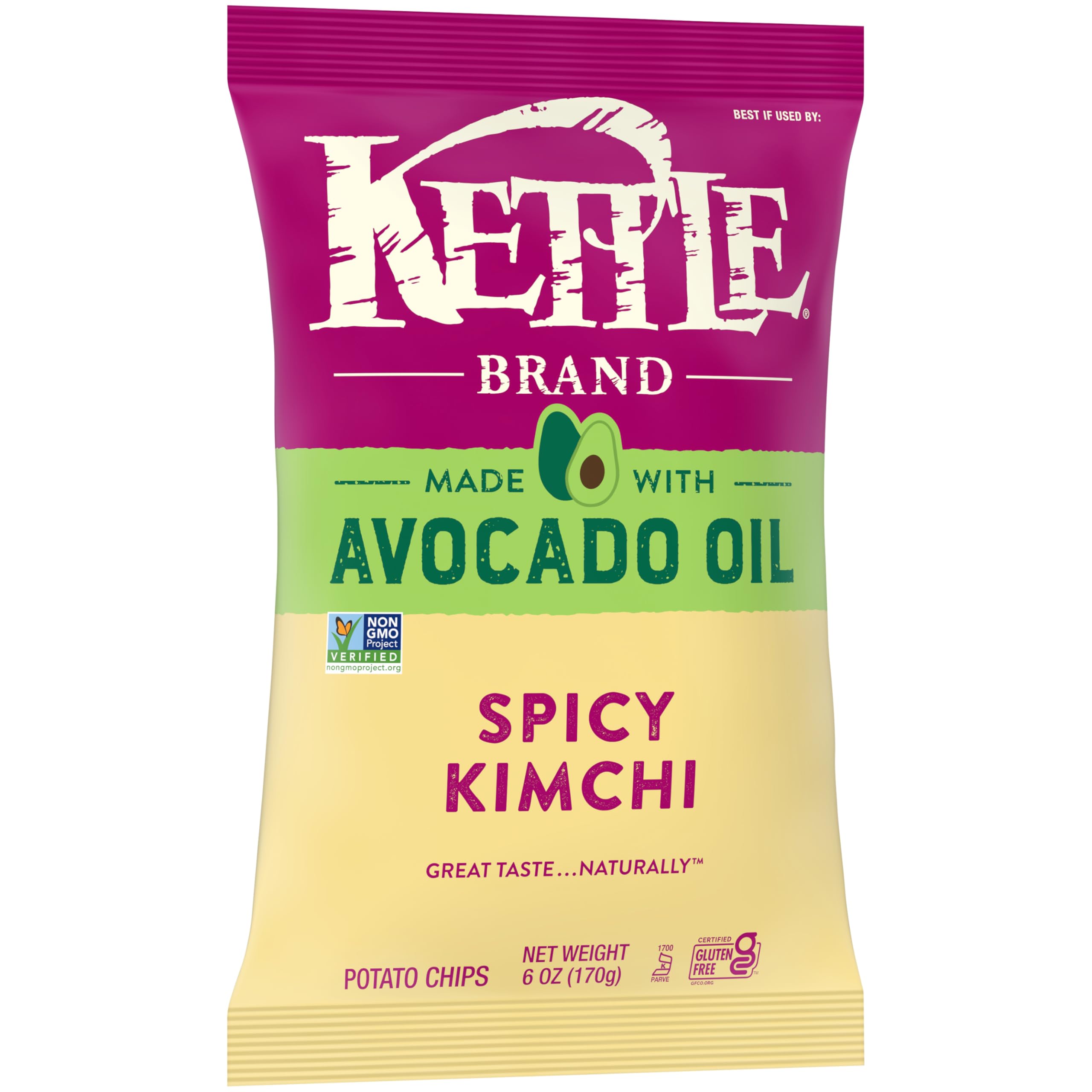 Open a bag of Kettle Brand Made with Avocado Oil Spicy Kimchi Chips and get a burst of savory heat in every bite. The traditional flavors of spicy kimchi create a unique snacking experience that is simply delicious. Boldly flavorful, every bite of these potato chips is packed with heat and crunch. Gluten free and made with non-GMO ingredients. Great taste...naturally