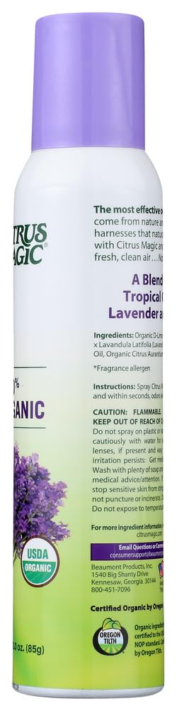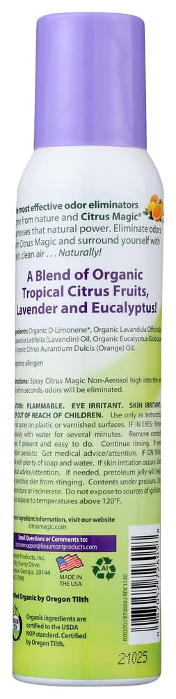 Citrus Magic Air Freshener Lavender Eucalyptus Organic, The most effective odor eliminators come from nature and Citrus Magic harnesses that natural power. Eliminate odors on contact with Citrus Magic Odor Eliminating Air Freshener Sprays. Using 100% Active ingredients made from pure and natural citrus oils, Citrus Magic sprays last up to 4X longer than conventional air fresheners that are mostly made of water, gas and a little perfume. One spray of Citrus Magic and you will instantly notice the difference! Our 3.5 fl. oz. size is perfect for tackling even the largest odors around the home.