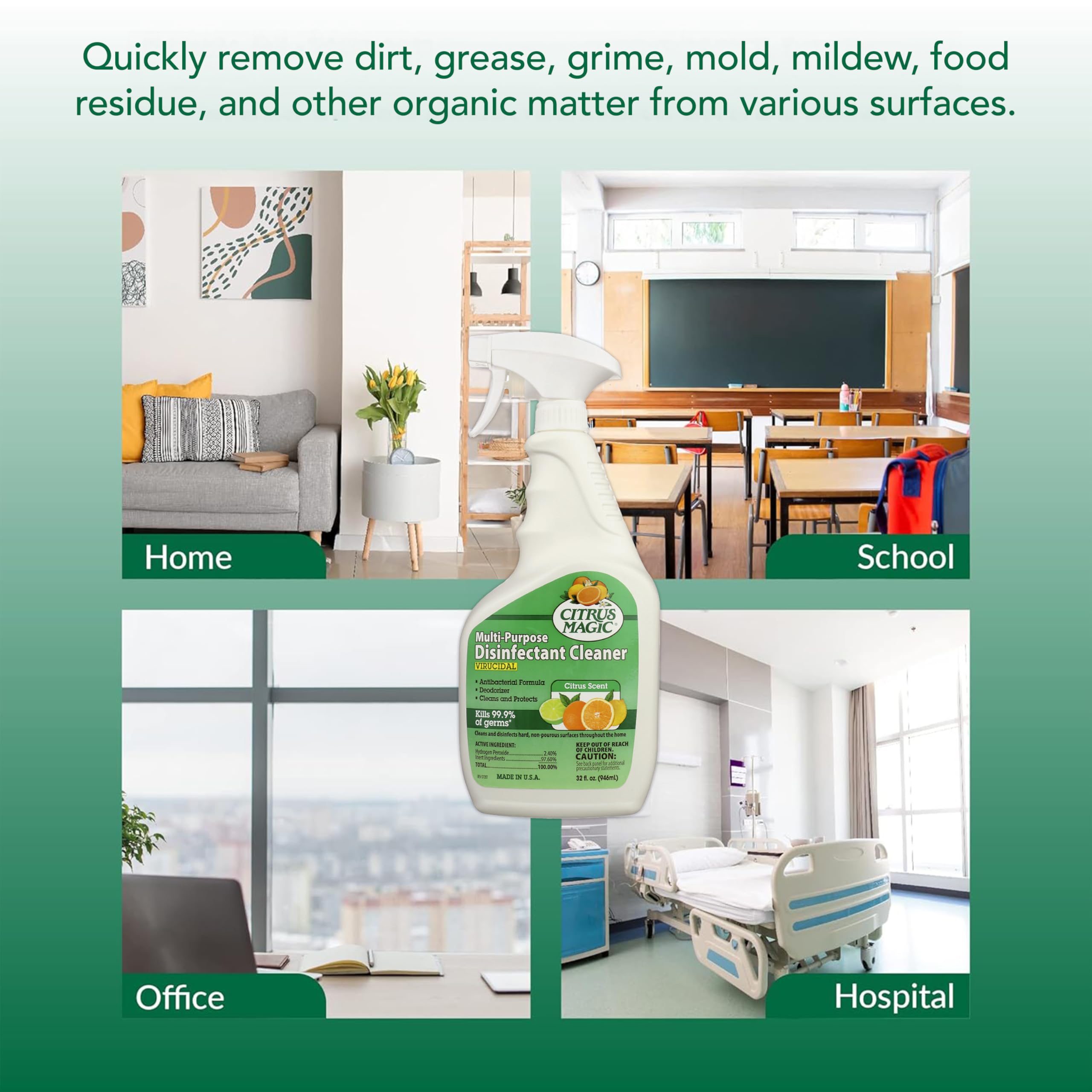 Citrus Magic Multi-Purpose Disinfectant Cleaner is a combination cleaner and disinfectant that provides hospital disinfection on hard, non-porous surfaces. With a fresh, Citrus Scent, it is EPA-registered (EPA Reg. No. 85837-4-68939) to disinfect while you clean and leaves your home and other high-touch areas smelling fresh with a streak-free shine. It is uniquely formulated with the power of hydrogen peroxide. The antibacterial cleaning action of Citrus Magic Multi-Purpose Disinfectant Cleaner cuts cleaning time as it cleans, disinfects, and deodorizes surfaces by killing odor-causing microorganisms and prevents the growth of mold and mildew. It quickly removes dirt, grease, grime, mold, mildew, food residue, blood, and other organic matter commonly found in and around the home, hospitals, and health care facilities. With a trigger sprayer designed for easy and frequent use, the non-abrasive formula is designed for use on hard, non-porous surfaces: plated or stainless steel, aluminum, chrome, glazed porcelain, glazed tile, laminated surfaces associated with floors, walls, countertops, cages, crates, kennels, and animal equipment.