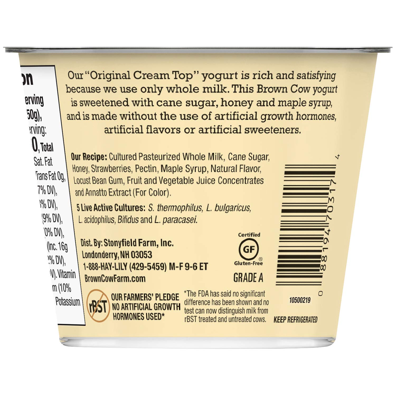 Yogurt Cream Top Strawberry. This product has No Artificial Ingredients. Freezing/chilling Temperatures of the product is chilled: 33 to 38 degrees. This product is manufactured in United States.