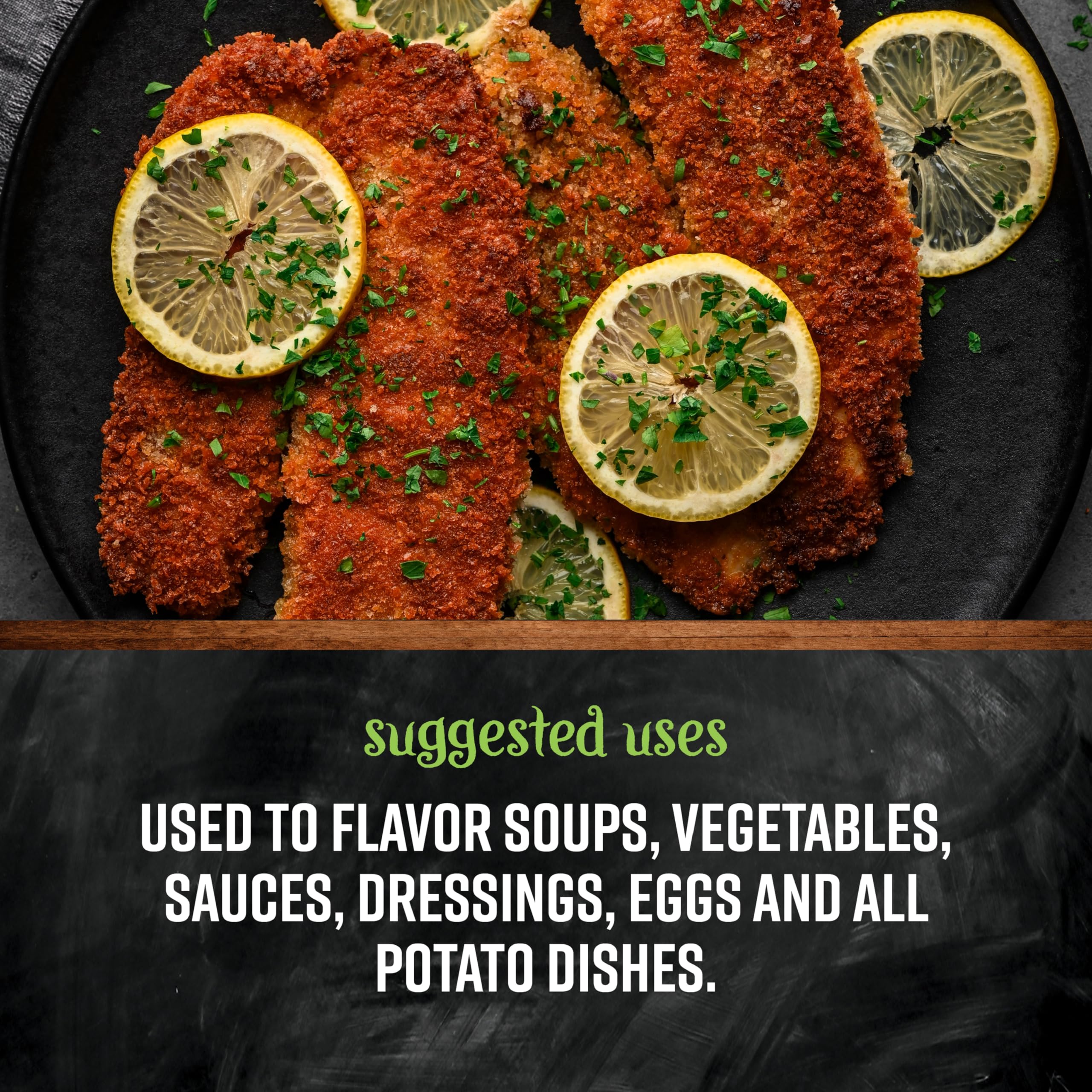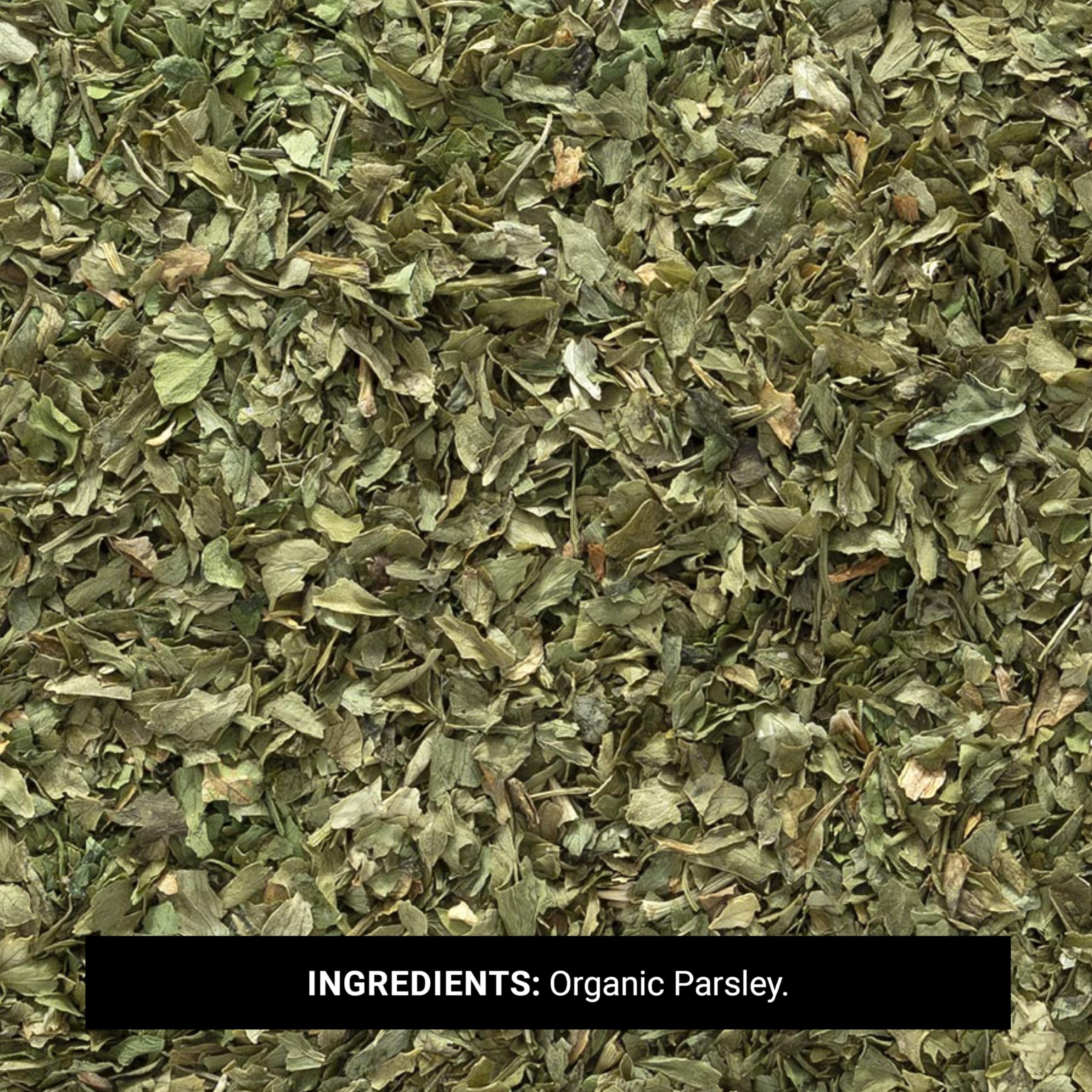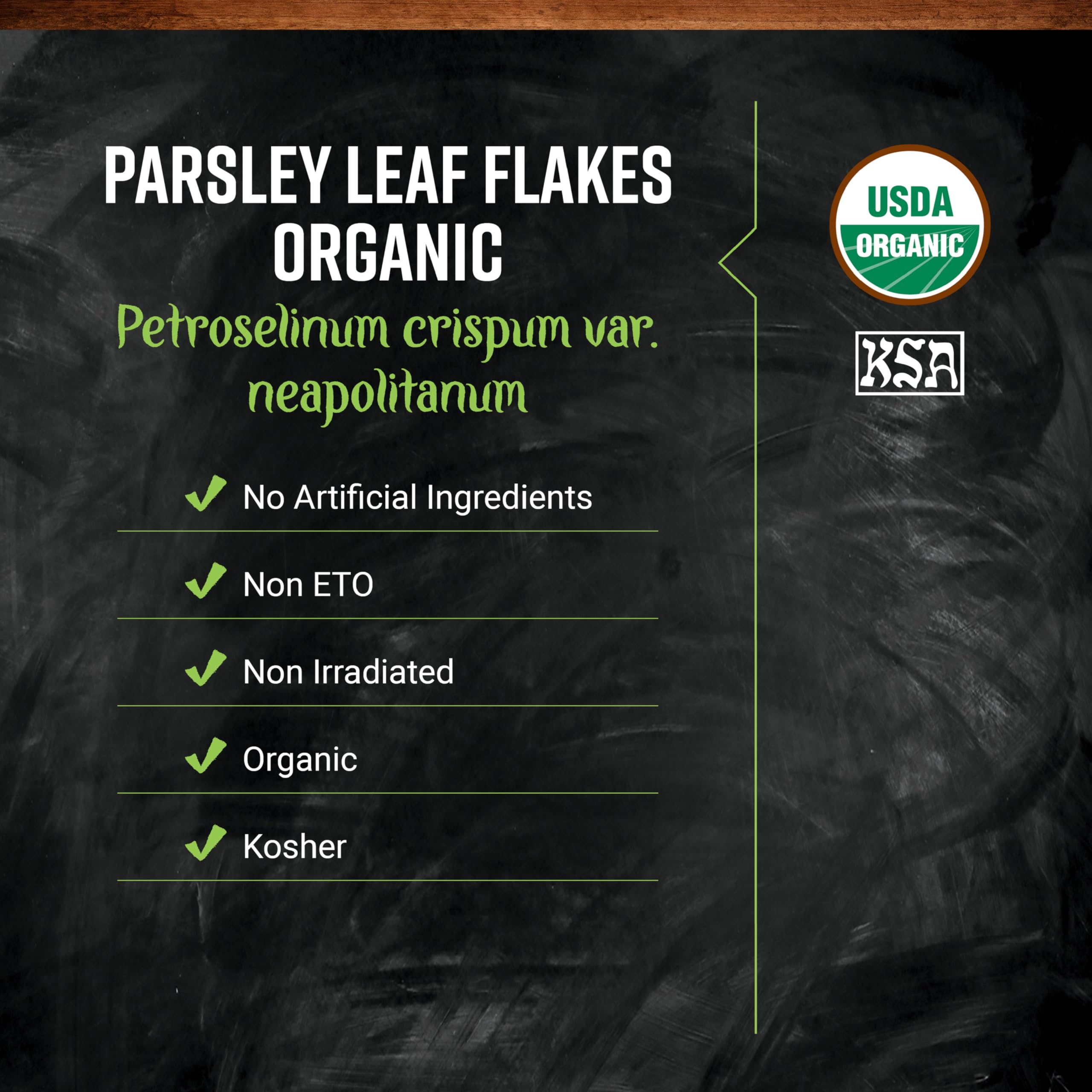 FEATURES 1 pound bulk bag (16 ounces) Organic certified, Kosher certified, non-irradiated Bright colored with a mild, fresh flavor Enriches soups, sauces, dressings, and more Botanical name: Petroselinum crispum var. neapolitanum