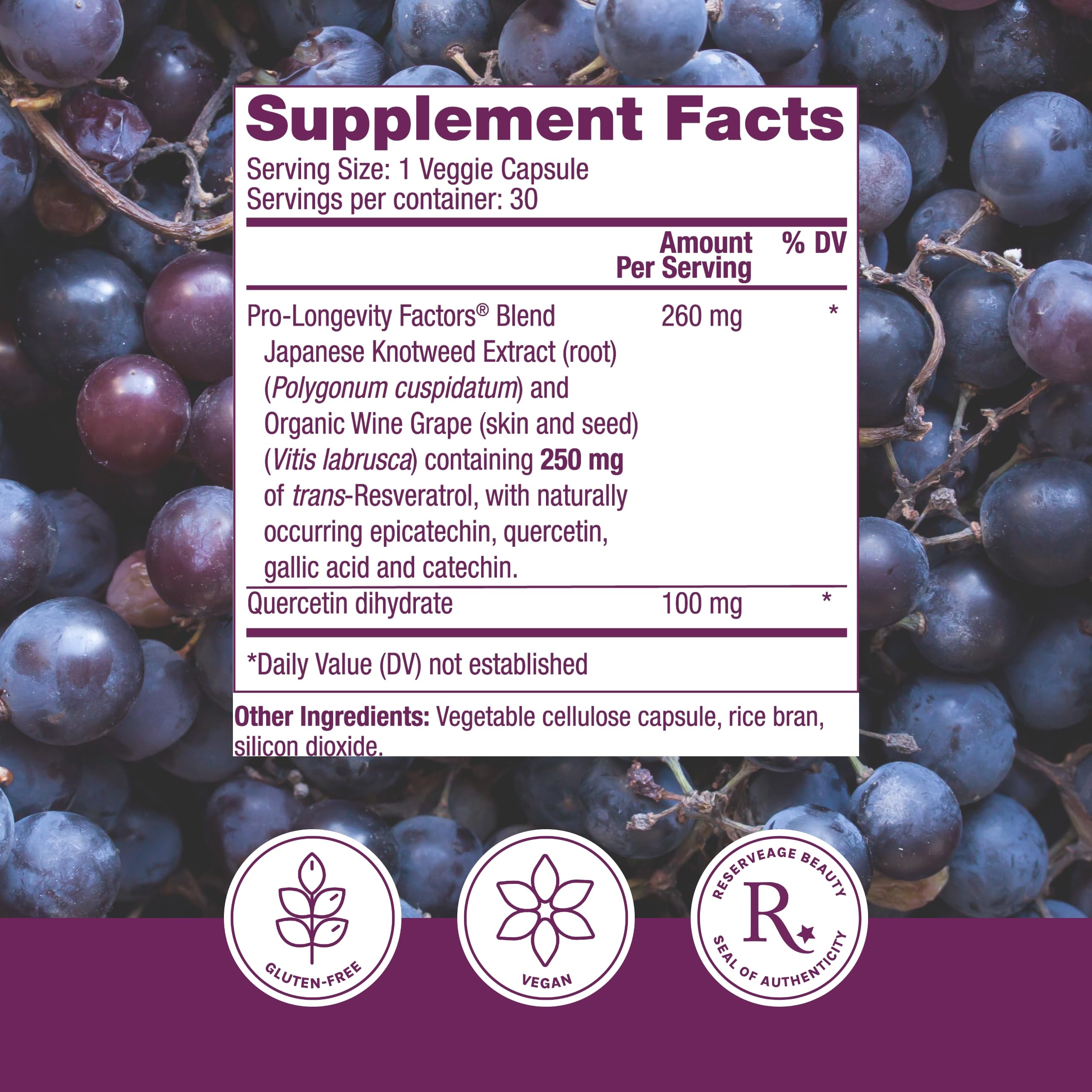 Reserveage Beauty Resveratrol 250 mg - Best Trans-Resveratrol - Vegan Antioxidant Supplement for Cellular & Heart Health - Aids Healthy Aging & Immune Health - 30 Vegetable Capsules (30 Servings)