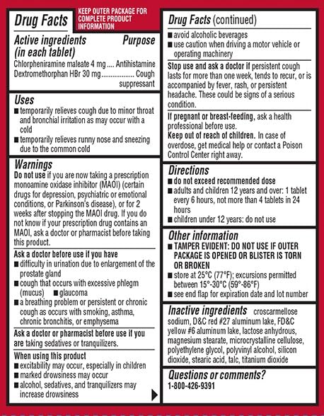 Leader Cough and Cold HBP Medicine 16 Tablets. Temporarily relieves cough due to minor throat and bronchial irritation as may occur with a cold. Temporarily relieves runny nose and sneezing due to the common cold. Active ingredients (in each tablet): Chlorpheniramine maleate 4 mg, Dextromethorphan HBr 30 mg. NDC Code(s): 70000-0324-1