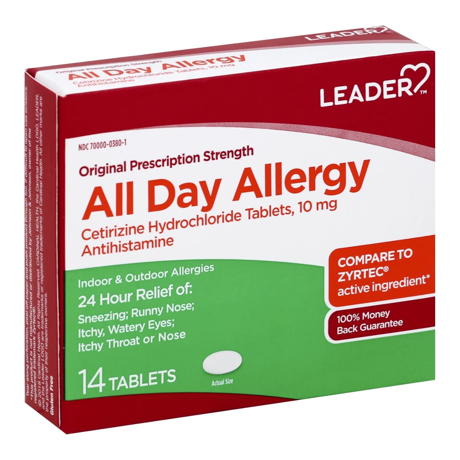 Leader All Day Allergy Cetirizine 10mg tablets, 14ct. Temporarily relieves these symptoms due to hay fever or other upper respiratory allergies. Active ingredient (in each tablet): Cetirizine HCl 10 mg. NDC Code(s): 70000-0380-1