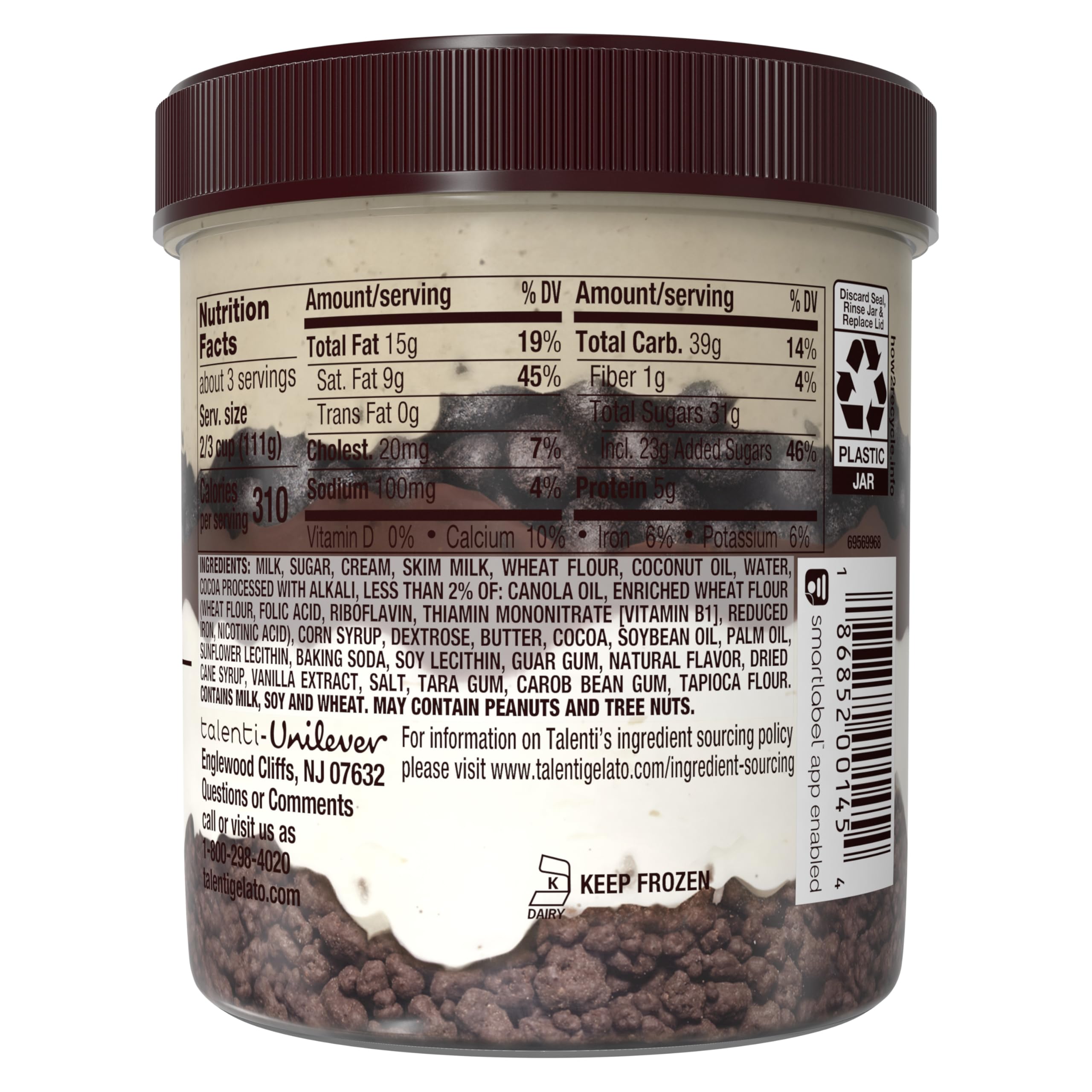 5 Layers: Cookies & cream gelato, chocolate cookies, dulce de leche, vanilla gelato, cookie crumbs. Non-GMO. All ingredients in this product have been evaluated by Where Food Comes From, Inc., to our Non-GMO policy. Learn more at www.talentigelato.com/nongmo. talentigelato.com. how2recycle.info. App enabled. SmartLabel. Questions or Comments call or visit us at 1-800-298-4020; talentigelato.com.