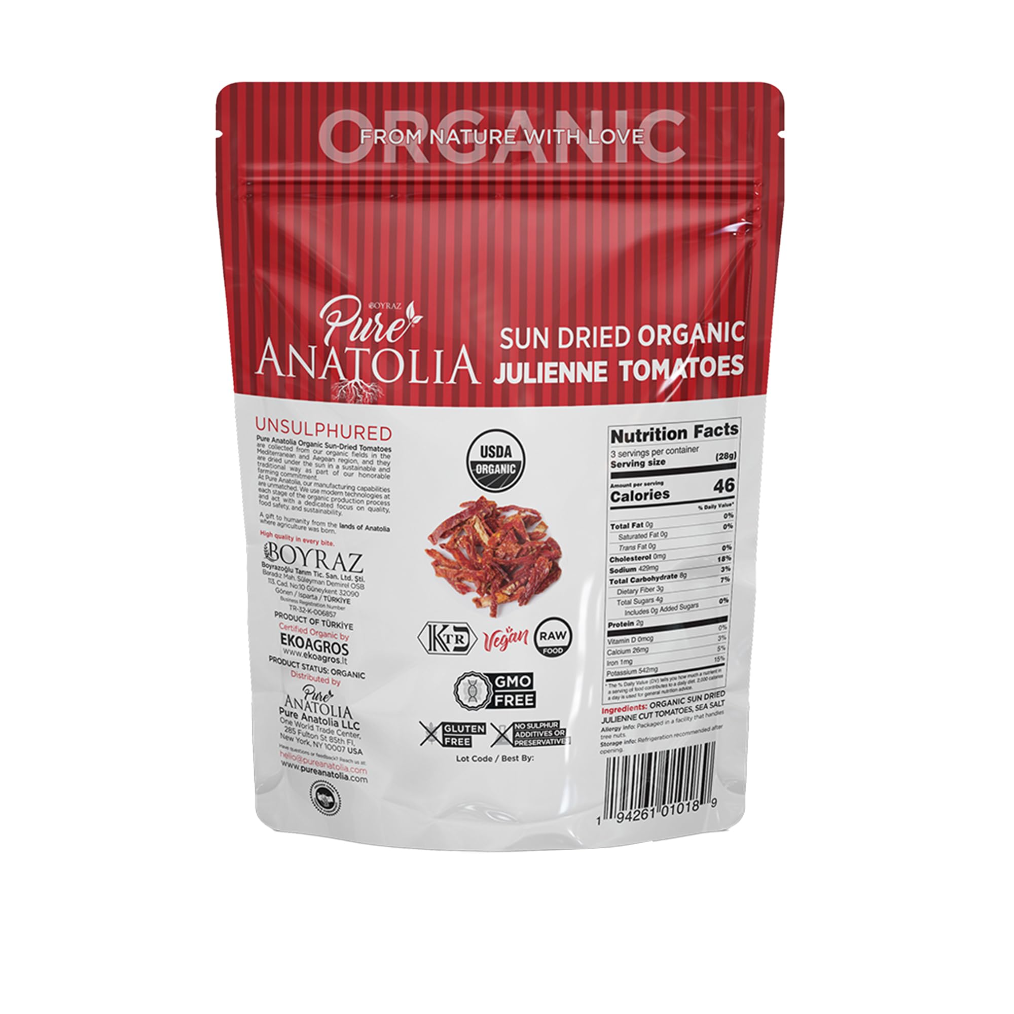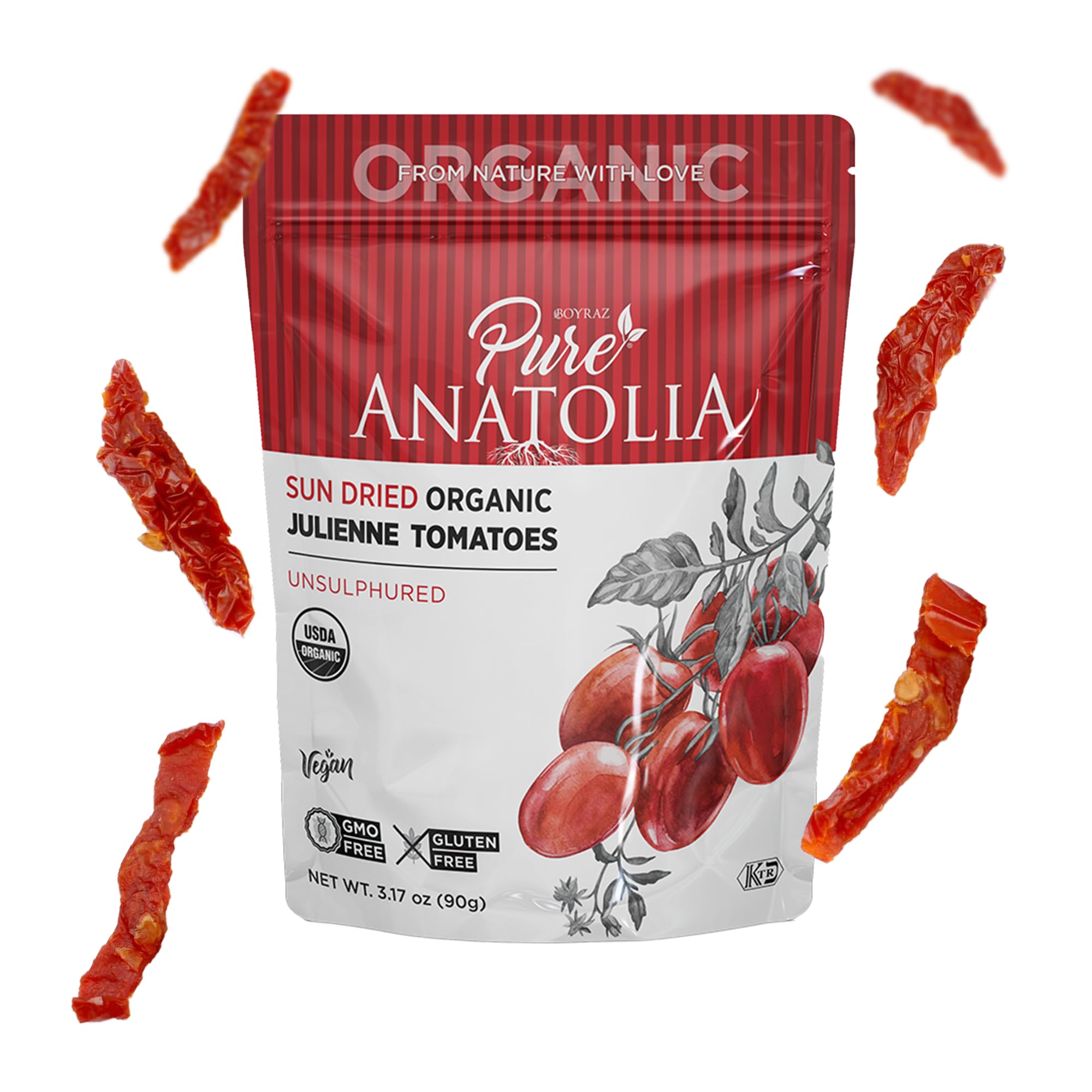 Pure Anatolia Organic Sun Dried Tomatoes Halves Cut - Dry Packed Sundried Tomatoes - No Sugar Added, Non GMO, Gluten Free, Vegan, No Preservatives - 3.17 oz Resealable Bag
