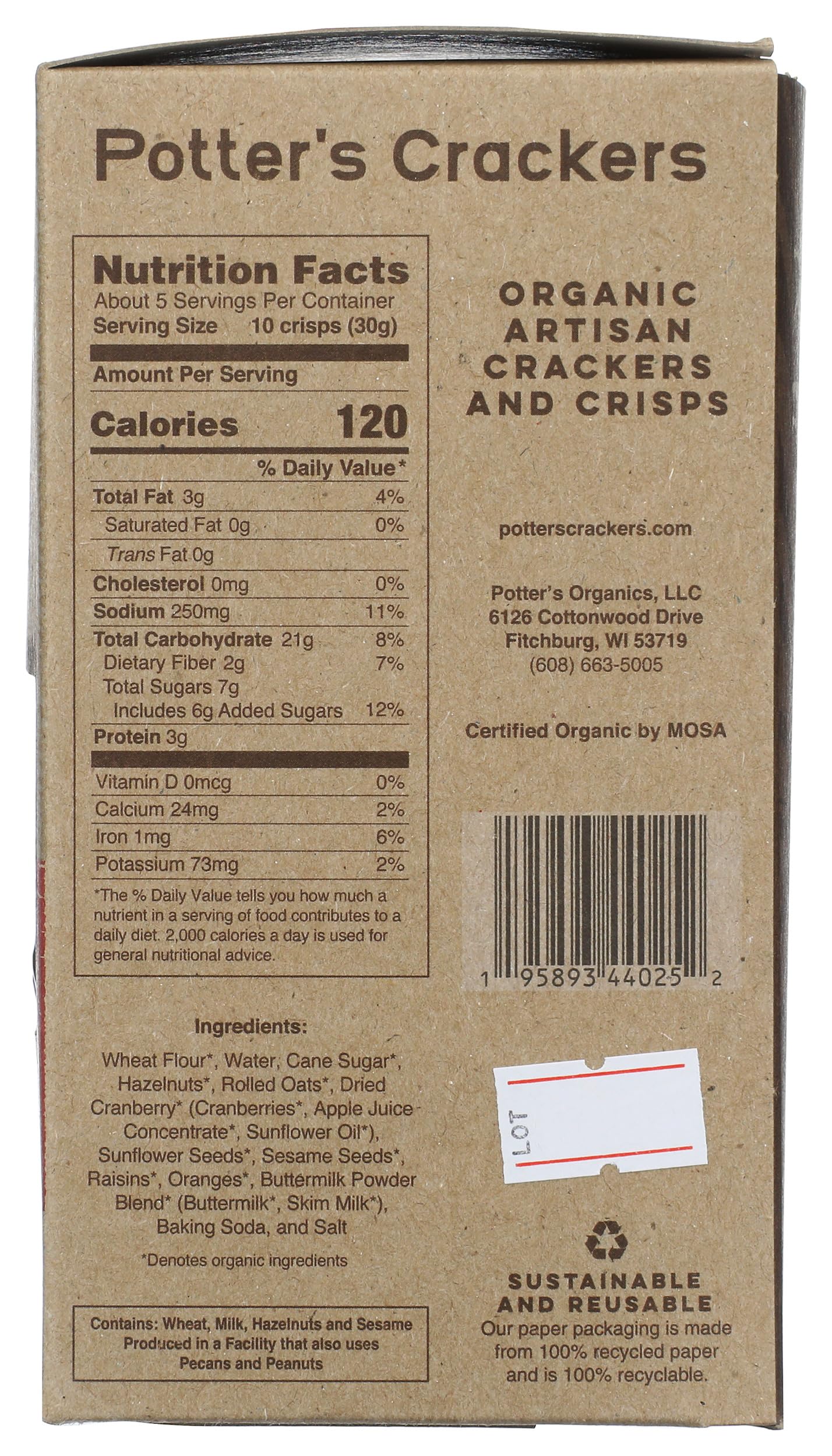Potter's Crackers, Crisp Cranberry Hazelnut, 5.3 Ounce