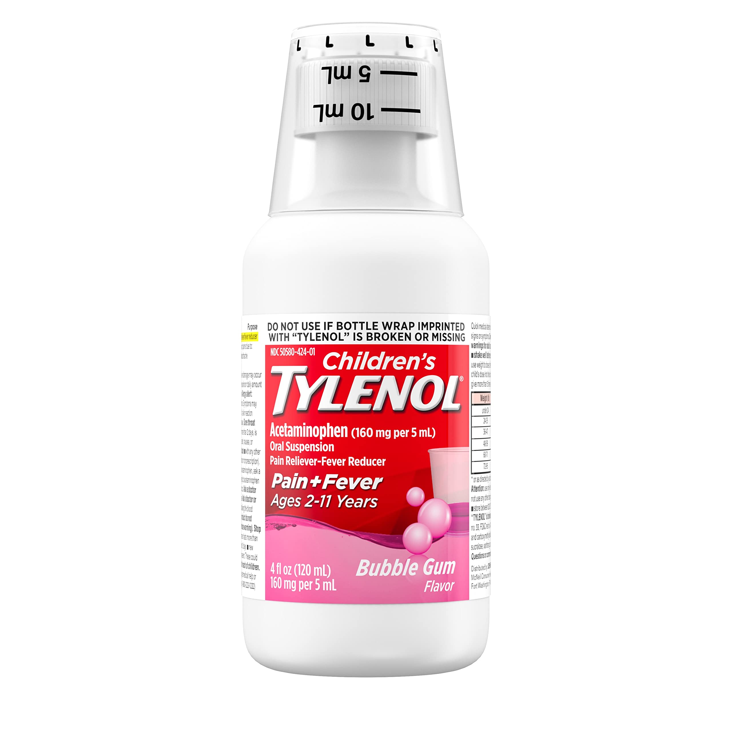 Intended for kids ages 2 to 11 years, Children's Tylenol Oral Suspension Medicine provides temporary relief from a range of cold and flu symptoms, including minor aches and pains, headache and sore throat. Each 5-milliliter dose of this kids' pain relief medicine contains 160 milligrams of the pain reliever and fever reducer acetaminophen to temporarily reduce fever and help relieve minor aches and pains due to the common cold, flu, sore throat, headache, and toothache. This children's cold & flu symptom medicine also comes in a kid-friendly bubble gum flavor and is ibuprofen-, aspirin- and alcohol-free, and is gentle on the tummy. From the #1 pediatrician recommended brand for pain & fever relief, Tylenol has been used by parents for over 60 years.